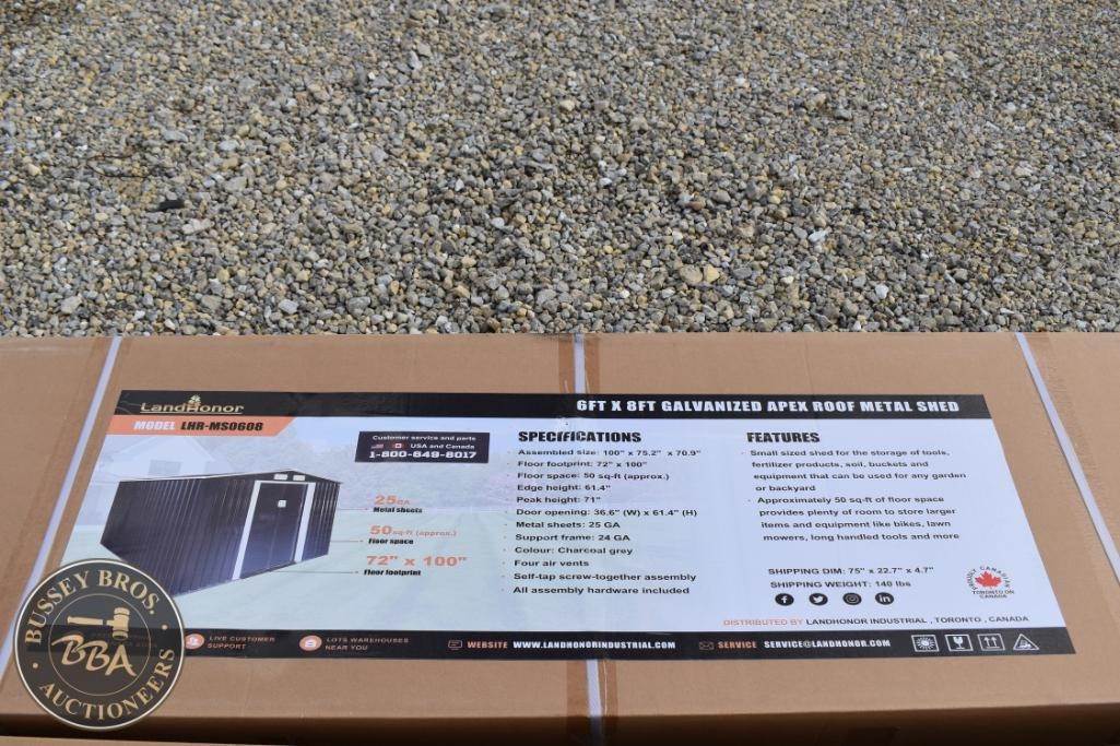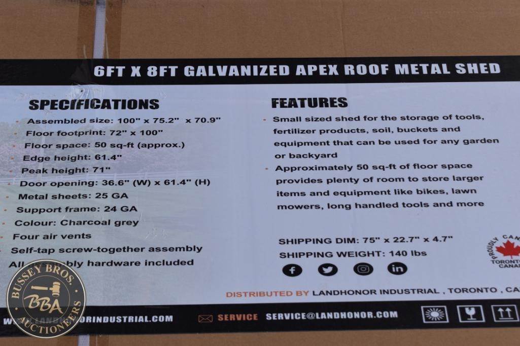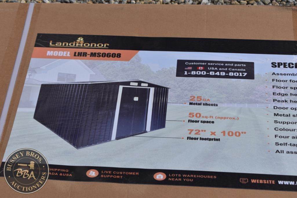 Landhonor LHR-MS0608 Galvanized Metal Shed, 6ft x 8ft, Charcoal Grey, exterior dimensions: 100" x 72" x 84", floor space: 50 sq. ft., door opening: 36.6" x 62.2", metal thickness: 25 GA, roof panel thickness: 24 GA, features four air vents