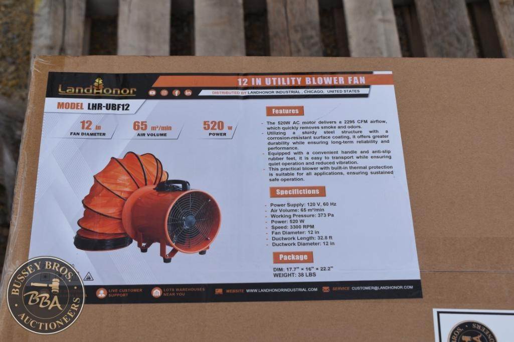 LandHonor LHR-UBF12 Utility Blower Fan, 12" fan diameter, 65 AMP air volume, 110 V, 60 Hz, 3450 RPM speed, 12" x 10M package dimensions, built-in carrying handle, large air output, durable construction
