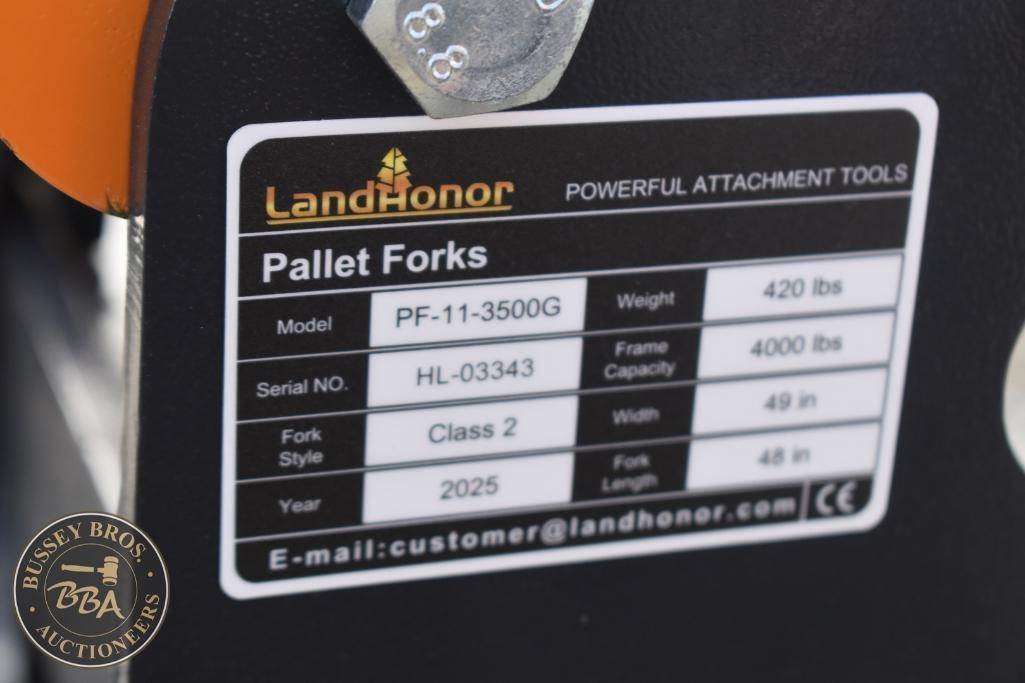 Landhonor Pallet Fork Attachment skid steer mount, with brick guard, 42 inch forks, 4000lb fork rating, SN:HL03343, NEW/UNUSED