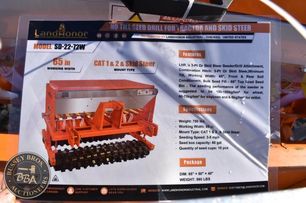 Landhonor Seed Drill skid steer mount, 3pt mount, 65 inch wide, poly seed delivery tubes,, NEW/UNUSED