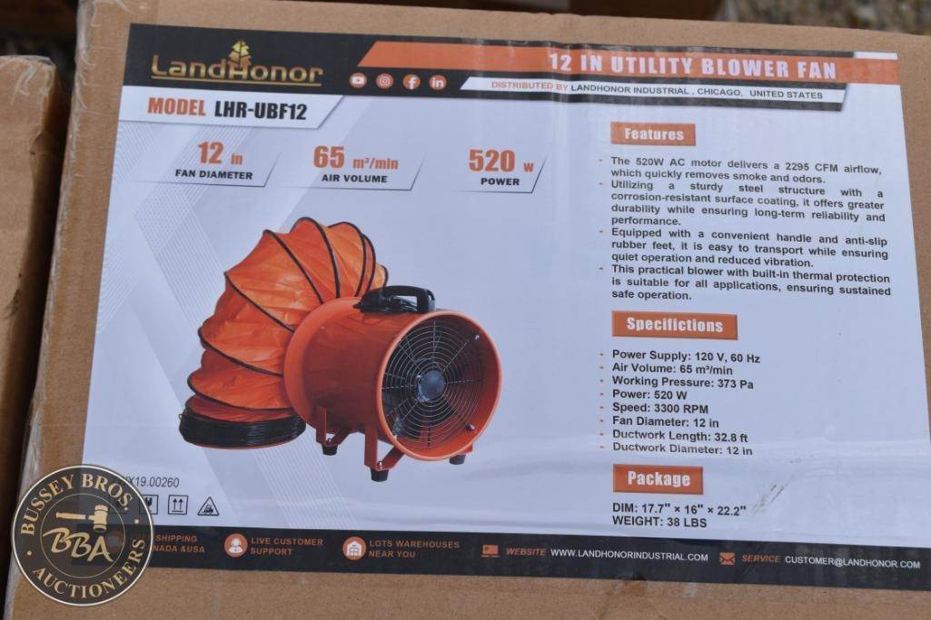 Landonor LH-UBF12 Utility Blower Fan, featuring 520 CFM air volume, 1/6 HP power, 1750 RPM speed, 120 V voltage, 0.7 A current, weight 15 lbs (6.8 kg),