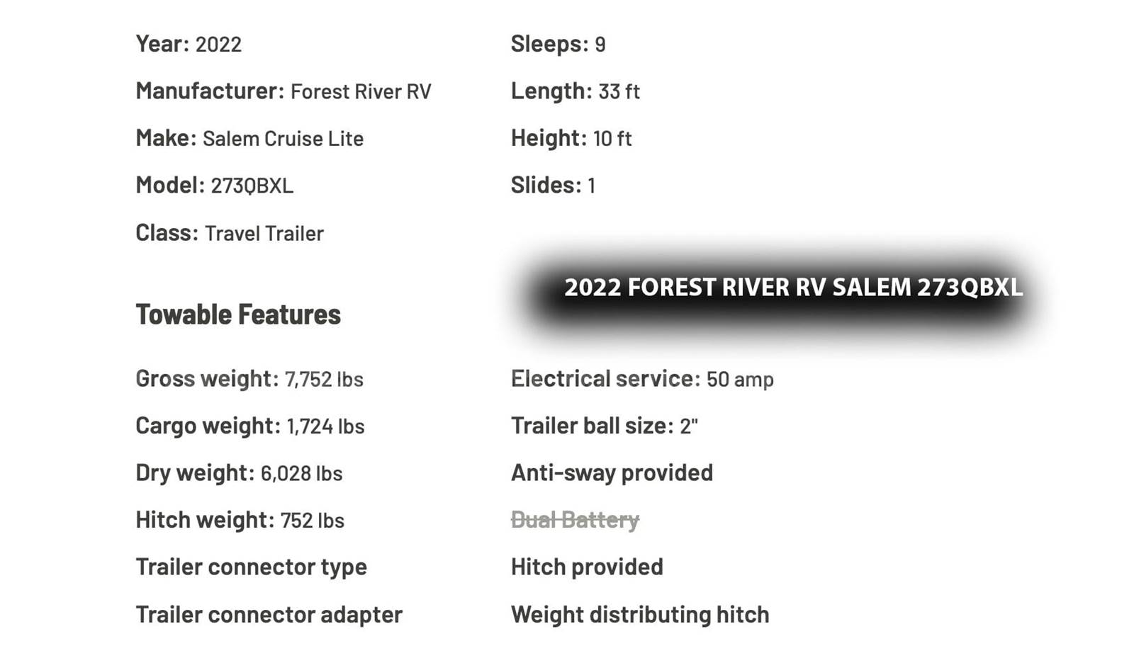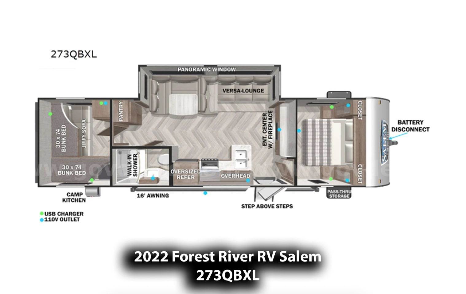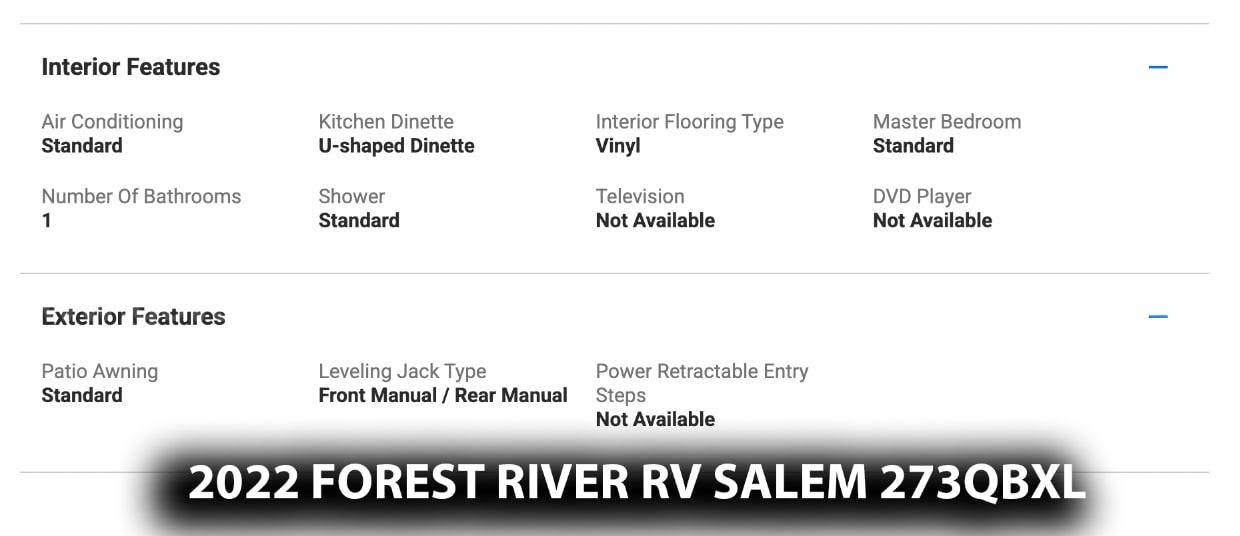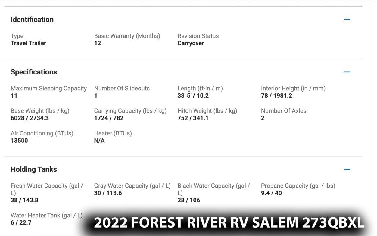 • 2022 Forest River RV Salem 273QBXL Travel Trailer — 33’, 5” in length.