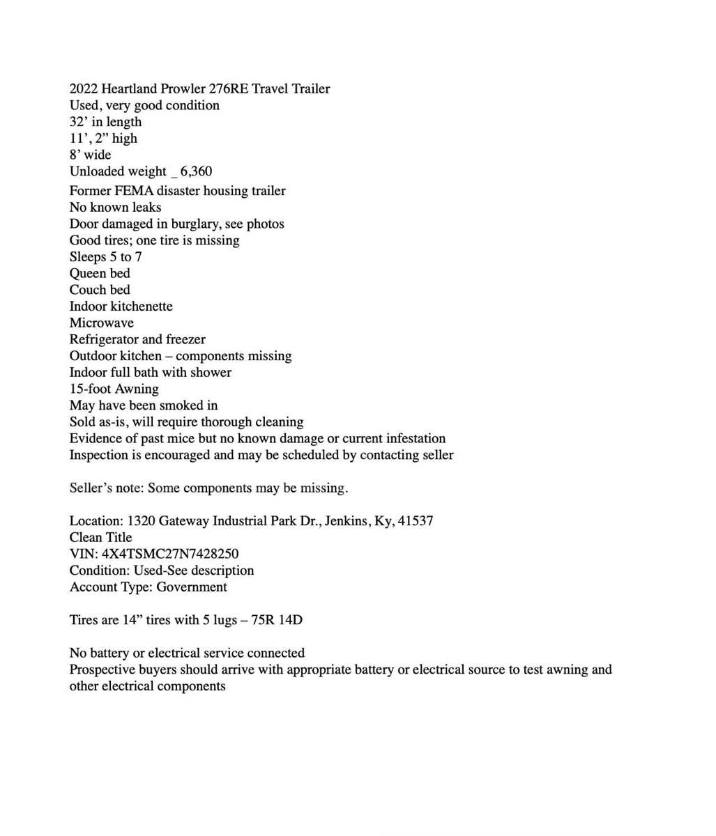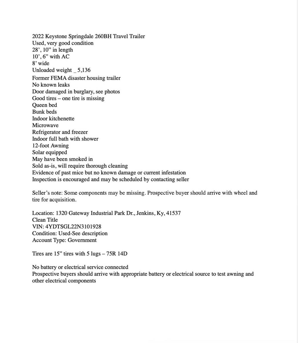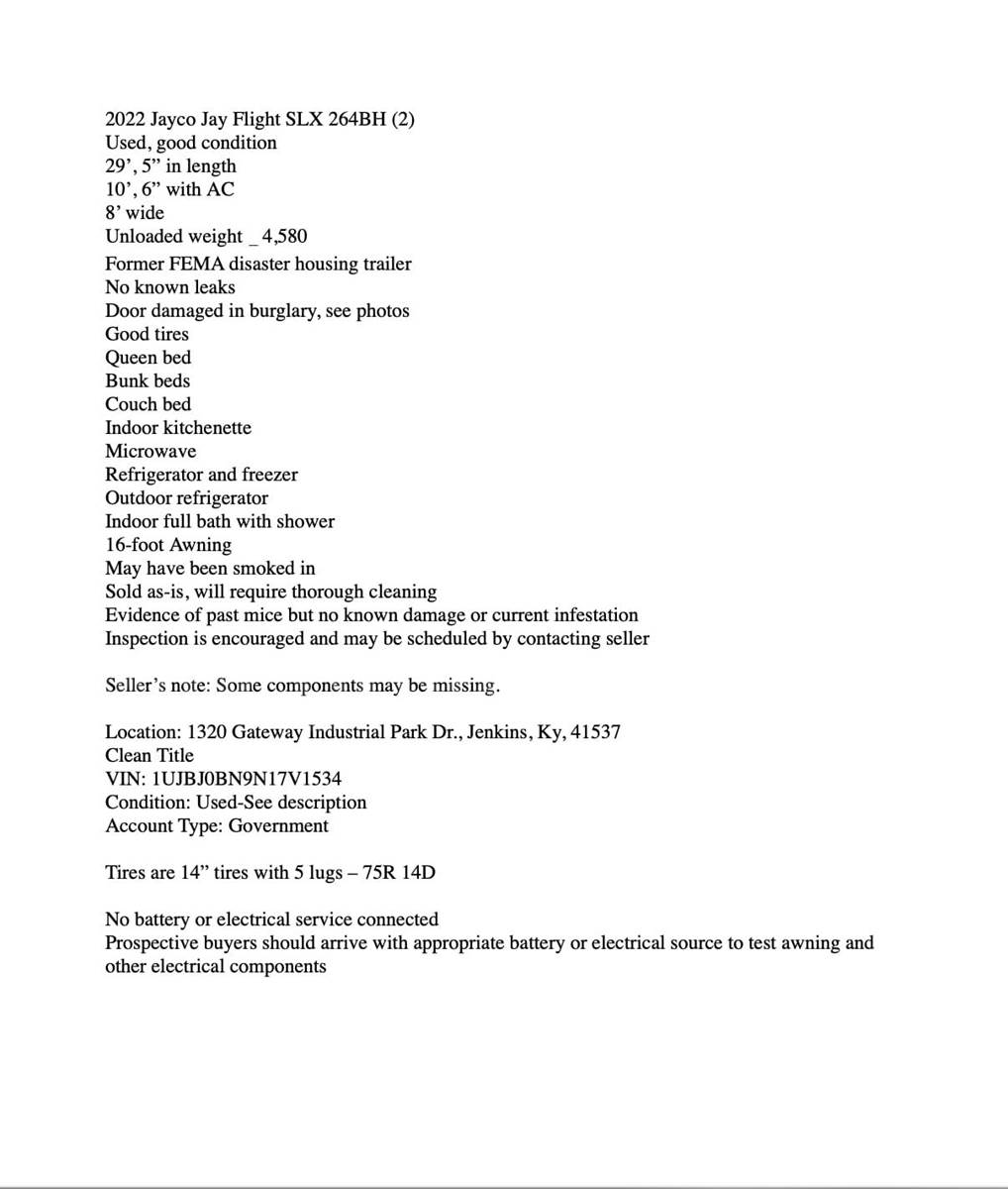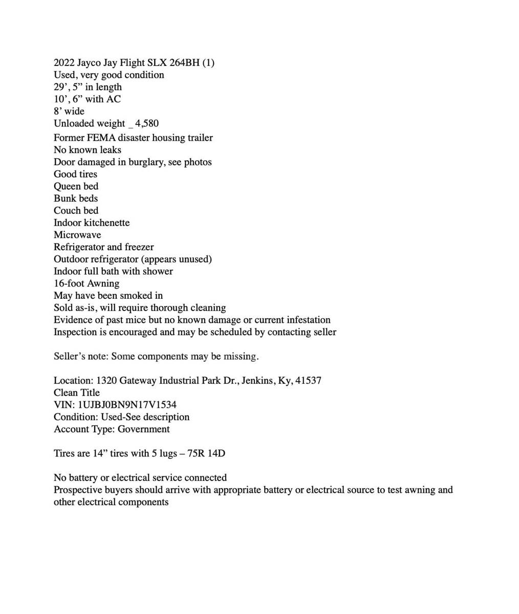 The trailers are former FEMA disaster housing now owned by the City of Jenkins, Ky., and are being offered as a singular lot of 5. Some components may be missing from each trailer.