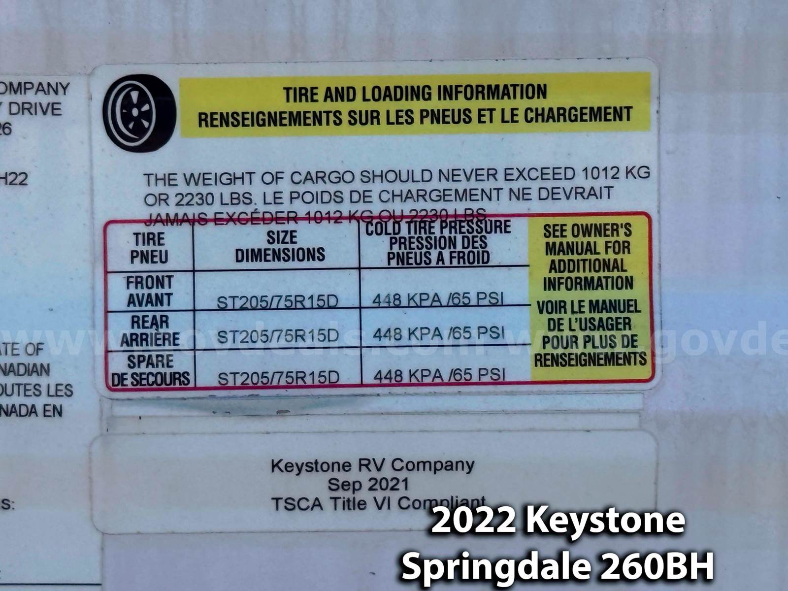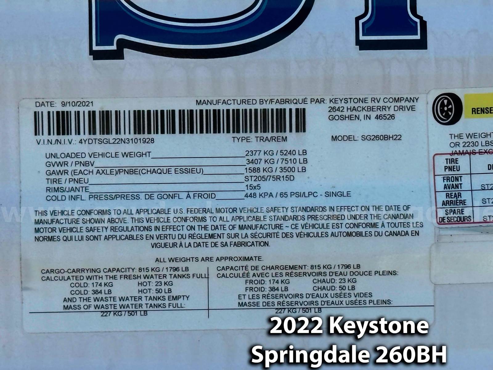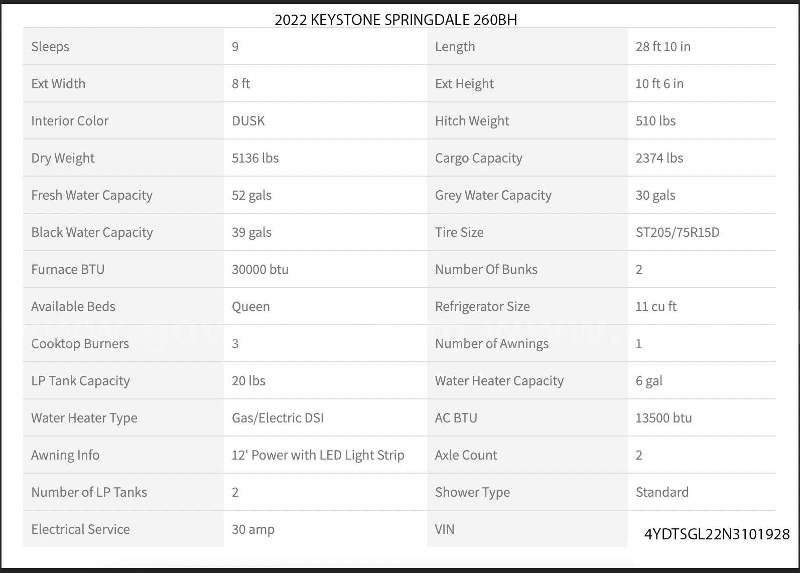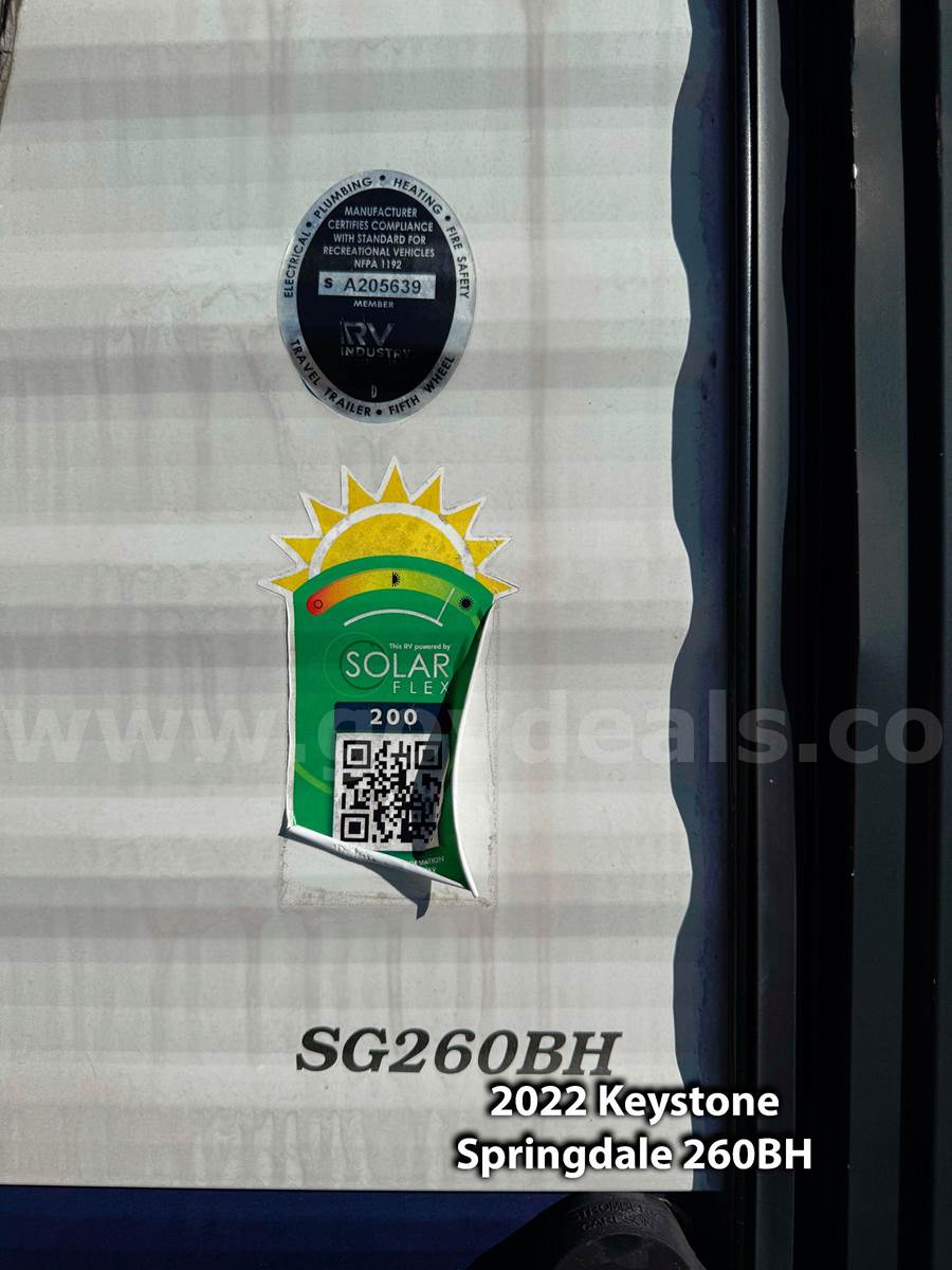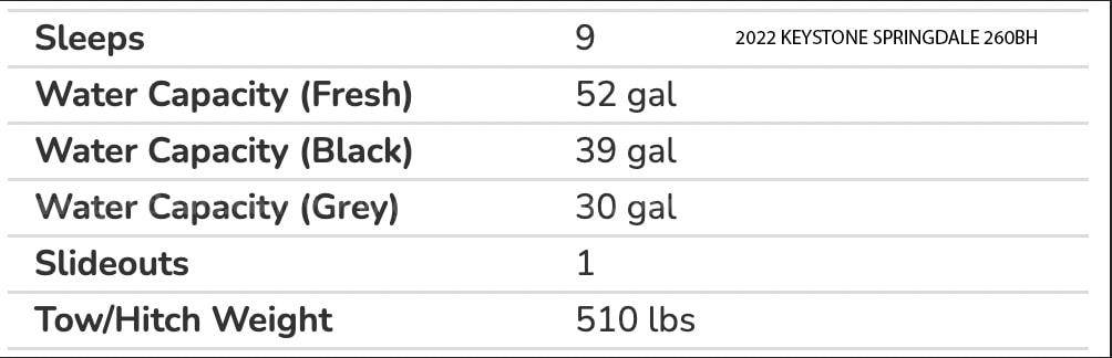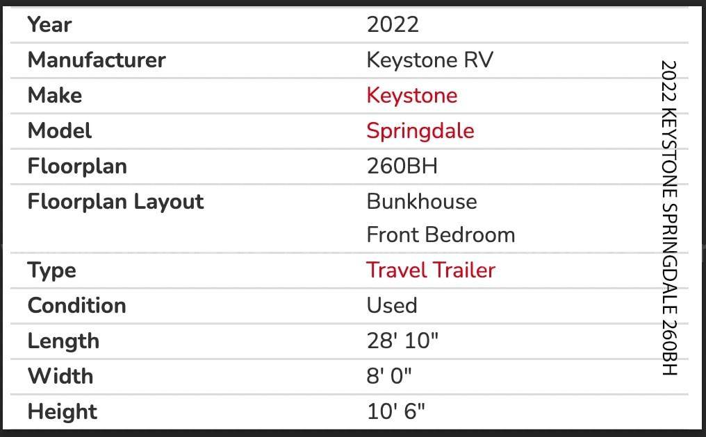 • 2022 Keystone Springdale 260BH Travel Trailer — 28’, 10” in length.