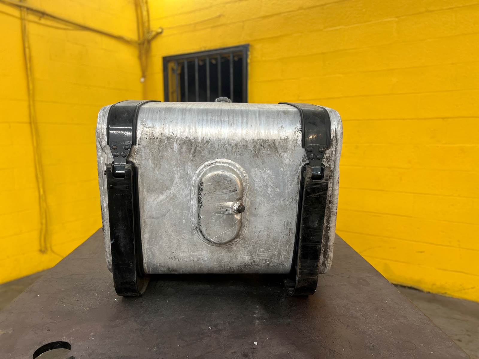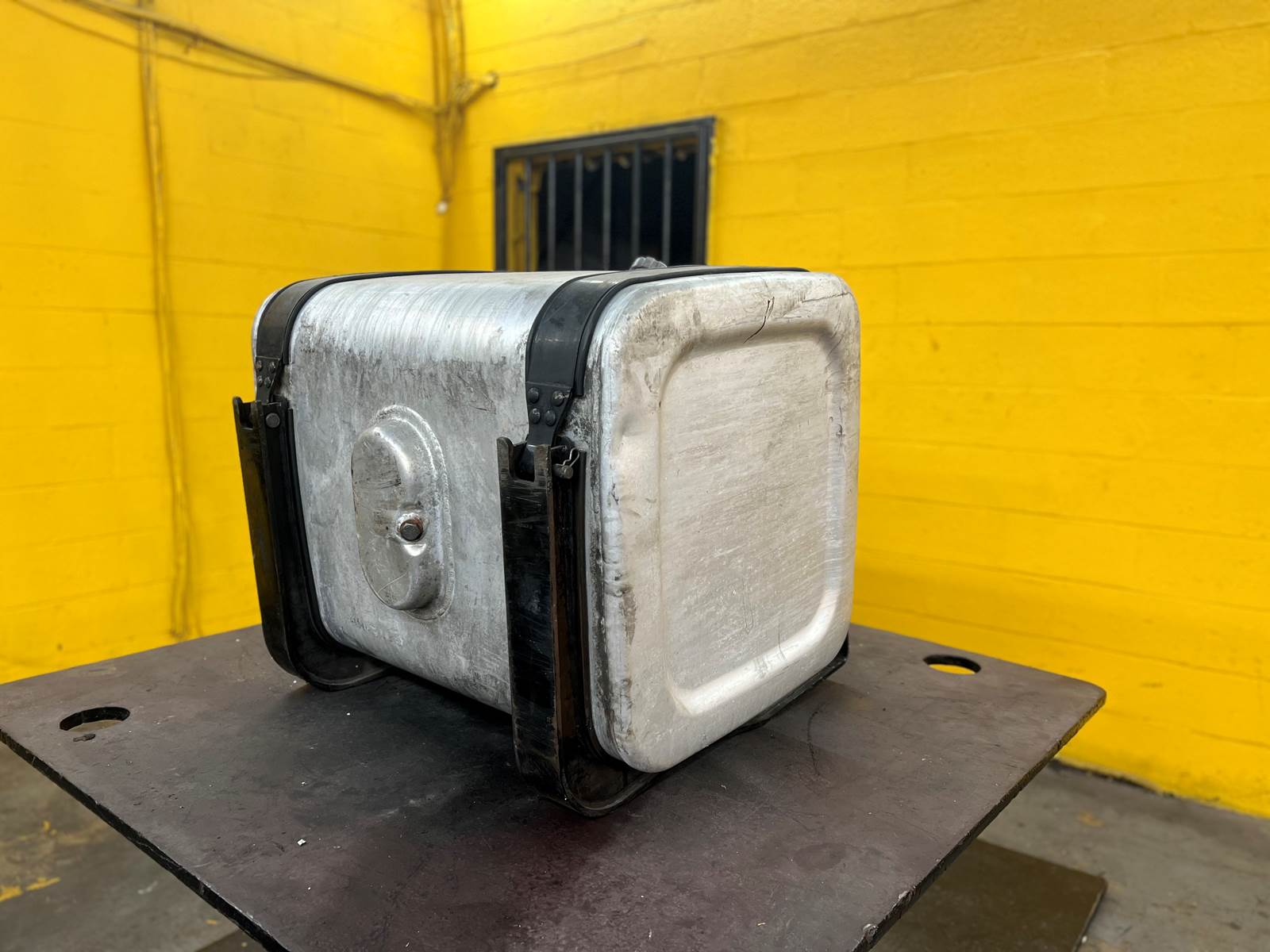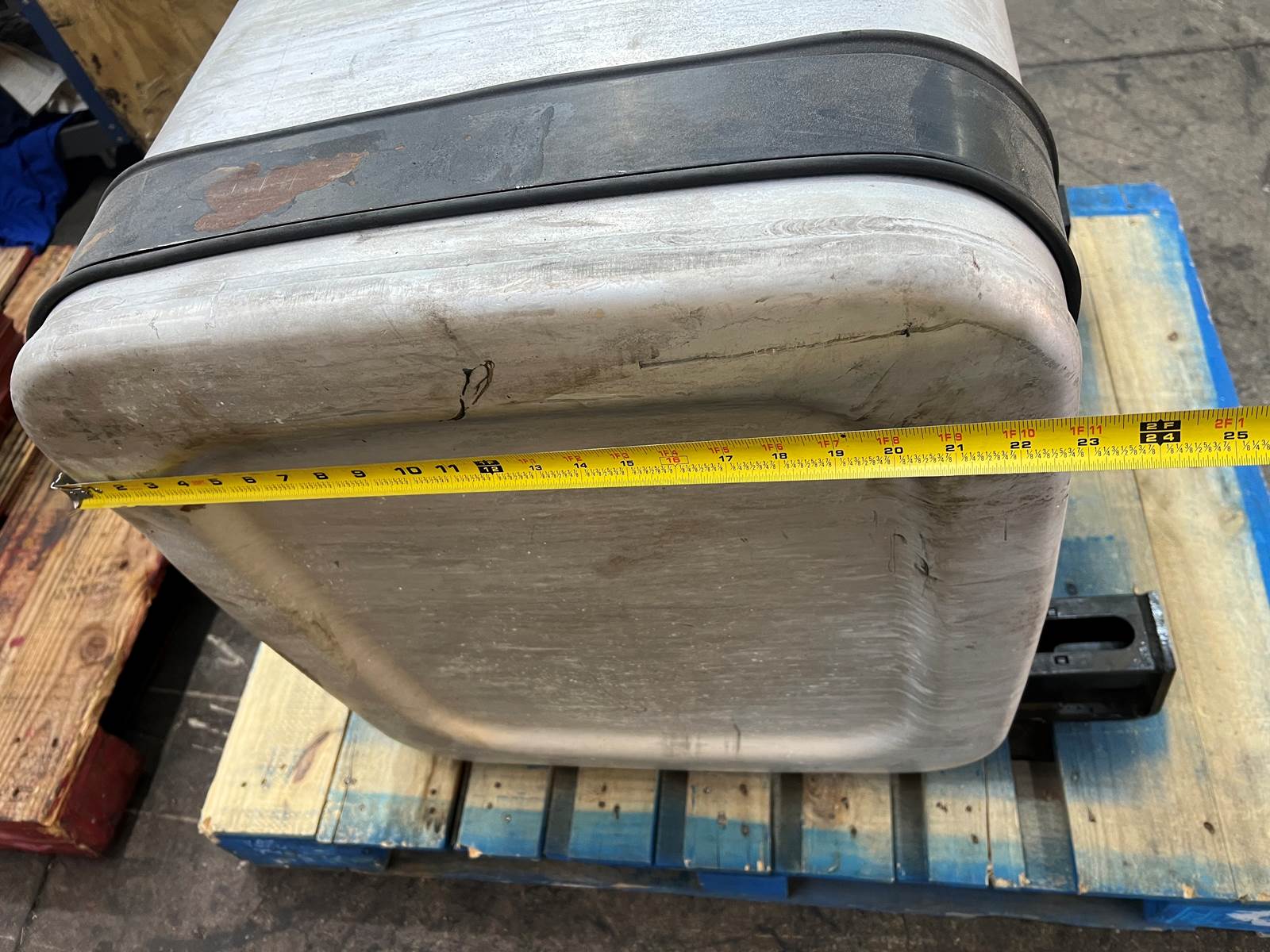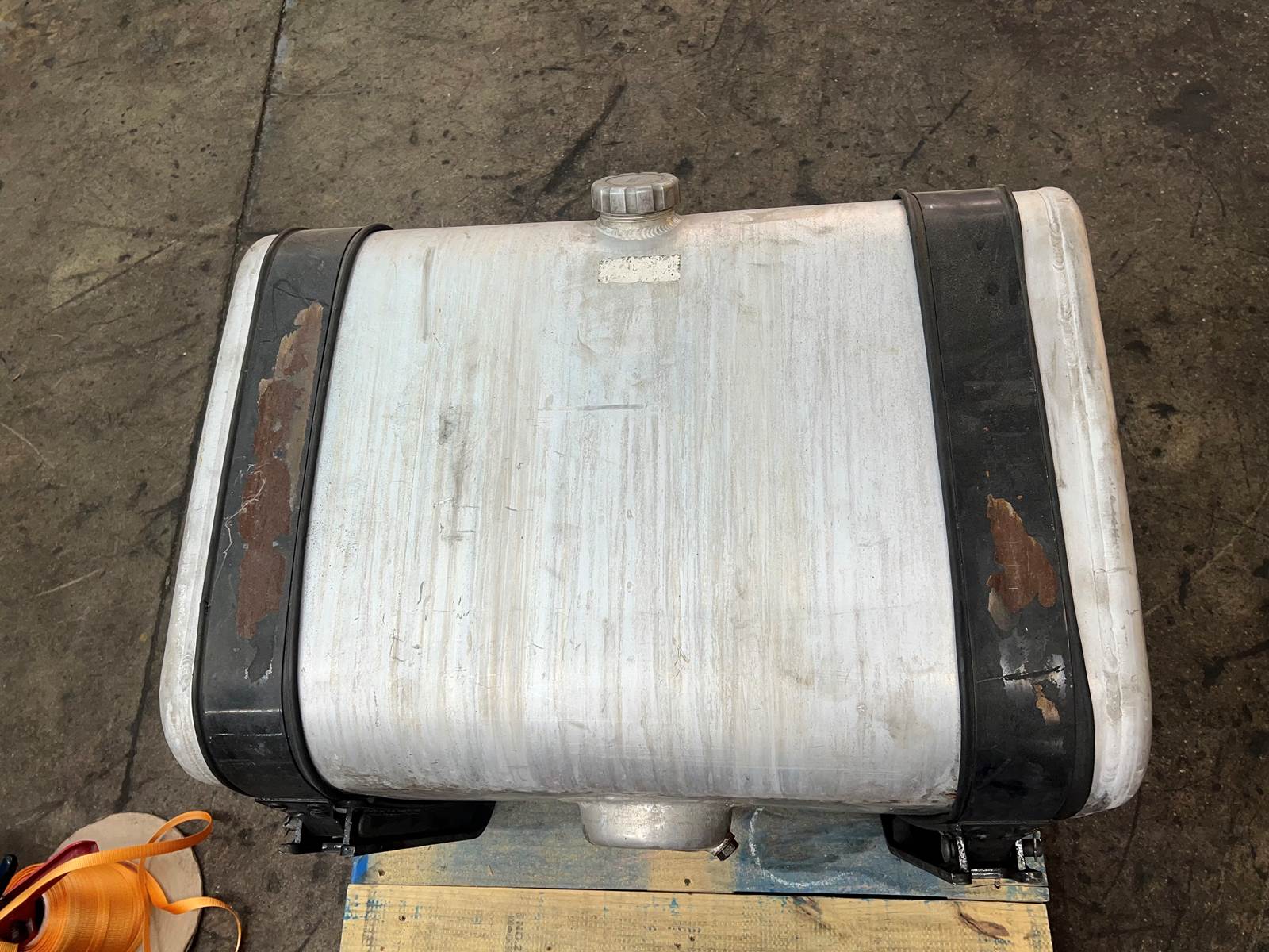 (GOOD USED) Mack Aluminum D-Shape Fuel Tank w/ Straps For Sale, Dimensions: 34” L x 23” W x 25” H, Strapping Part # 21226360, 21330318, Sending Unit Part # 22504869, Cross Reference Part # 24819997, 16MB425M2, 2131081, 2351081, Stock # 10159