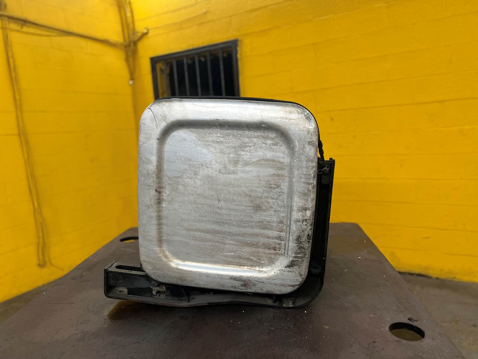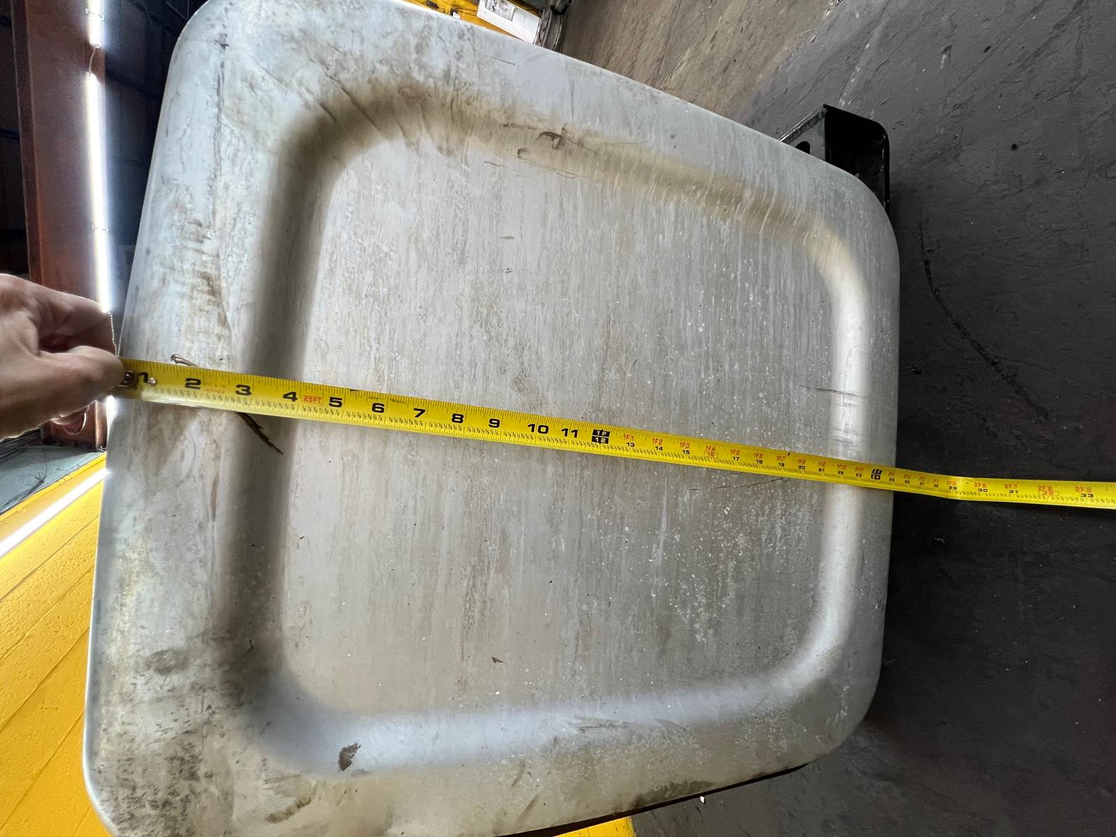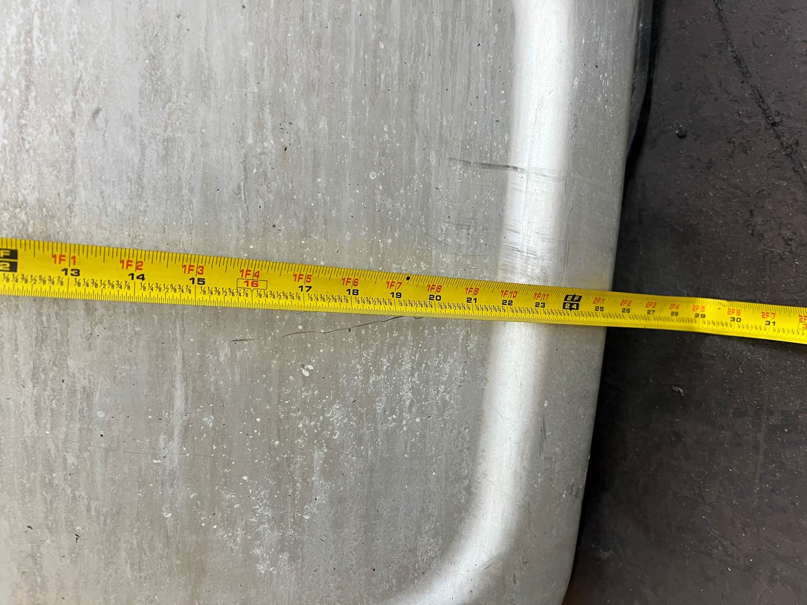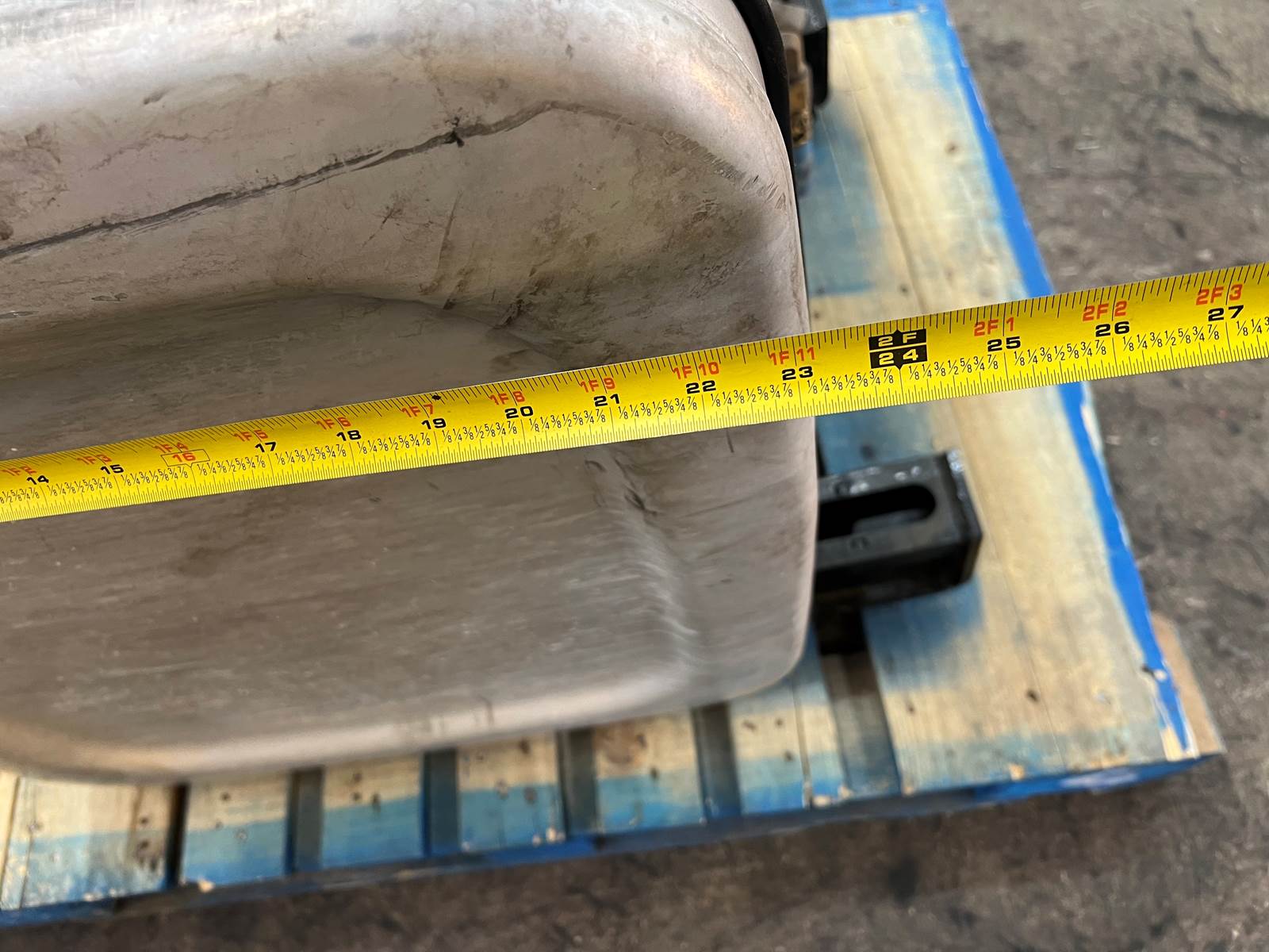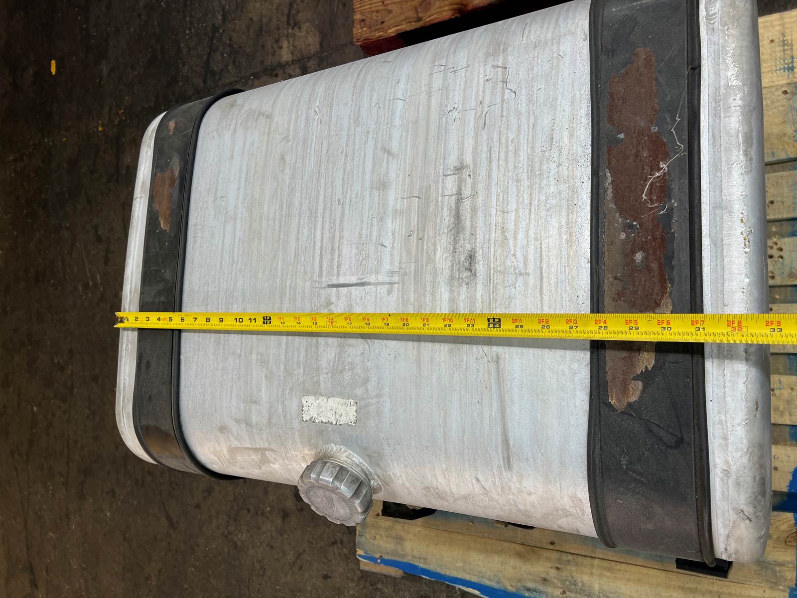 (GOOD USED) Mack Aluminum D-Shape Fuel Tank w/ Straps For Sale, Dimensions: 34” L x 23” W x 25” H, Strapping Part # 21226360, 21330318, Sending Unit Part # 22504869, Cross Reference Part # 24819997, 16MB425M2, 2131081, 2351081, Stock # 10159