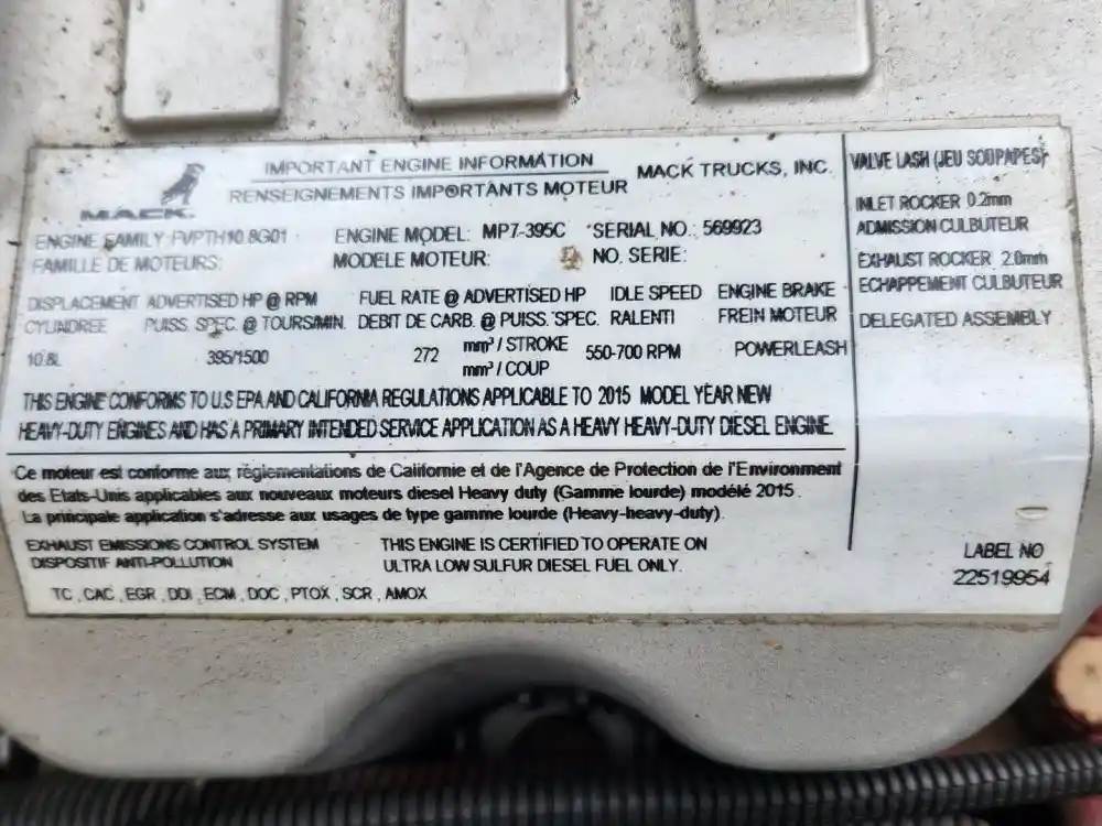 (Used) 2015 Mack MP7, ENGINE ASSEMBLY- Family Number: FVPTH10.8G01, Displacement: 10.8L, Horsepower: 395, Serial Number: 569923, Part Number: 22519954, E.C.S: TC, CAC, EGR, DDI, ECM, DOC, PTOX, SCR, AMOX, For more information about this item, give us a call. We ship Worldwide! (CRG HEAVY TRUCK PARTS) 929 W PULASKI HWY ELKTON, MD 21921, Serial#: 569923, Horse Power: 395, Casting#: 569923