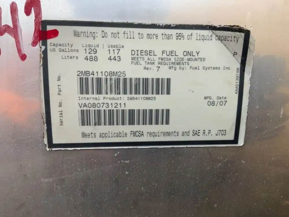 (Used) 2008 Mack CXU613, COMPLETE FUEL TANK- Side: Driver Side, Capacity: 129 Gal., Shape: Cylinder, Dimensions: 57” x 26”, Material: Aluminum, Serial Number: VA080731211, Part Number: 2MB41108M25, For more information about this item, give us a call. We ship Worldwide! (CRG HEAVY TRUCK PARTS) 929 W PULASKI HWY ELKTON, MD 21921, Capacity: 129 Gal., Dimensions: L=57” x D=26”, Material: Aluminum, Fuel Tank Shape: Round