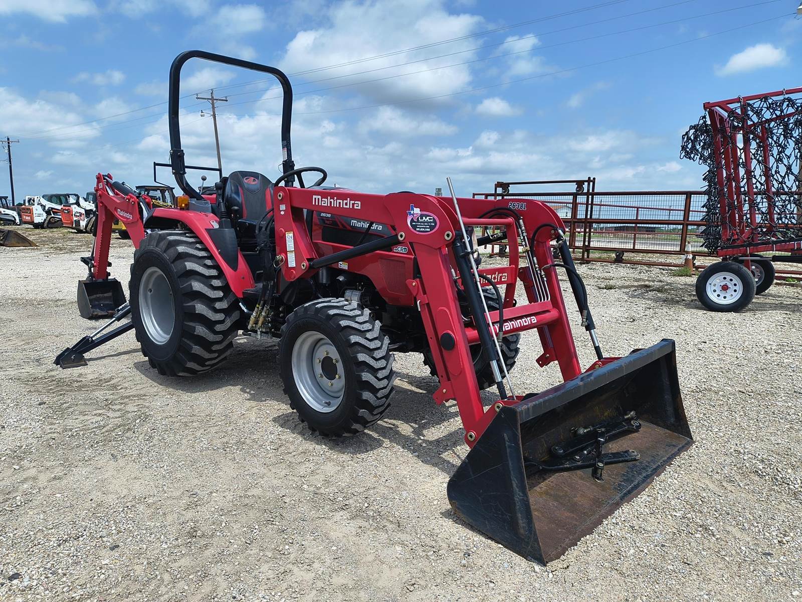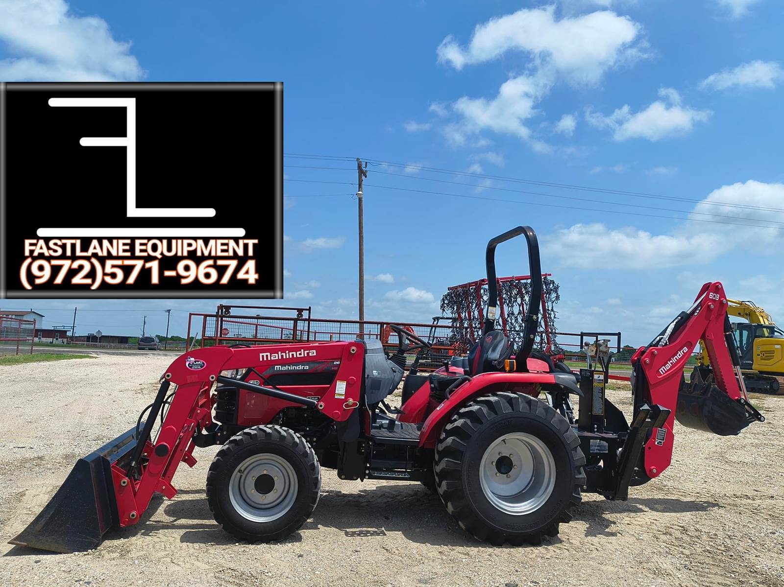 MAHINDRA 2638 UTILITY TRACTOR BACKHOE. BOUGHT NEW AND USED TWICE! ONLY 46 ORIGINAL HRS. 37 HP DIESEL. 4WD. HYDROSTATIC AUTOMATIC TRANSMISSION. R4 INDUSTRIAL TIRES. QUICK DETACH LOADER WITH QT BUCKET. FRAME MOUNT INDUSTRIAL STYLE BACKHOE. COMES WITH ALL UNUSED 3 POINT EQUIPMENT. 540RPM. THIS UNIT CONVERTS TO A STANDARD FARM TRACTOR. SEAT IS WEATHERED FROM SETTING UNDER AWNING. OPERATES LIKE NEW. ALWAYS CALL FOR CURRENT AVAILABILITY. COMPETITIVE FINANCING AVAILABLE W.A.C. (no in-house) TROUGH OUR DIRECT WEBSITE ONLY AT WWVV.FASTLANEEQUIP.C0M. CALL (972)57I-9674 OR (972)57I-lO55 TODAY.