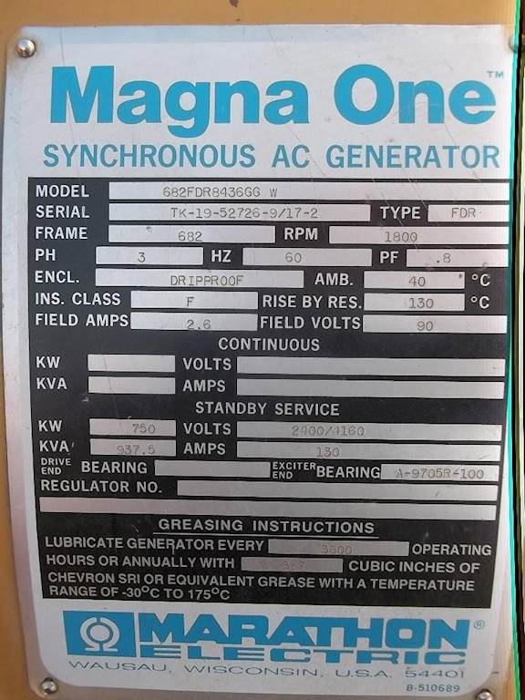 MARATHON MAGNA ONE GEN SET, CAT 3508, ESN 23Z01726, 1106HP, 3 PHASE, 60 HZ, 750KW, 937.5 KVA, 130 AMPS, 2400.4160 VOLTS, 63 HOURS,