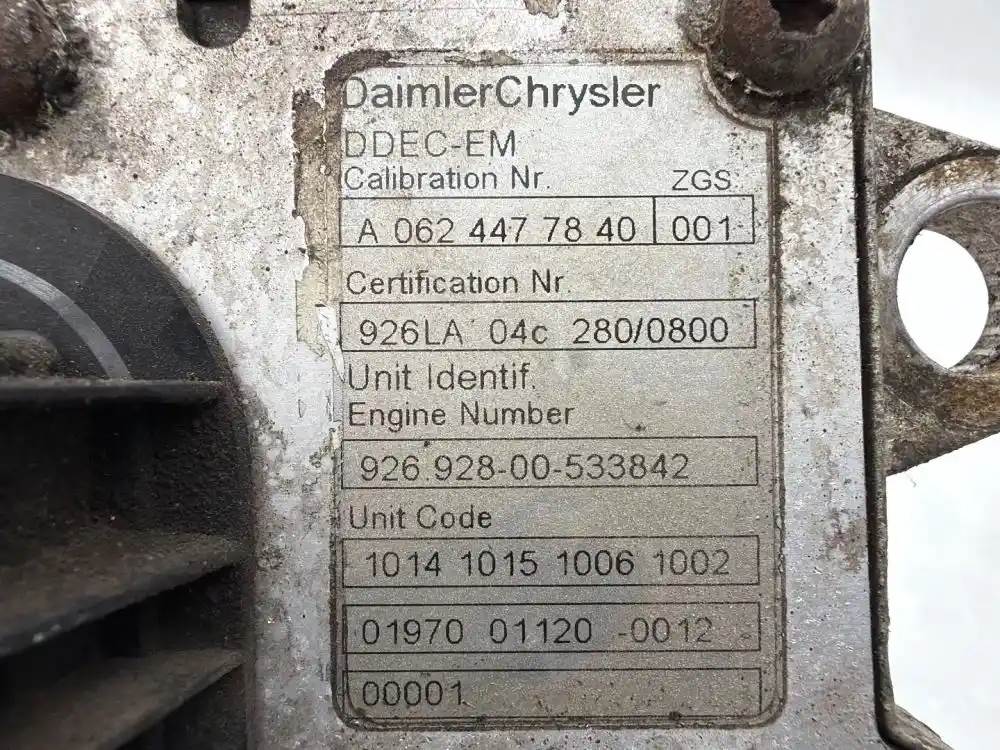 (Used) Mercedes, ENGINE ECM- Mercedes 0014462040 Mercedes 0014463340 Mercedes 0014466440 Mercedes 0014466540 Mercedes 0034461340 Mercedes A0014466440 Mercedes RA0054465440 2004-2008 Mercedes MBE4000 2004-2008 Mercedes MBE904 2004-2008 Mercedes MBE906 2004-2008 Mercedes MBE924 2004-2008 Mercedes MBE926 Part Number: 003 446 13 40, Serial Number: A000004647A8G543A50, DDEC-EM CALIBRATION Nr. A 062 447 78 40 001, CERTIFICATION Nr. 926LA 04C 280/0800, UNIT INDENTIF ENGINE NUMBER 926 928-00-533842, UNIT CODE 1014 1015 1006 1002 01970 01120 0012 00001, 1 Rectangular Plug with 55 Pins, 1 Rectangular Plug with 16 Pins, Reference images for condition. For more information about this item, give us a call. We ship worldwide! (CRG HEAVY TRUCK PARTS) 929 W PULASKI HWY, ELKTON, MD 21921, Serial#: A000004647A8G543A50