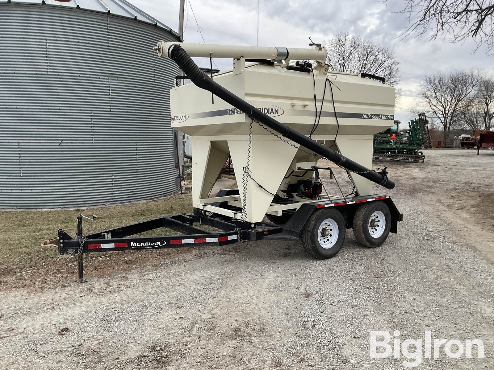 Meridian 220 BST Bumper Hitch Seed Tender, 2 5/16 ball hitch, 2 axles, (4) 35/8pR16 tires, 8 bolt rims, 2 compartments, poly auger, Avery Weigh-Tronix scales, 2 rear jacks, 2 top doors for loading, Honda GX 160 gas engine, electric start, electric fold top auger, toggle switch speed control on end of telescoping auger, SN: 6720120450644