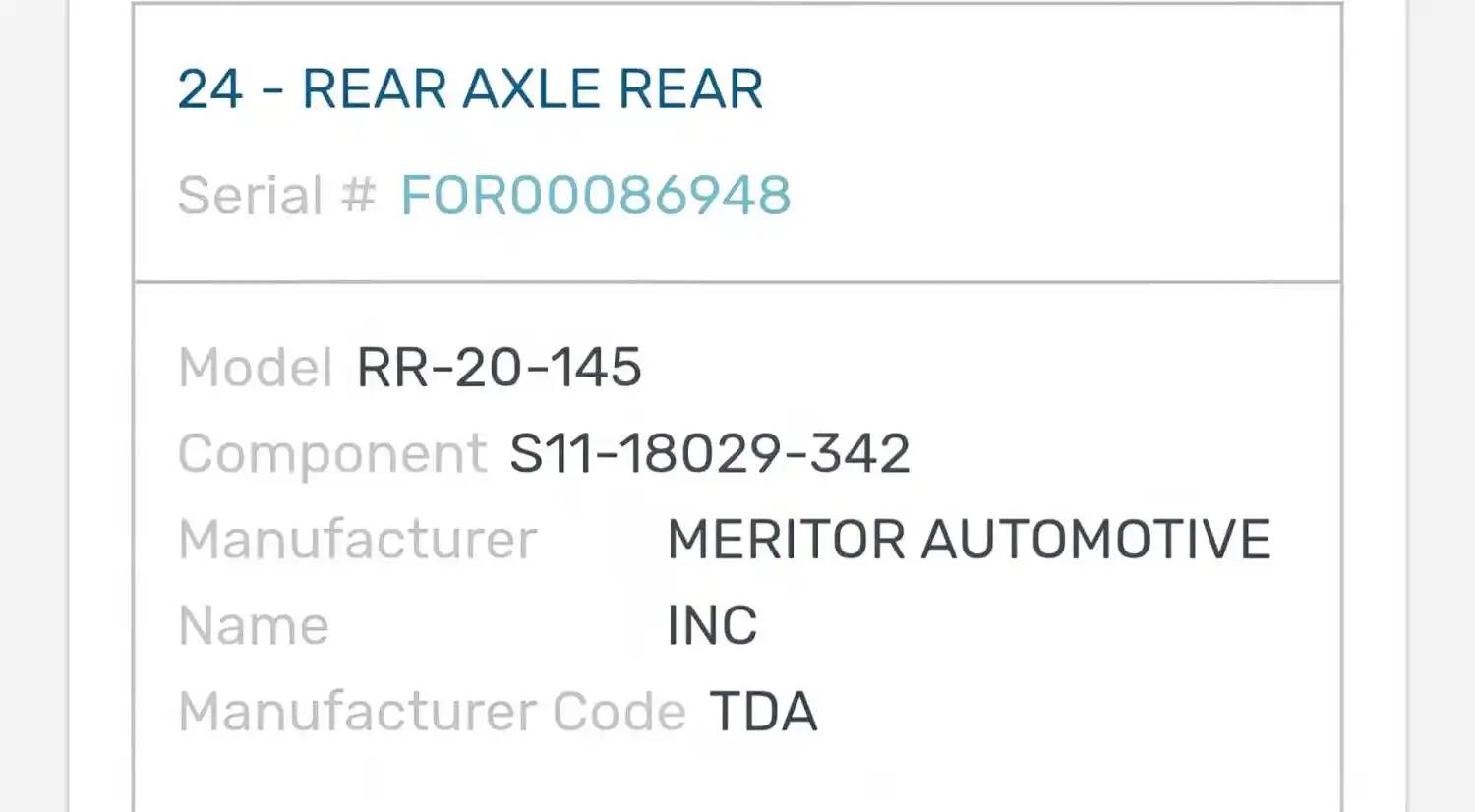 (Used) 2007 Freightliner Columbia 120, REAR DIFFERENTIAL GEARS ONLY- Part Number: S11-18029-342, Serial Number: FOR00086948, Make: Meritor, Model: RT40-145, Ratio: 3.42, Capacity: 20,000 Lbs, Reference images for condition, For more information about this item, give us a call. We ship Worldwide! (CRG HEAVY TRUCK PARTS) 929 W PULASKI HWY ELKTON, MD 21921, Serial#: FOR00086948, Ratio: 3.42, Casting#: FOR00086948
