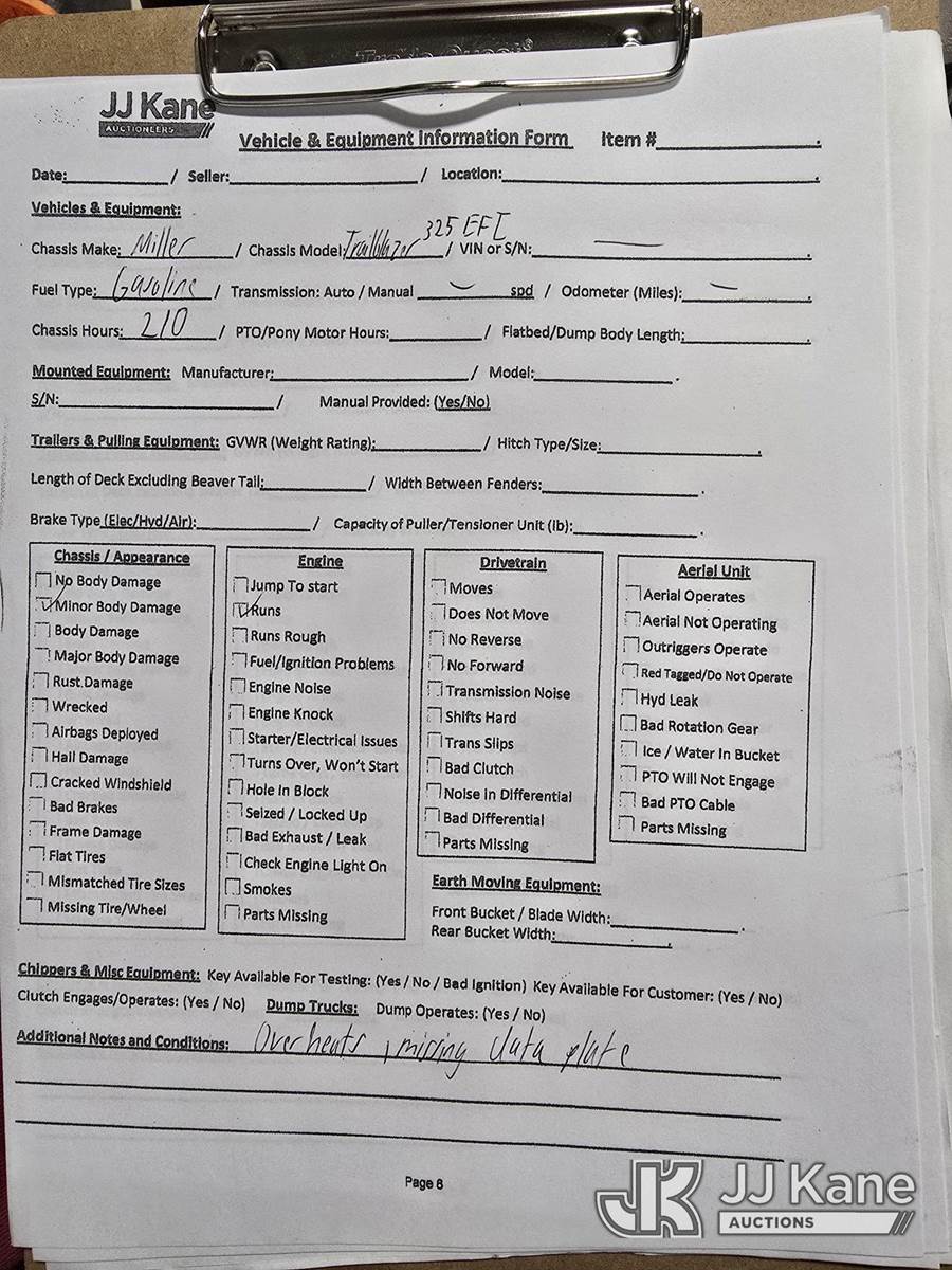 Miller Trailblazer 325 EFI Welder/Generator, Kohler gas, (Runs) (Seller States: Overheats while running) (Reads 210 hours) NOTE: This unit is being sold AS IS/WHERE IS via Timed Auction and is located in Oshkosh, WI. Inspection & preview days for this unit are by appointment only; please contact us at contact@jjkane.com or 84-Go-JJKane for more details. (Buyer is responsible for removal. Assistance by consignor or JJ Kane Auctioneers is not assured.)