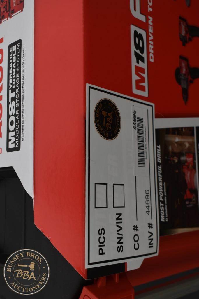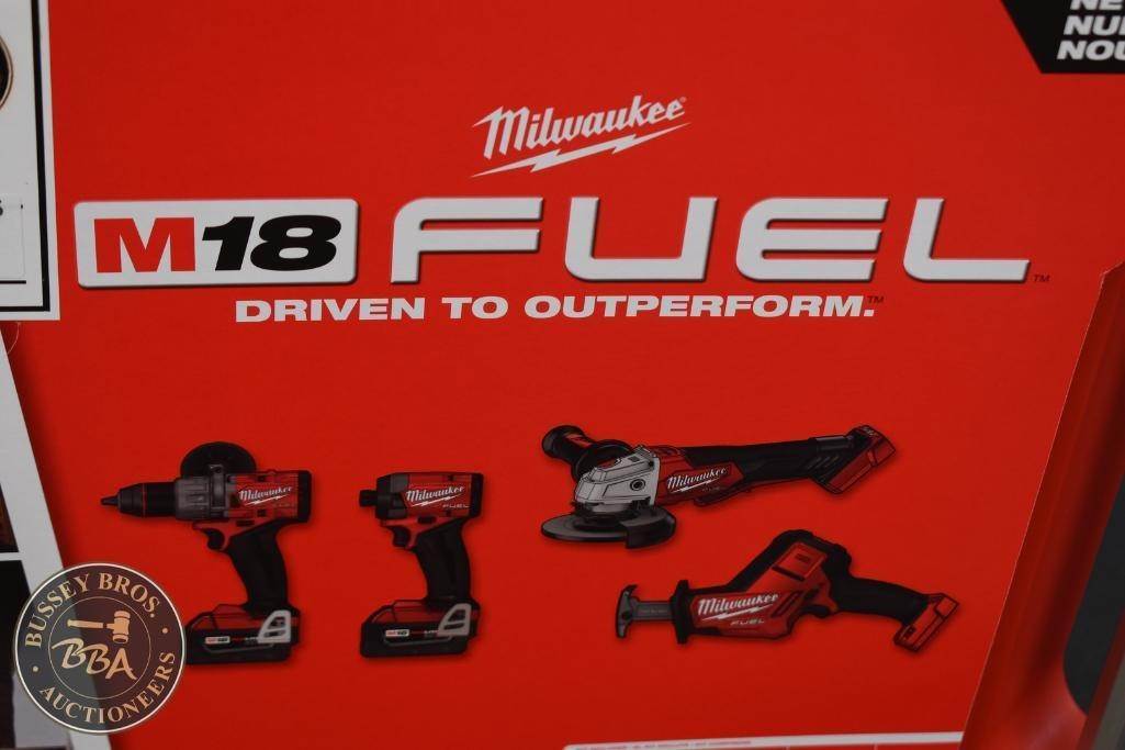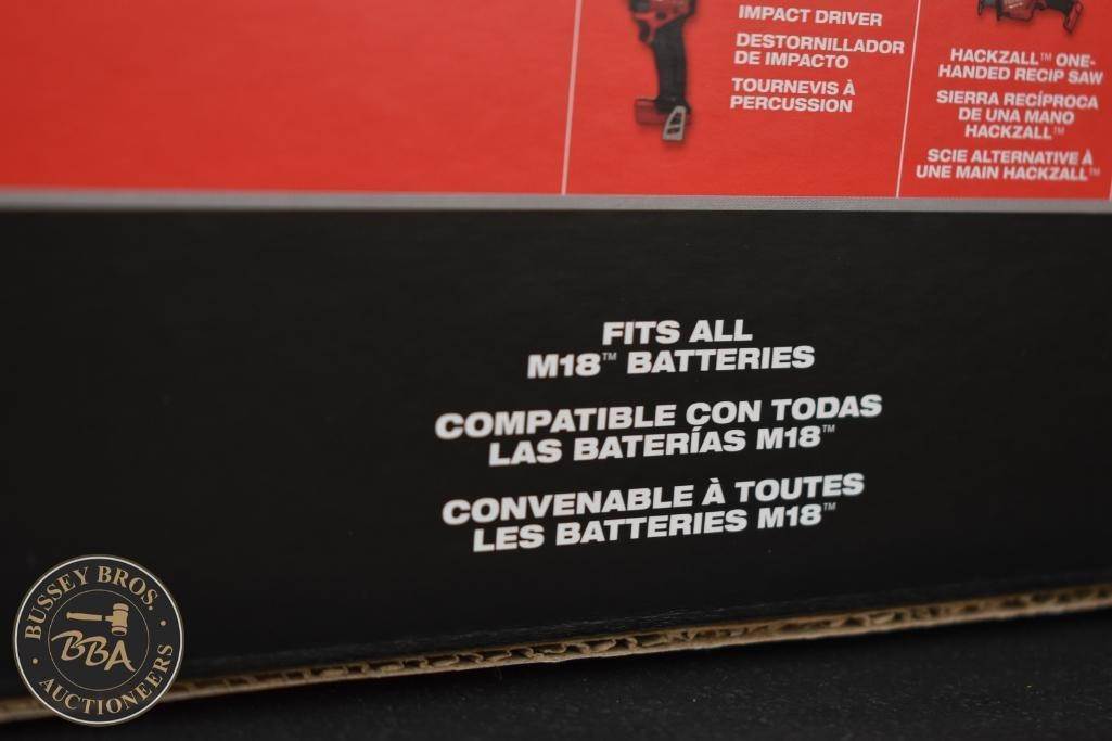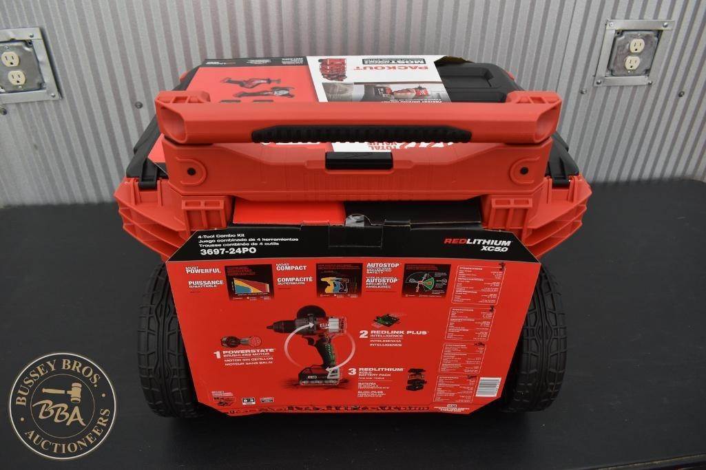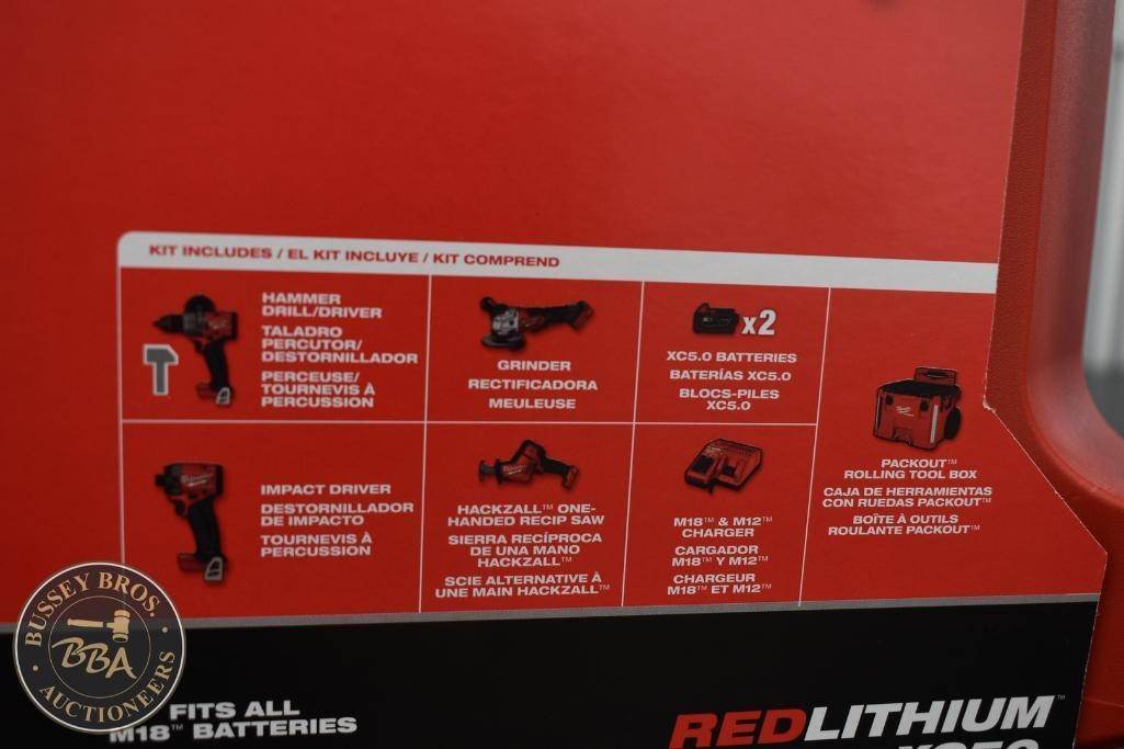 Milwaukee 4 Tool Packout Tool Kit Kit contains, Hammer Drill, Impact Driver, Angle Grinder, and Sawzall 2-5amp hour batteries, and a M18-M12 charger,, NEW/UNUSED