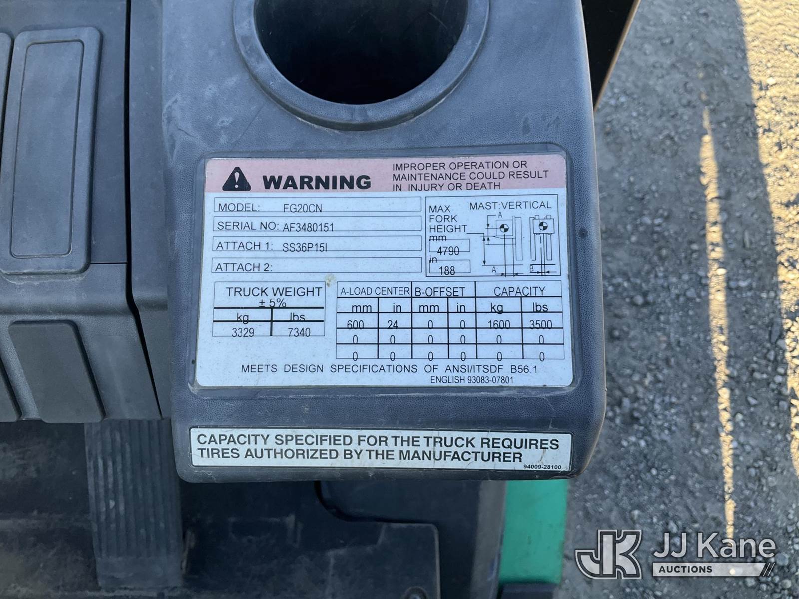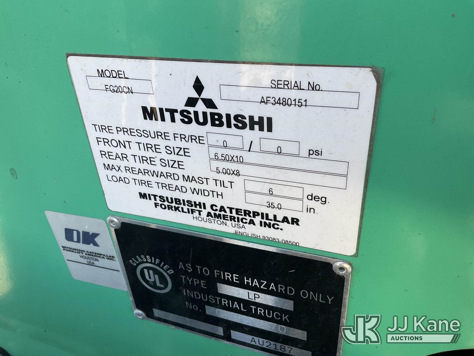 MITSUBISHI FG20CN Solid Tired Forklift, s/n AF3480151, 4-cyl, LPG, (Runs, Moves, & Operates) (No Tank) NOTE: This unit is being sold AS IS/WHERE IS via Timed Auction and is located in Jurupa Valley, CA. Inspection & preview days for this unit are the 2 business days prior to the first day of items closing for this auction, item is located at 4510 Muth Way Jurupa Valley, CA 92509 and hours of operations are 8a-4p. For pre-sale questions, please contact please contact Office Staff @ (310) 353-7140. Dealer License Number 45696. (Buyer is responsible for removal. Assistance by consignor or JJ Kane Auctions is not assured.)