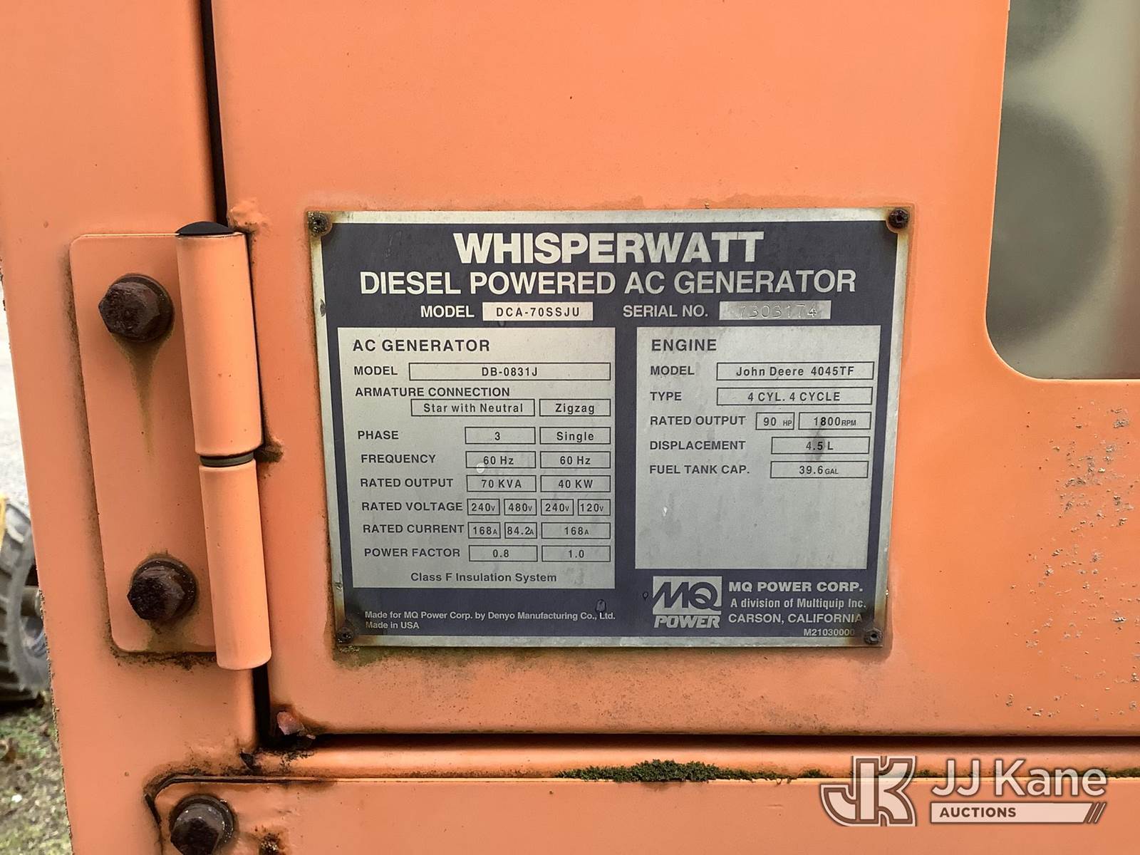 Multiquip DCA70SSJU Generator, s/n 7303174, 4.5L I4 Diesel, 3 Phase, 60 Hz, 40 KW, 240/480V (Runs & Produces Power) (Removal is by Appointment Only, Buyer MUST make a appointment prior to picking up, Buyer/Transporter Must have PAID IN FULL RELEASE. No onsite assistance available, Please Come prepared.) (Reads 7,116 hours) NOTE: This unit is being sold AS IS/WHERE IS via Timed Auction and is located in Harmans, MD. Inspection & preview days for this unit are by appointment only; please contact us at contact@jjkane.com or 84-Go-JJKane for more details. For pre-sale questions, please contact the on-site office @ (443) 557-0025 or Kevin.Waggoner@JJKane.com. (Buyer is responsible for removal. Assistance by consignor or JJ Kane Auctions is not assured.)