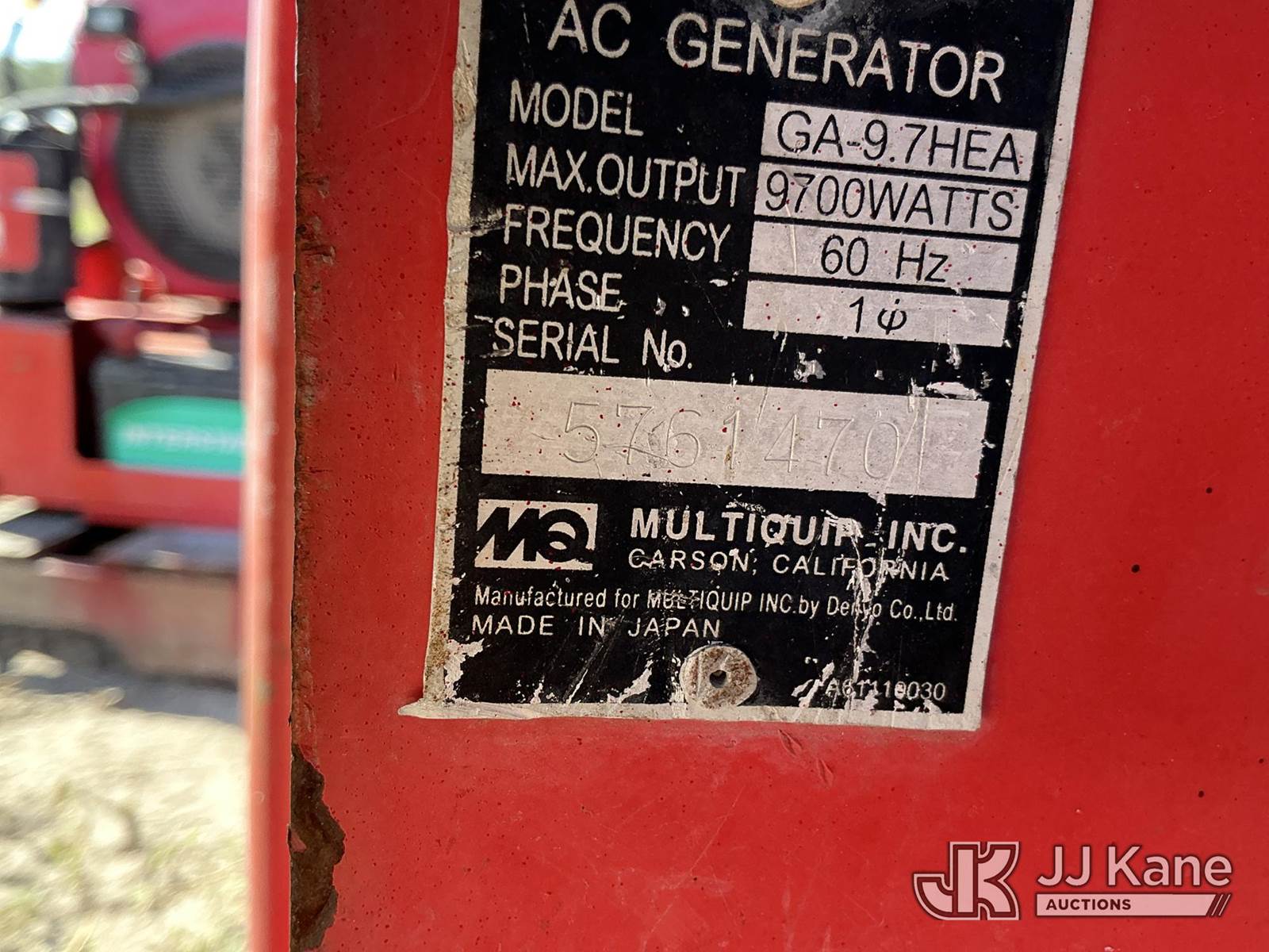Multiquip GA-9.7HEA Portable Gas Generator, S/N: 5761470 (Not Running, Condition Unknown) (Reads 3,824 hours) NOTE: This unit is being sold AS IS/WHERE IS via Timed Auction and is located in Thonotosassa, FL. Inspection & preview days for this unit are the 2 business days prior to the first day of items closing for this auction, item is located at 11720 N US 301 Thonotosassa, Fl 33592 and hours of operations are 8a-4p. For pre-sale questions, please contact Office Staff @ (813) 986-2485. (Buyer is responsible for removal. Assistance by consignor or JJ Kane Auctions is not assured.)