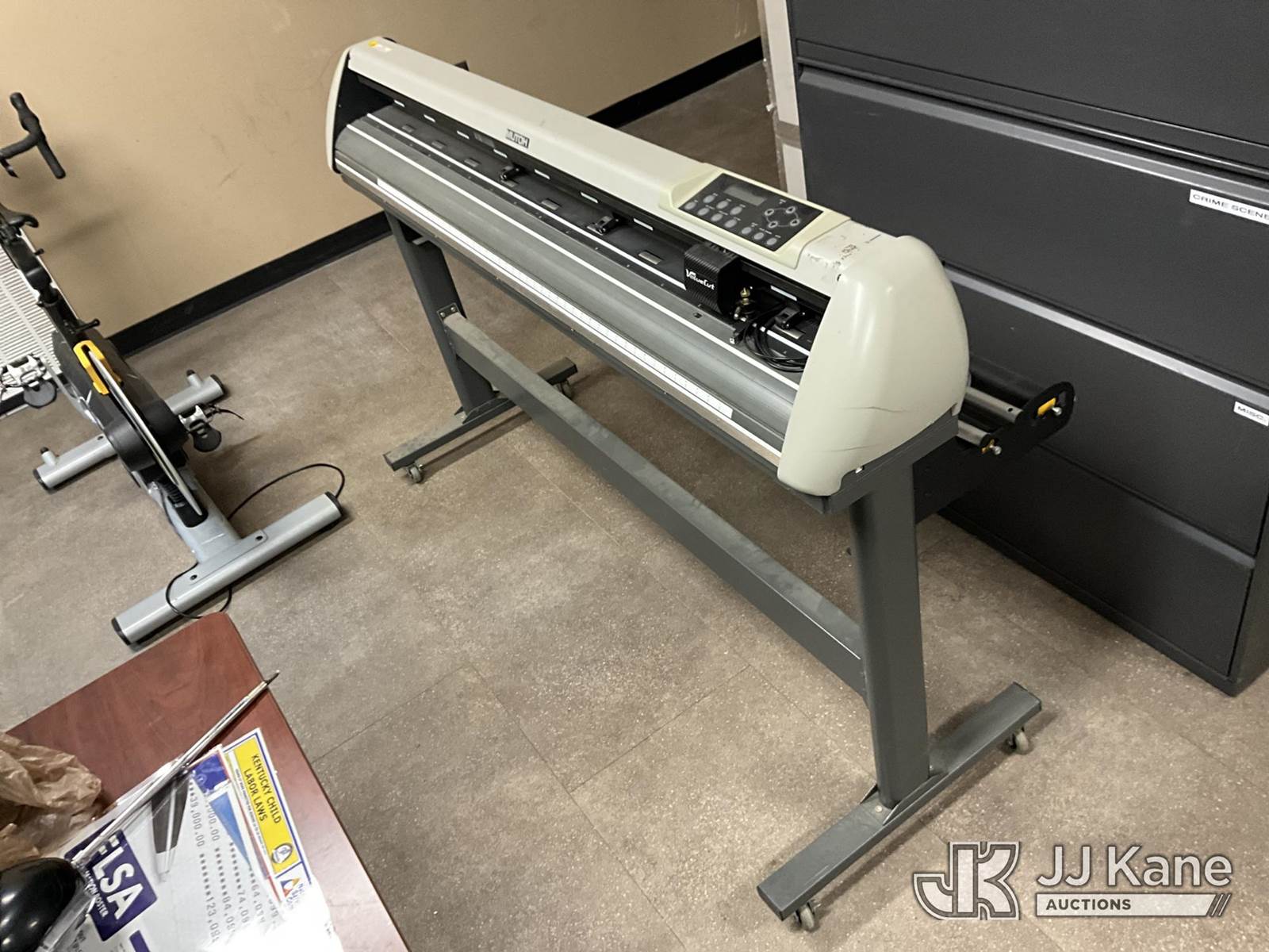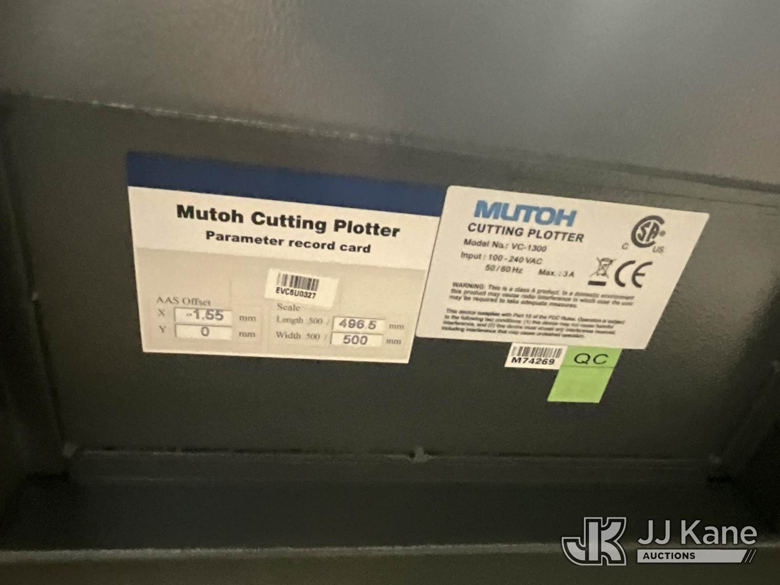 Mutoh VC1300 Cutting Plotter (Operates) NOTE: This unit is being sold AS IS/WHERE IS via Timed Auction and is located in Erlanger, KY. For more information & removal arrangements please contact Spencer Owen @ 502-232-2541. Load Out will be by appointment only M-F; must call 24 HRS. in advance. Buyer/Hauler must present copy of paid invoice upon arrival. Purchaser acknowledges ALL lots must be removed within 5 business days of Auction, or a storage fee may be incurred. This item is used and may contain defects that are not immediately detectable. Text description and photos given are meant to be used as a guide only. The conditions are provided by the consignor; you are responsible for inspecting item before bidding. All information provided is believed to be correct but no warranty as such is either intended or implied. All items are sold AS IS - WHERE IS AND WITH ALL FAULTS AND DEFECTS THEREIN. Auctioneer Michael Whitebread / License # 256617 (Buyer is responsible for removal. Assistance by consignor or JJ Kane Auctions is not assured.)