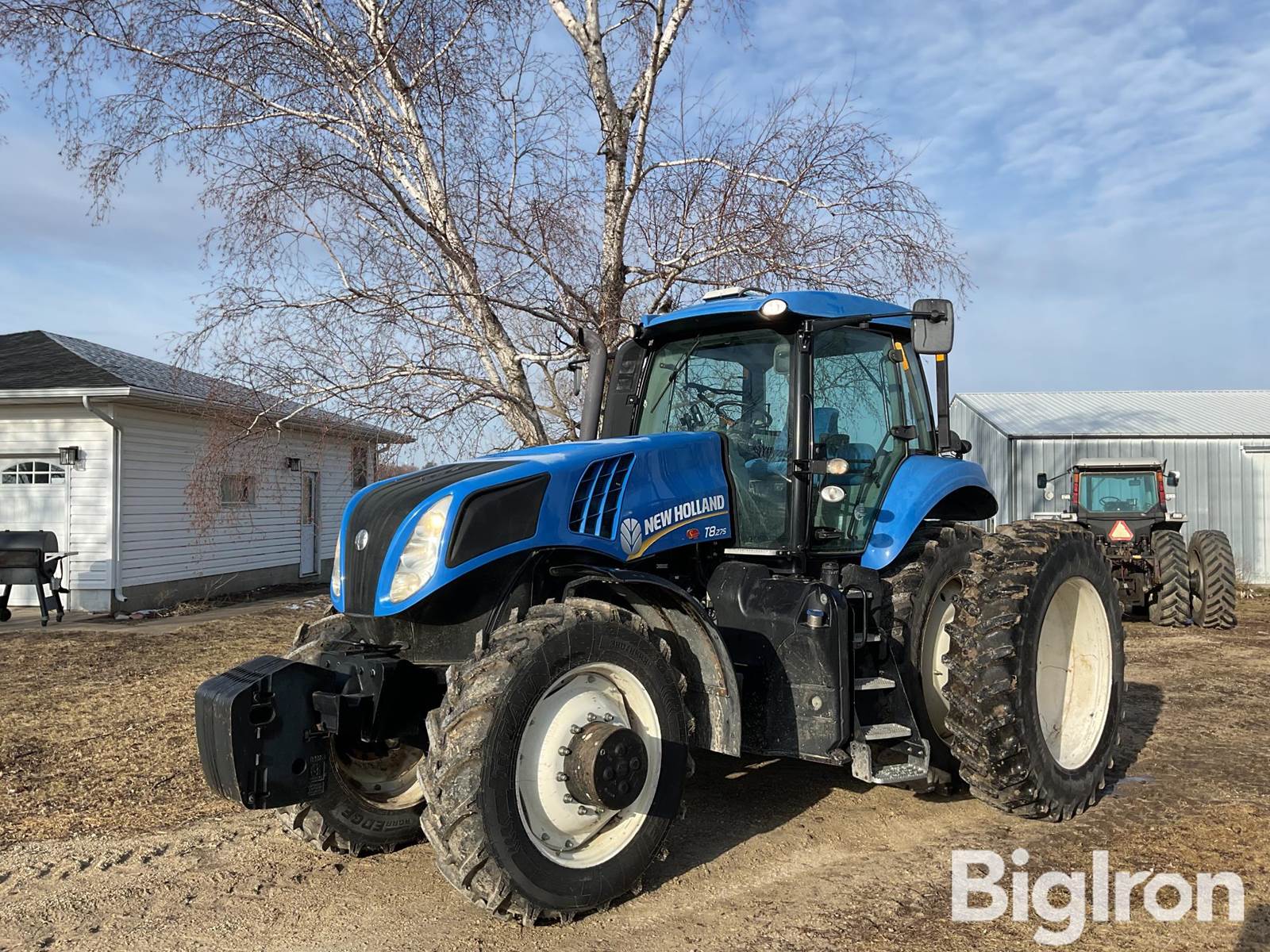 New Holland T-8 275 MFWD Tractor, 2,809 hrs showing, 250 hp, New Holland 8.7 L six-cyl diesel, Block Heater, New Holland, 18 speed power shift, Rear PTO, 4 Hydraulic Outlets, Rear Fender 3-Pt Hitch Control, 3-Point w/Quick Hitch, 380/85 R34 Front Tires, 480/80 R46 Rear Tire Size, Rear Duals, Front and Rear Fenders, GPS globe & monitor for auto guidance features included, 250 hp aftermarket chip installed, SN: ZBRC05943