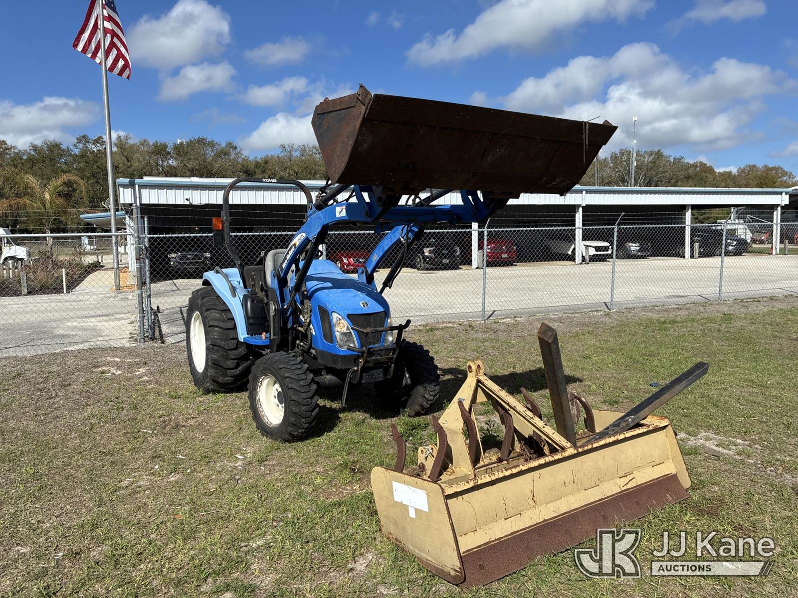 New Holland TC40A Utility Tractor, s/n Z7DBO4995, diesel, Hydrostatic, with Box Blade, Fork Extensions & ROPS, (Runs, Moves, Operates) (Jump To Start) (Reads 998 hours) NOTE: This unit is being sold AS IS/WHERE IS via Timed Auction and is located in Thonotosassa, FL. Inspection & preview days for this unit are the 2 business days prior to the first day of items closing for this auction, item is located at 11720 N US 301 Thonotosassa, Fl 33592 and hours of operations are 8a-4p. For pre-sale questions, please contact Office Staff @ (813) 986-2485. (Buyer is responsible for removal. Assistance by consignor or JJ Kane Auctions is not assured.)