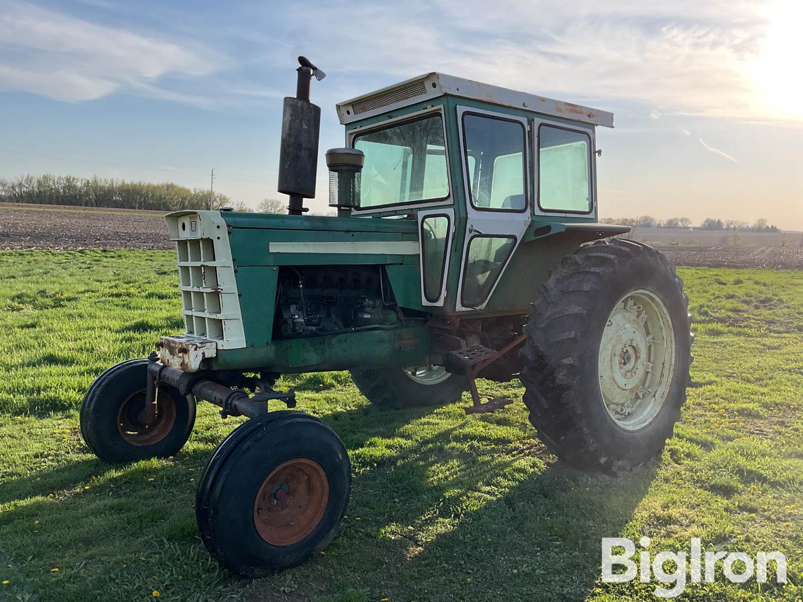 Oliver 1855 2WD Tractor, 5,128 hrs showing, 92 hp, Waukesha 6 cyl, Diesel, Water Cooled Engine, Engine oil leaks visible, Manual Transmission, 540 PTO, 2 Auxiliary Hydraulics, Hydraulic Brakes, 11L-15 Front Tires, 18.4-38 Rear Tires, NOTE: Motor has blown head gasket but does run, SN: 2397894685