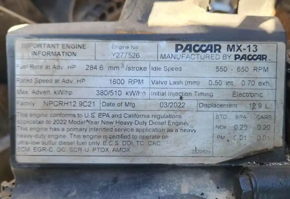 (Used) 2022 PACCAR MX13, ENGINE ASSEMBLY- Family Number: NPCRH12.9C21, Displacement: 12.9L, Horsepower: 510, Serial Number: Y277526, E.C.S: DDI, TC, CAC, ECM, EGR-C, OC, SCR-U, PTOX, AMOX, For more information about this item, give us a call. We ship Worldwide! (CRG HEAVY TRUCK PARTS) 929 W PULASKI HWY ELKTON, MD 21921, Serial#: Y277526, Horse Power: 510, Casting#: Y277526