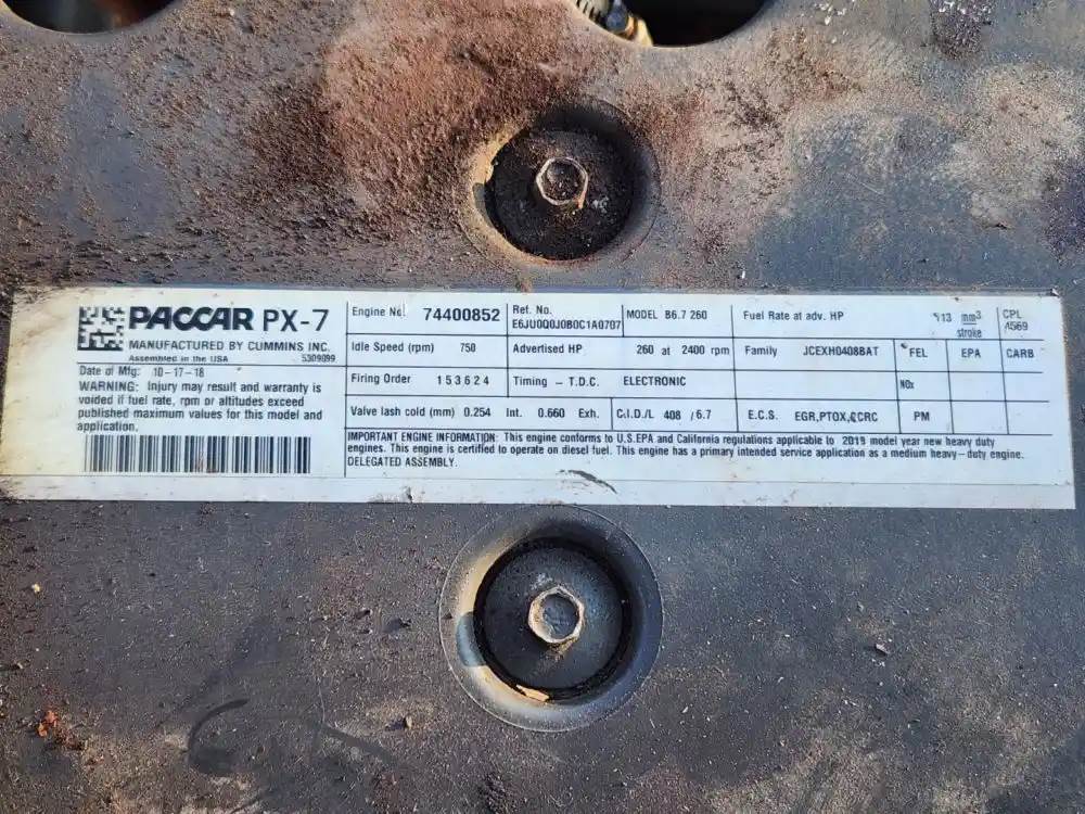 (Core) Engine does Turn 360 Degrees Complete, 2018 Paccar PX-7, ENGINE ASSEMBLY- Family Number: JCEXH0408BAT, Displacement: 6.7, Horsepower: 260, CPL: 4569, Serial Number: 74400852, Part Number: E6JU0Q0J0B0C1A0707, ECS: EGR, PTOX, SCRC, Reference images for condition, For more information about this item, give us a call. We ship Worldwide! (CRG HEAVY TRUCK PARTS) 929 W PULASKI HWY ELKTON, MD 21921, Serial#: 74400852, Horse Power: 260, Casting#: 74400852