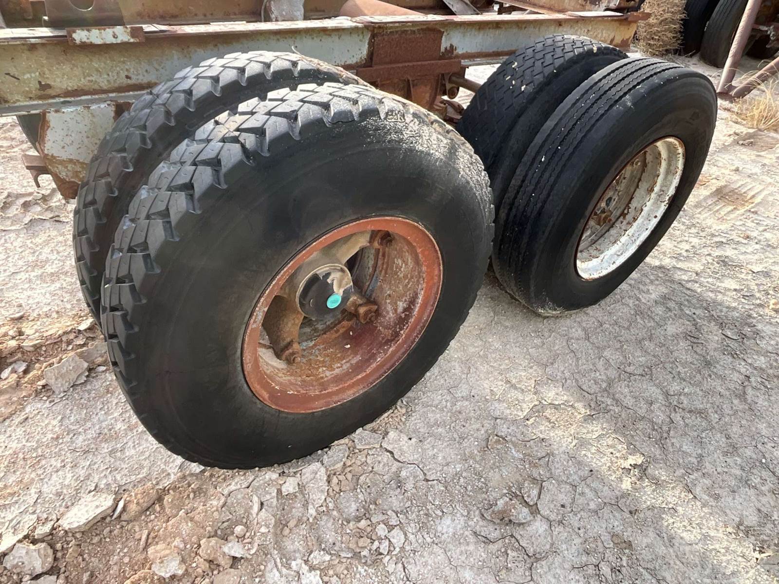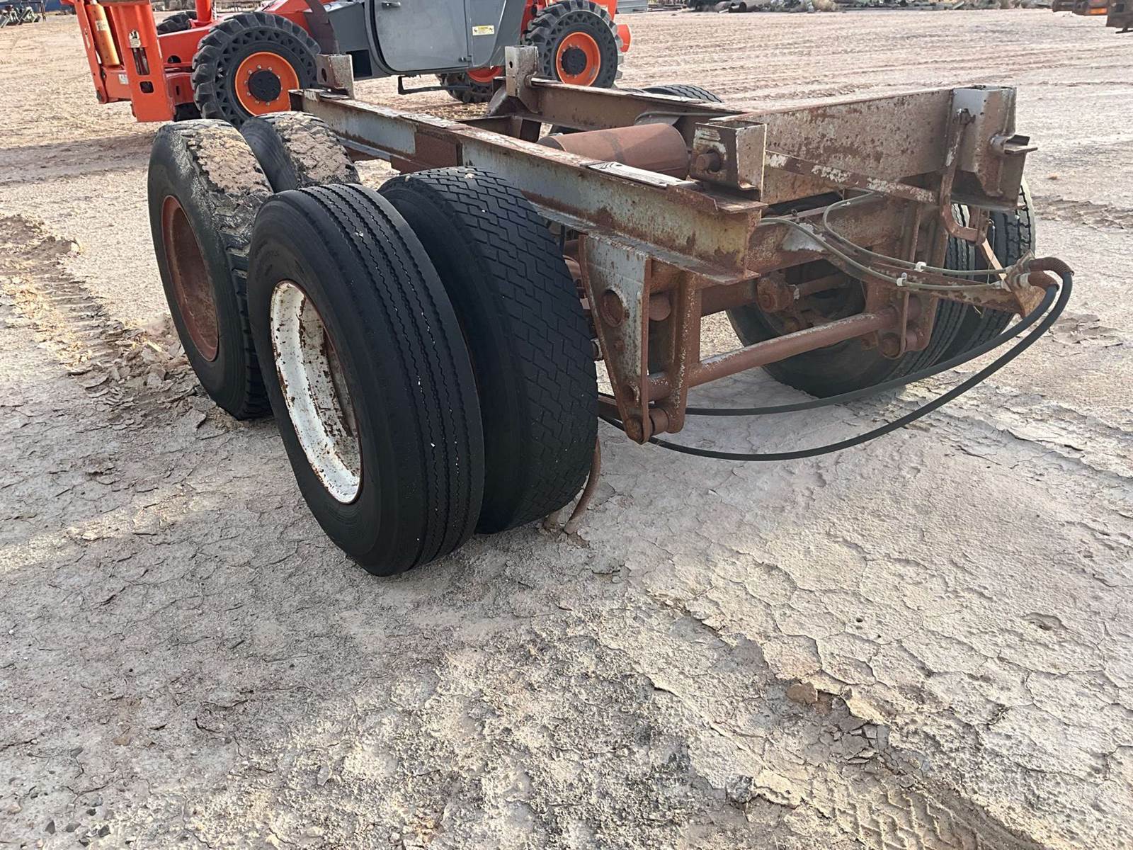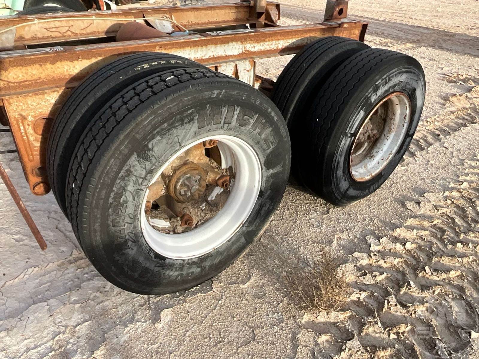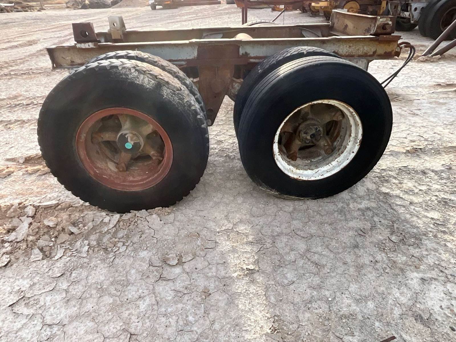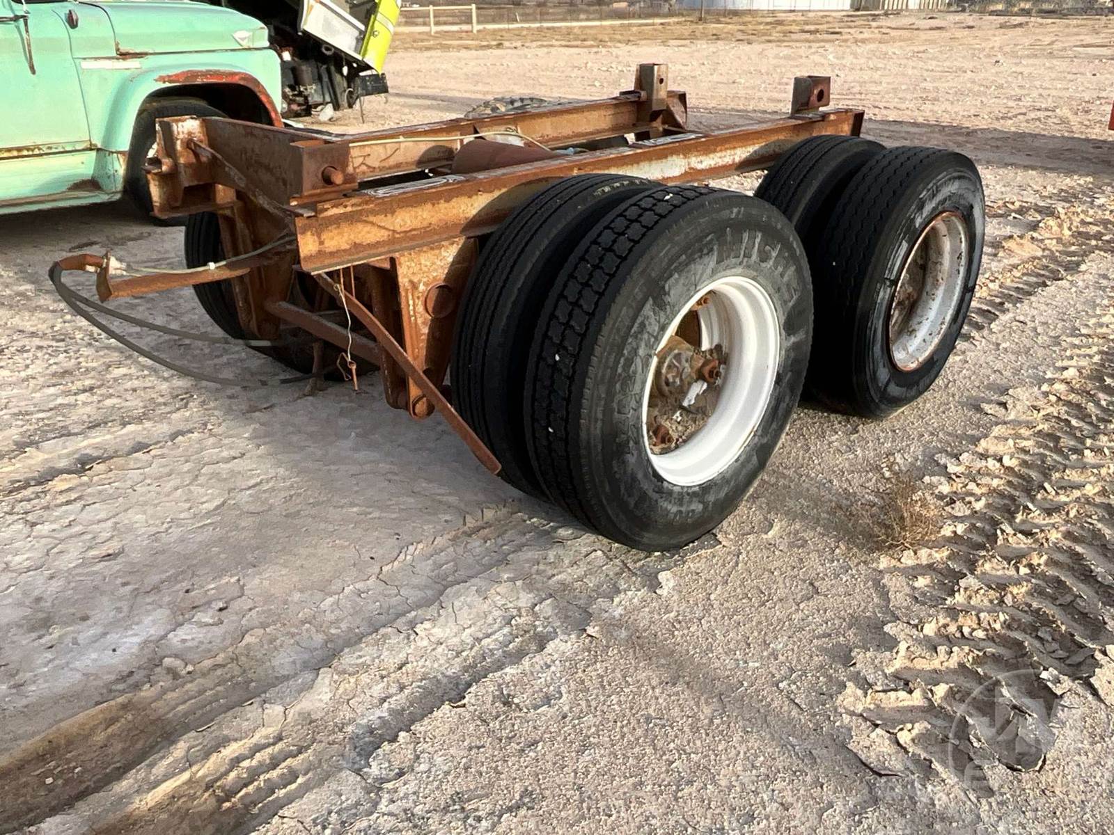 PAIR OF AXLES TRAILER AXLE SLIDER, TRAILER AXLE SLIDER FRAME WITH AXLES AND TIRES. CALIFORNIA HUBS 295/75 R22.5 TIRES
