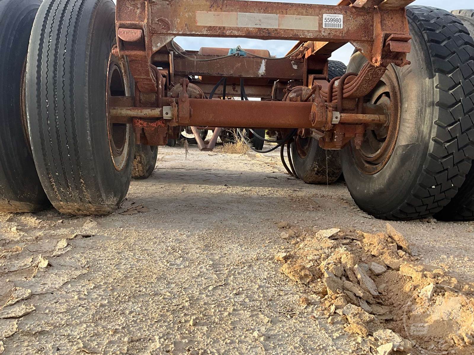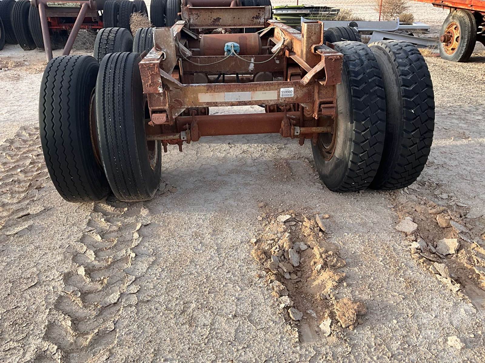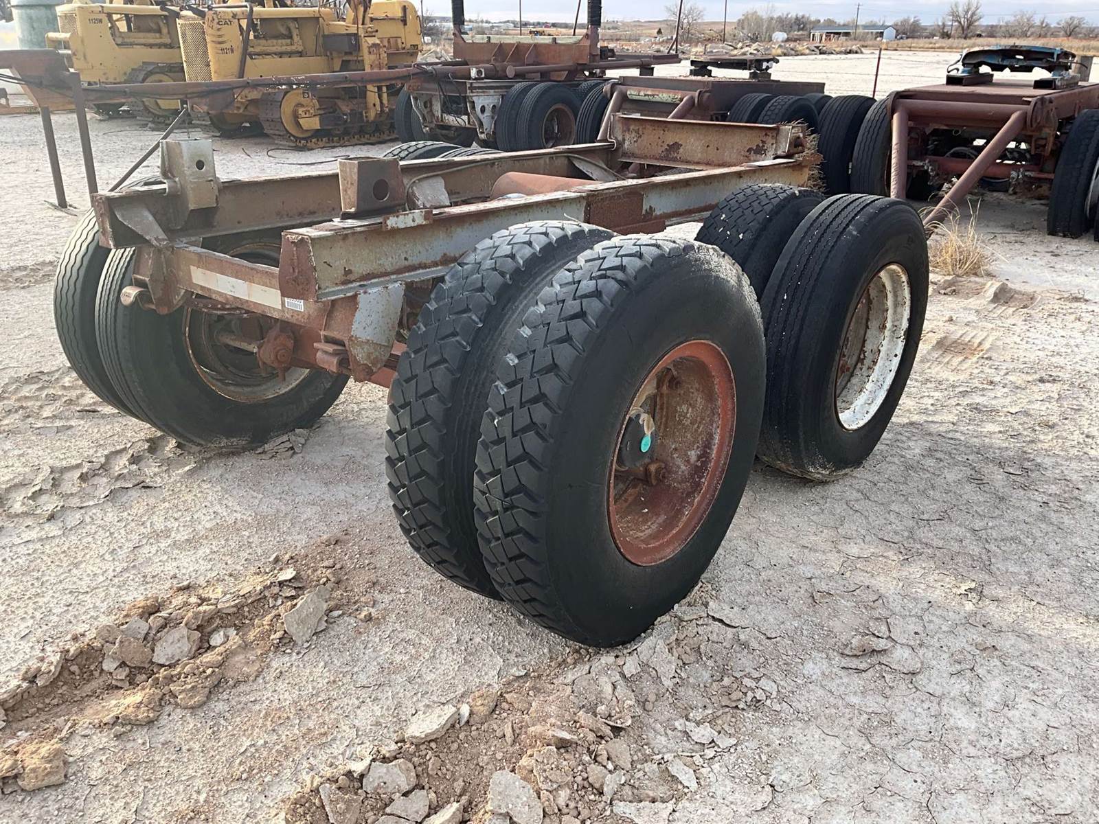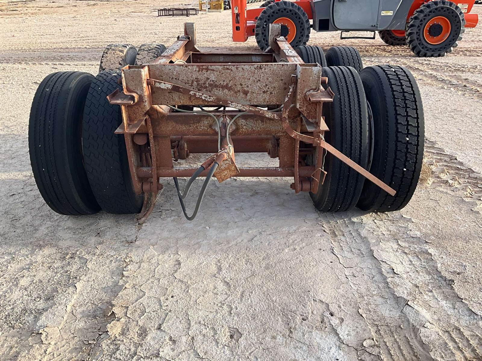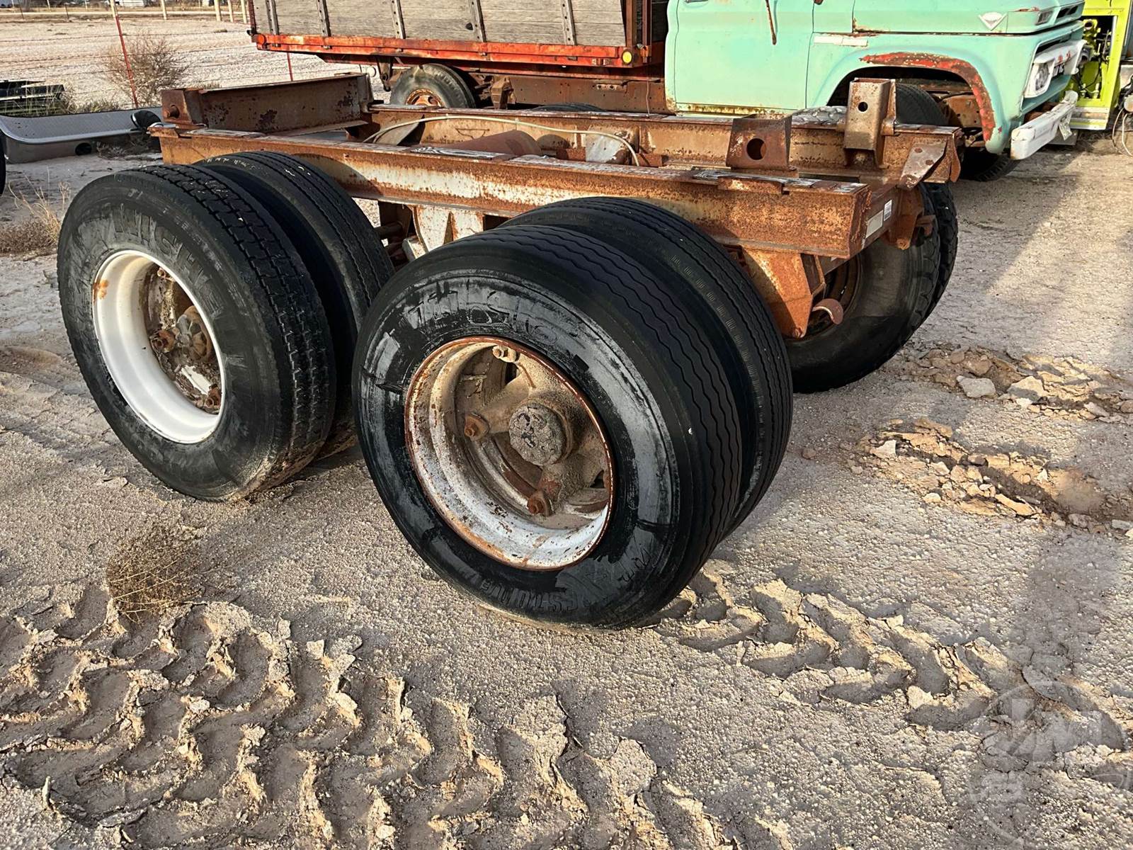 PAIR OF AXLES TRAILER AXLE SLIDER, TRAILER AXLE SLIDER FRAME WITH AXLES AND TIRES. CALIFORNIA HUBS 295/75 R22.5 TIRES