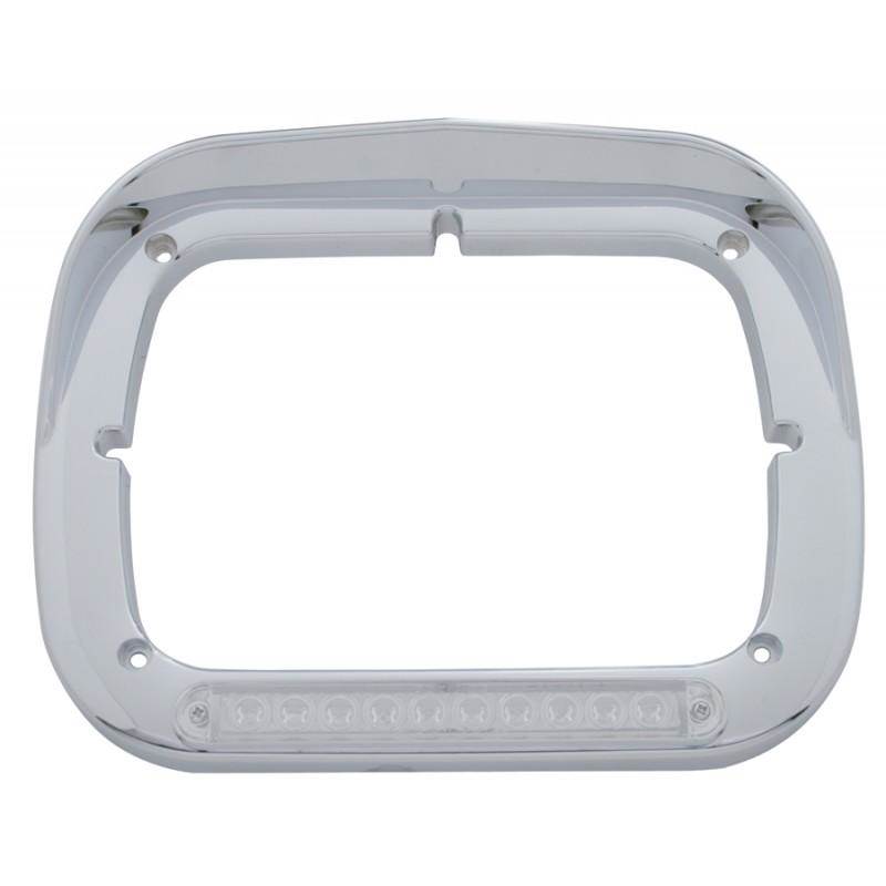 HEADLAMP BEZEL, PETERBILT 357/377/378, LH/RH,10 AMBER LED 6 X 8 RECTANGULAR SINGLE LAMP, W/VISOR, CLEAR LENS, CHROME, PLASTIC, SOLD INDIVIDUALLY
