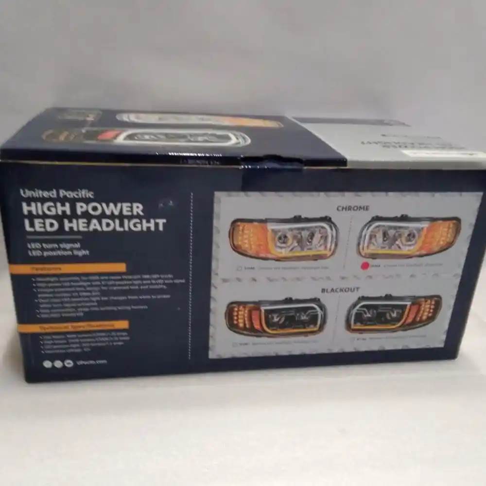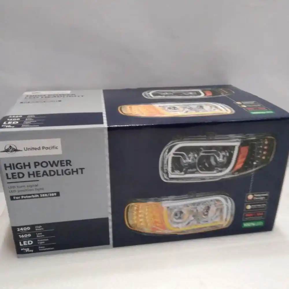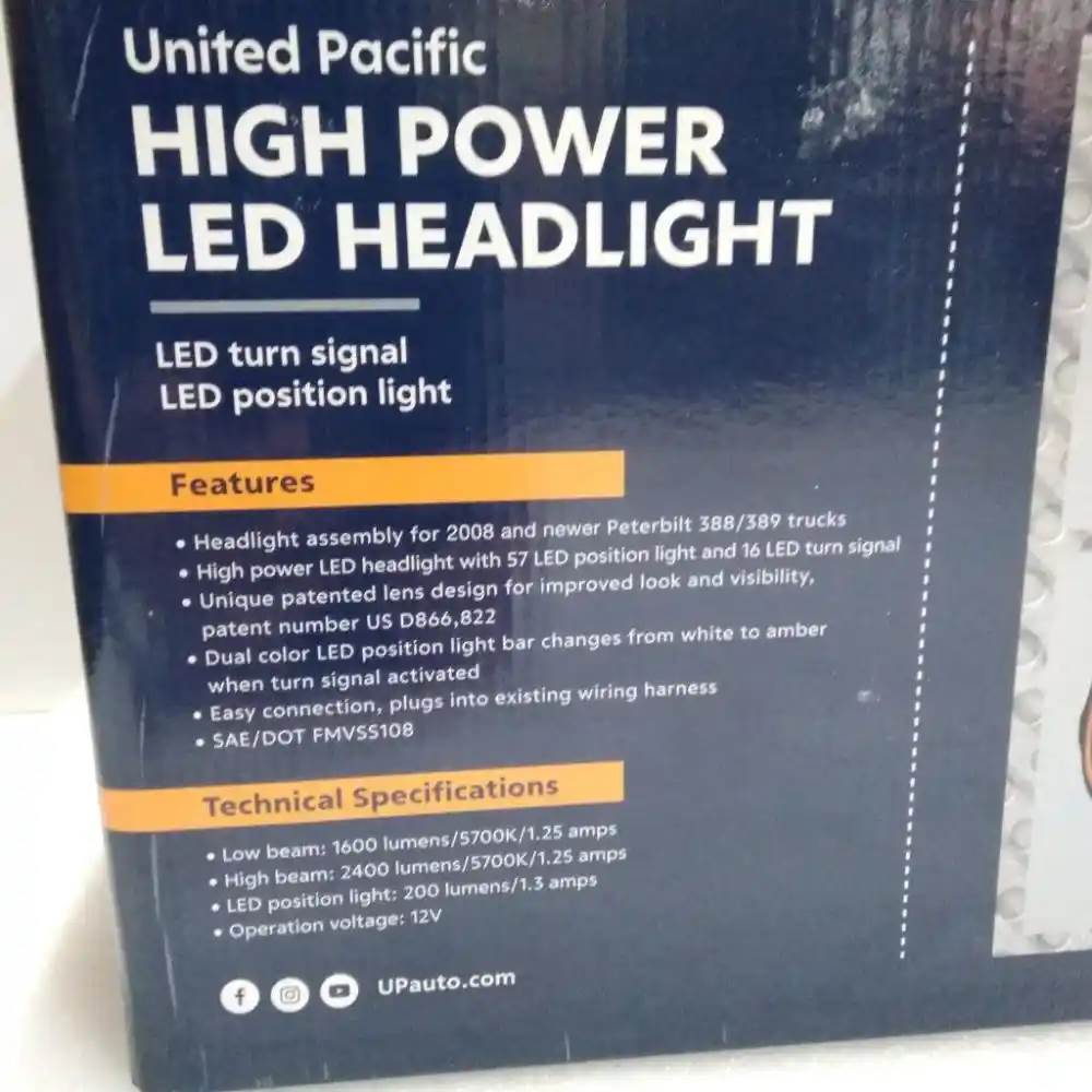 United Pacific High Power Led Driver Side Headlight p/n 31144 High Power LED Headlight With 16 LED Turn & 57 LED Bar For 2008-2024 Peterbilt 389 Dual color LED position light bar changes from white to amber when turn signal activated. Easy connection, plugs into existing wiring harness. Low beam: 1,600 Lumens, 1.25 Amps, 12V DC Input. High beam: 2,400 Lumens, 2.50 Amps, 12V DC Input. Also fits Peterbilt 2005-2015 388, 2014-2022 567., Core Charge: 0.00