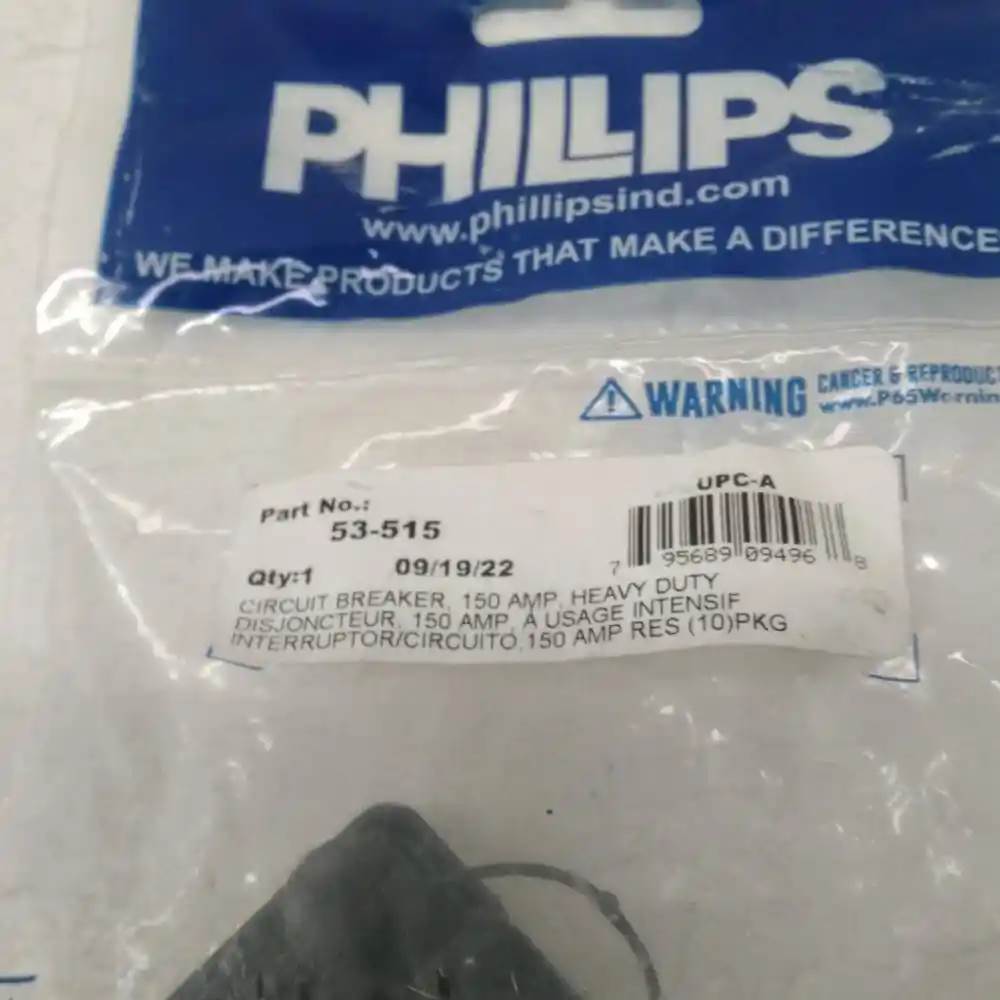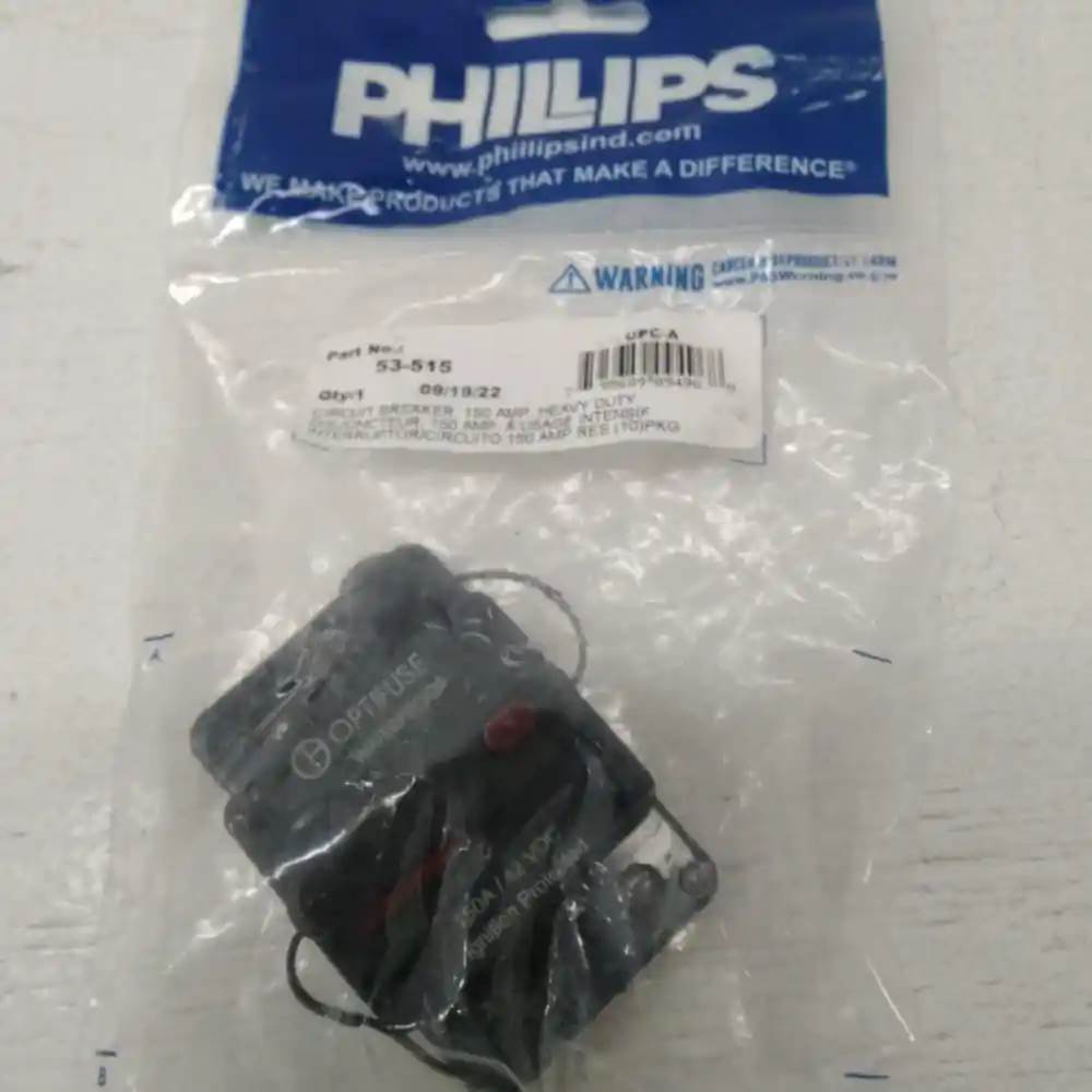Phillips 150 amp Heavy Duty Circuit Breaker 53-515 The Phillips 150 Amp Heavy Duty Circuit Breaker (53-515) is an electrical protection device designed to interrupt excessive current flow in heavy-duty vehicle electrical systems. It safeguards circuits by automatically disconnecting power during overload conditions to prevent damage and maintain system integrity. Key Specifications Application: Heavy-duty truck electrical systems Function: Overcurrent protection with manual reset Compatibility: Commercial vehicles, heavy-duty trucks Construction: Thermoplastic housing, metal contacts Features: 150 Amp rating, 42 VDC capacity, snap-in mounting, manual reset Quality: OEM Phillips Industries part, Core Charge: 0.00