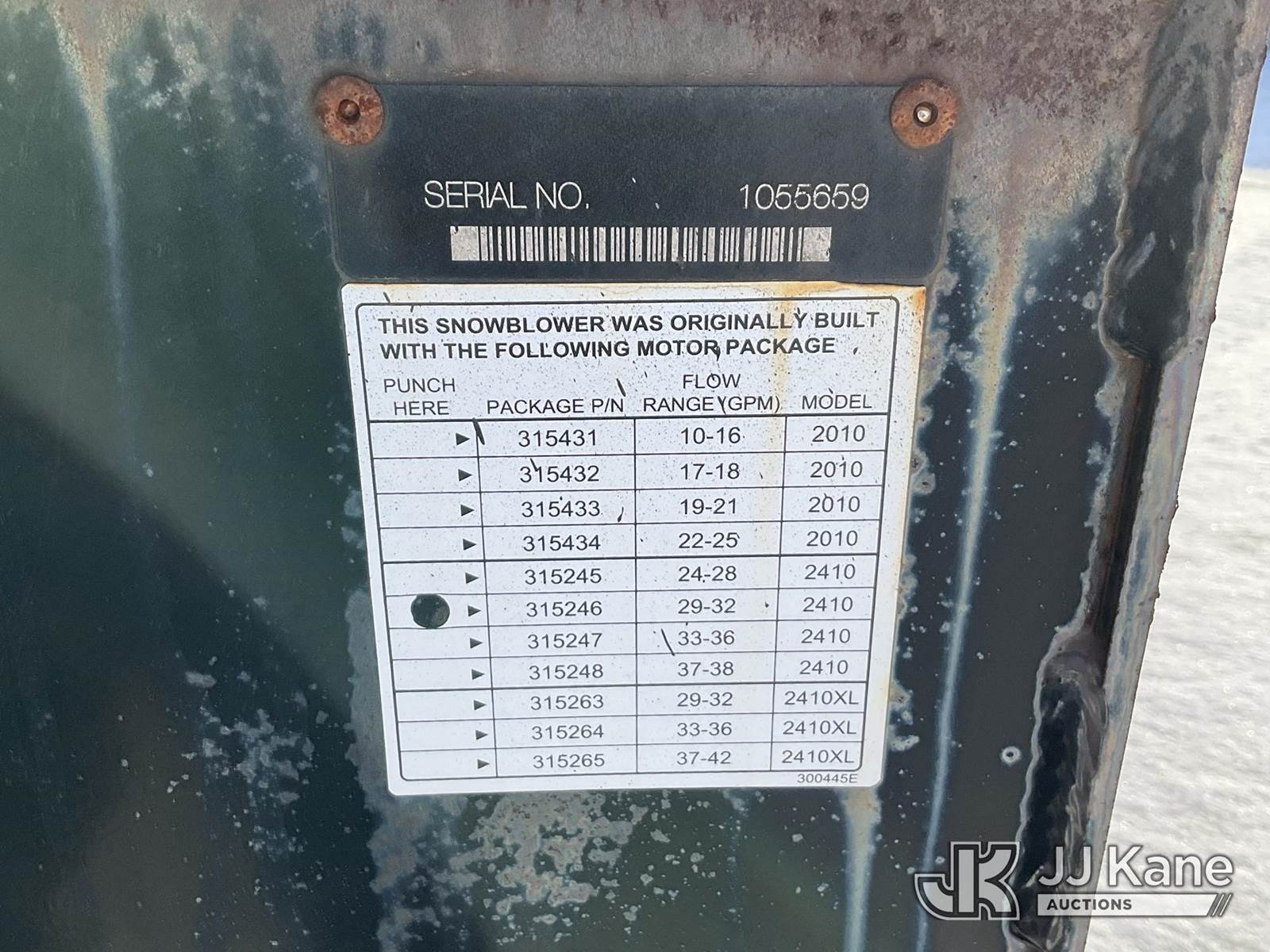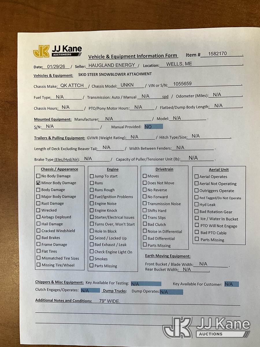Quick Attach Snow Blower Attachment, s/n 1055659 NOTE: This unit is being sold AS IS/WHERE IS via Timed Auction and is located in Wells, ME. Inspection & preview days for this unit are by appointment only; please contact us at contact@jjkane.com or 84-Go-JJKane for more details. (Buyer is responsible for removal. Assistance by consignor or JJ Kane Auctions is not assured.)
