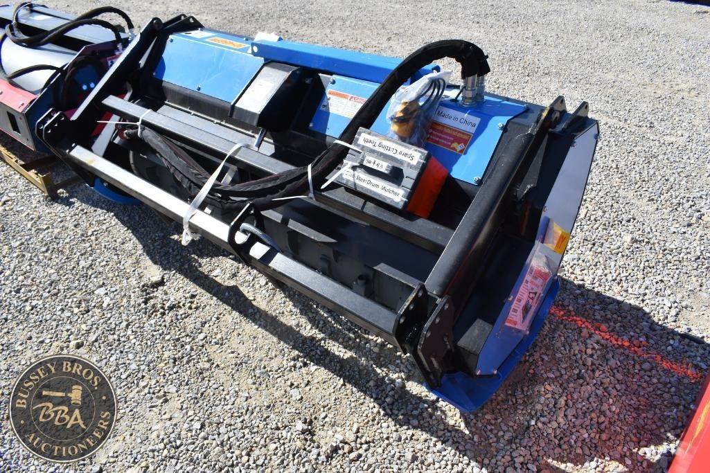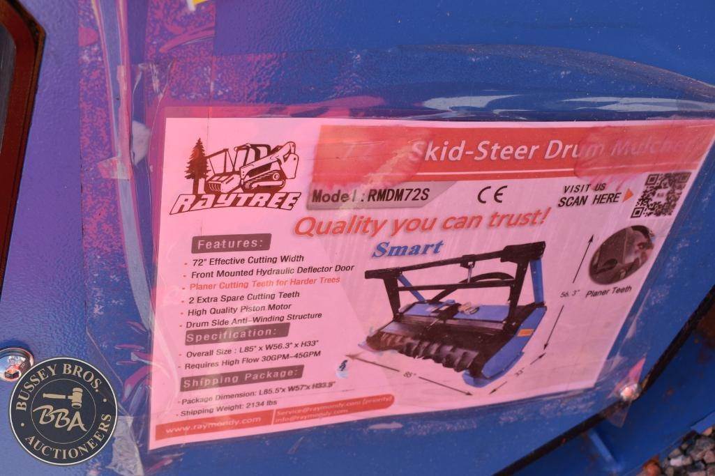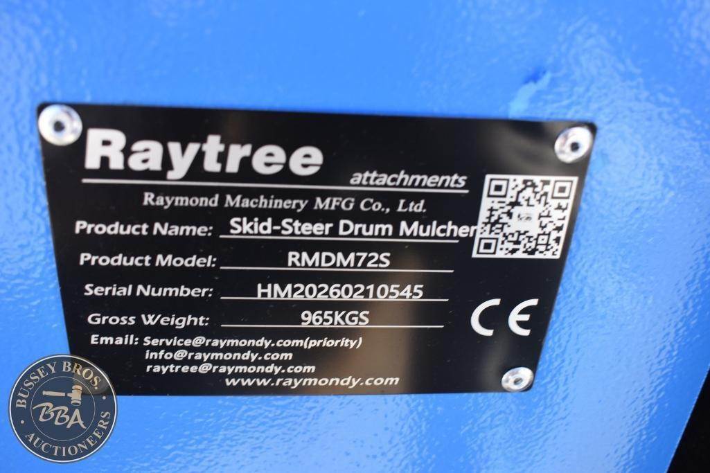 Raytree Drum Mulcher Attachment Skid Steer Mount, hydraulic, 72in eff cutting width, 2 spare cutting teeth, req high flow 30-45gpm, SN#HM20260210545, NEW/UNUSED
