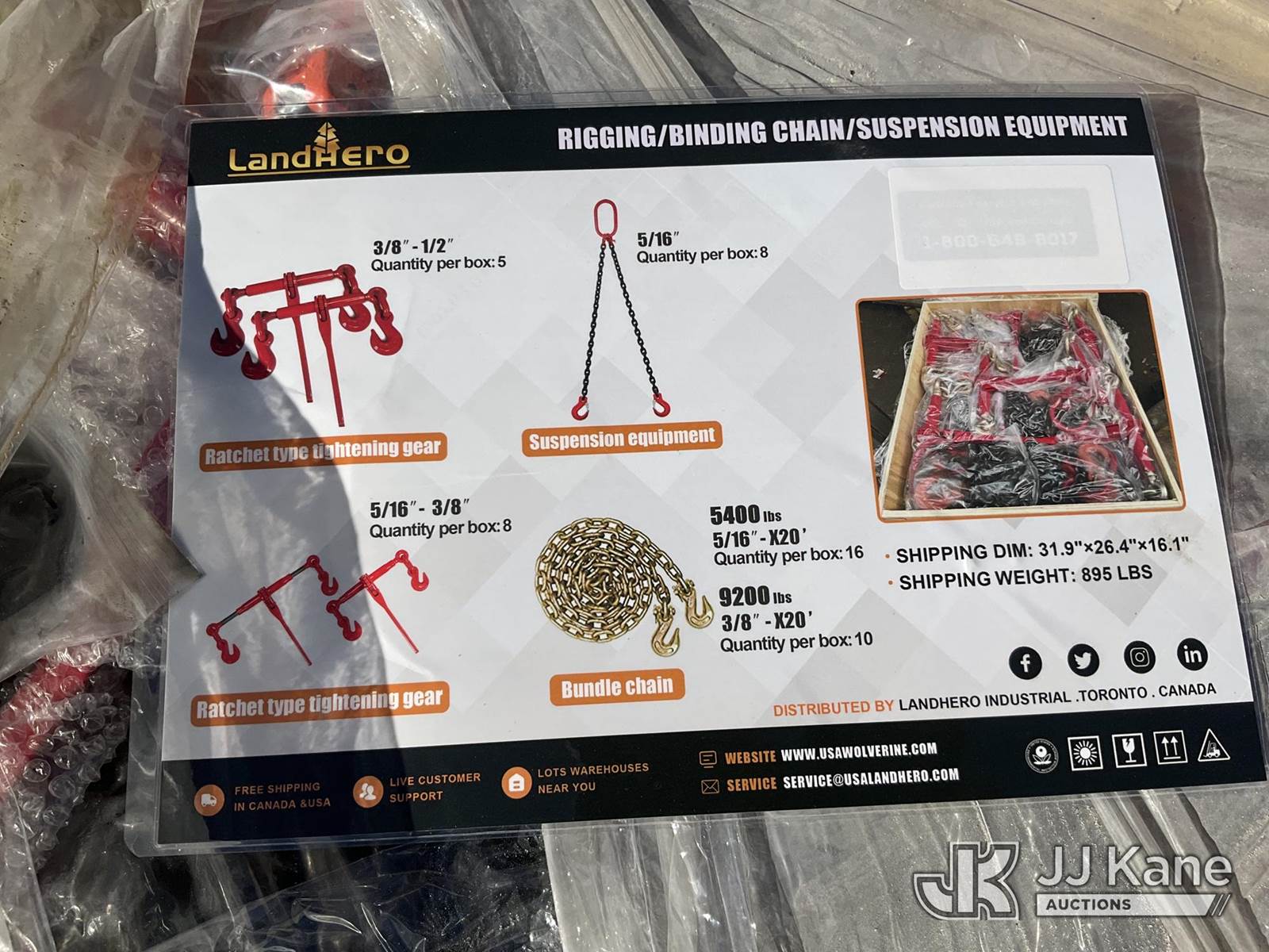 Rigging, Binding Chain, & Suspension Equipment: (5) 3/8"-1/2" Ratchet Type Tightening Gear, (8) 5/16"Suspension Equipment, (8) 5/16"-3/8" Ratchet Type Tightening Gear, (16) 5400lbs Bundle Chain, (10) 9200lbs Bundle Chain (New/Unused) NOTE: This unit is being sold AS IS/WHERE IS via Timed Auction and is located in Thonotosassa, FL. Inspection & preview days for this unit are the 2 business days prior to the first day of items closing for this auction, item is located at 11720 N US 301 Thonotosassa, Fl 33592 and hours of operations are 8a-4p. For pre-sale questions, please contact Office Staff @ (813) 986-2485. (Buyer is responsible for removal. Assistance by consignor or JJ Kane Auctions is not assured.)