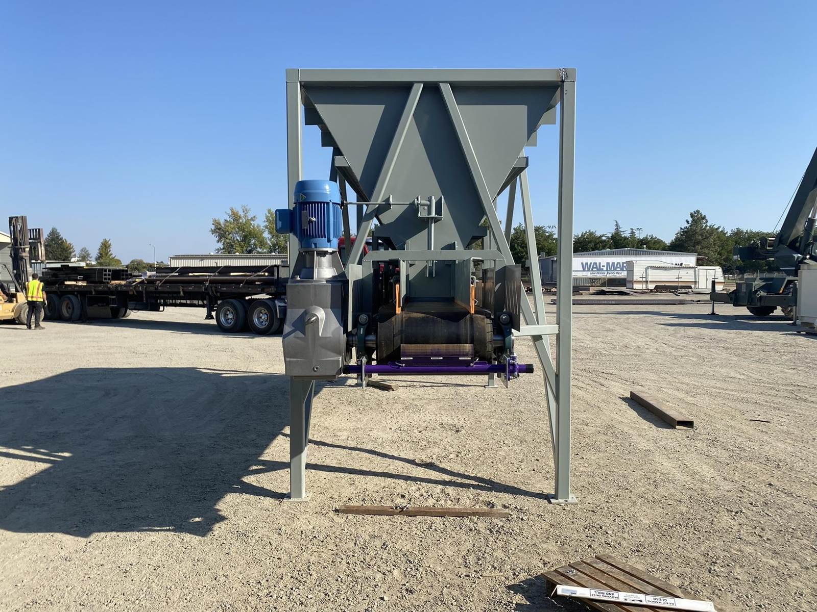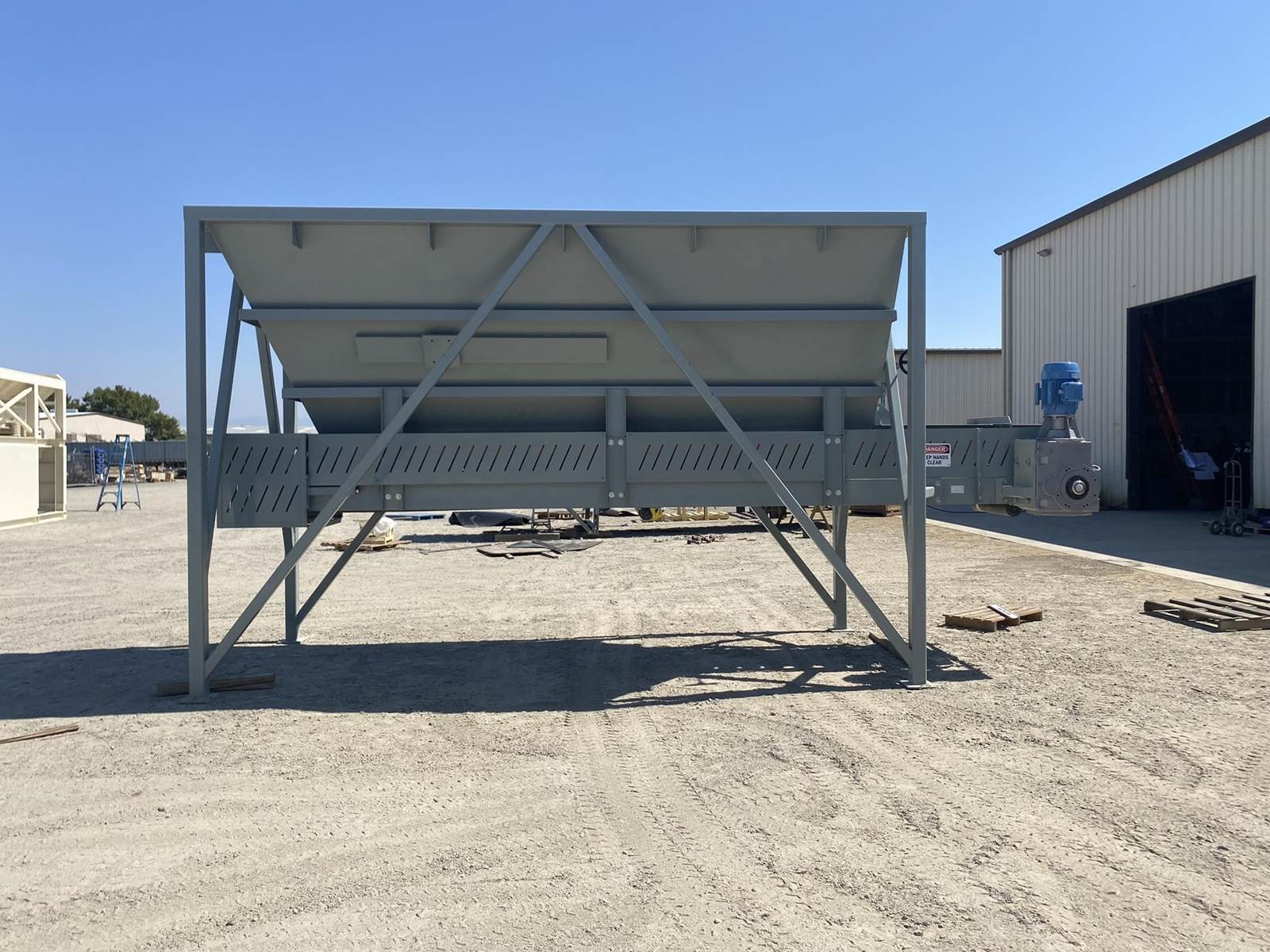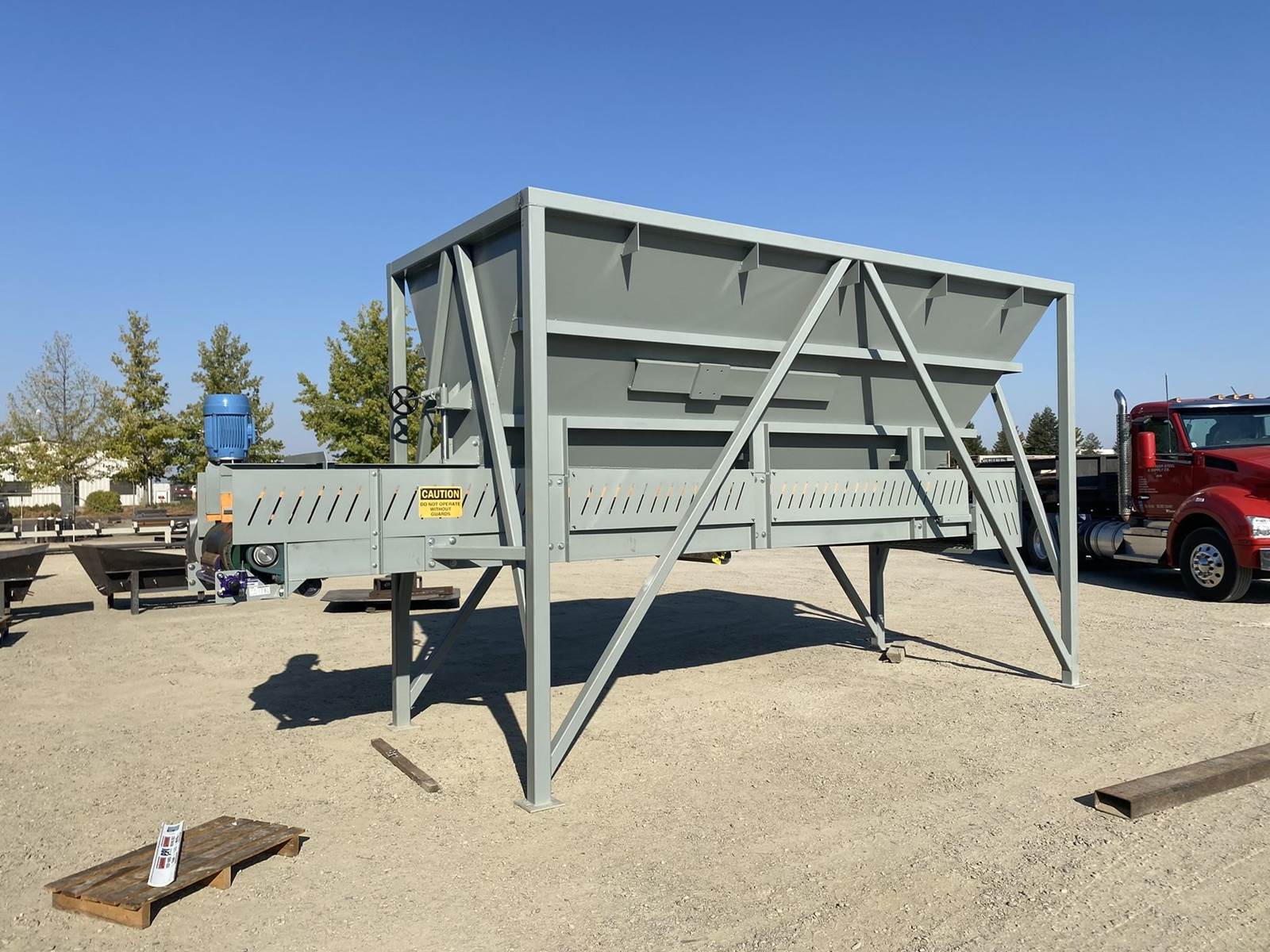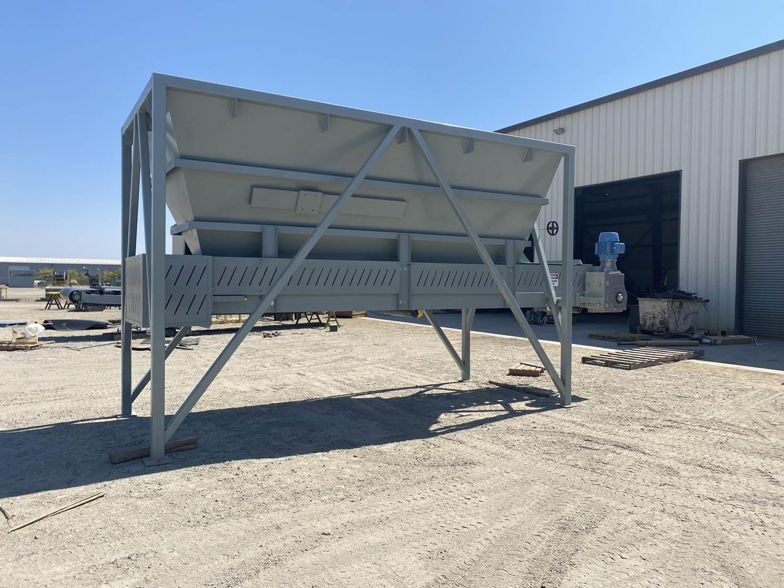 a. 6’-7" wide x 14’ long hopper opening constructed from 1/4” thick steel plate with square tube reinforcing at the hopper top and angle iron reinforcing at the hopper mid-section and bottom section; self-relieving tapered hopper bottom opening to minimize bridging; full length skirtboards with 3/4" x 6" adjustable rubber flashing to prevent leakage between hopper bottom and belt feeder; adjustable discharge gate with hand crank out the side to control material flow from the hopper.