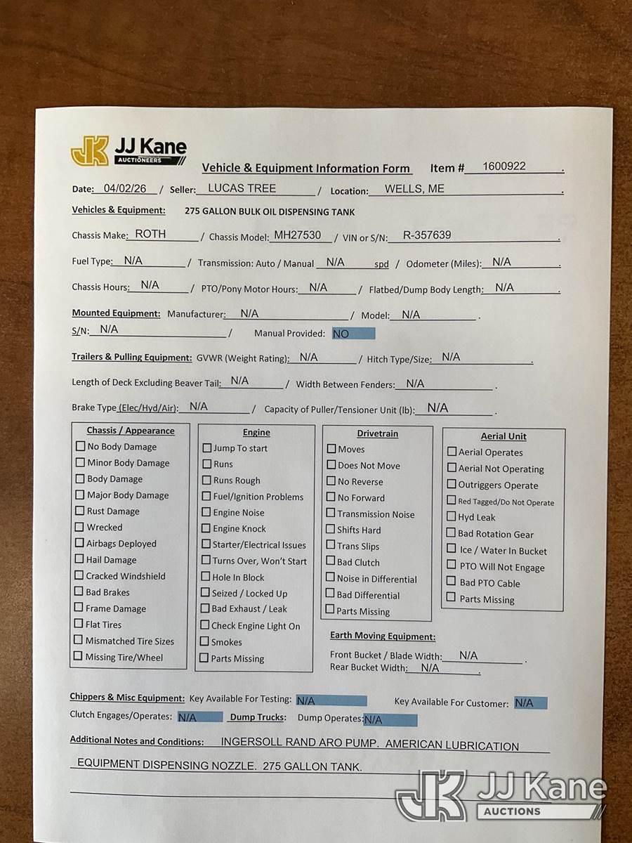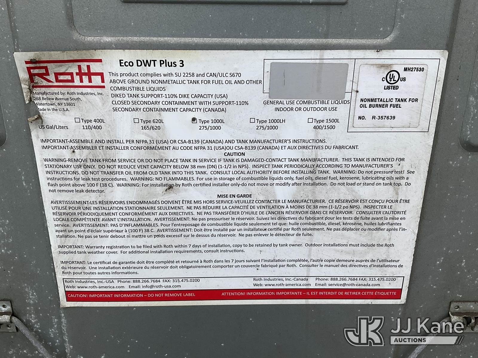 Roth 275-Gallon Non-Metallic Oil Tank, S/N R-357639 (Condition Unknown) NOTE: This unit is being sold AS IS/WHERE IS via Timed Auction and is located in Wells, ME. Inspection & preview days for this unit are by appointment only; please contact us at contact@jjkane.com or 84-Go-JJKane for more details. (Buyer is responsible for removal. Assistance by consignor or JJ Kane Auctions is not assured.)