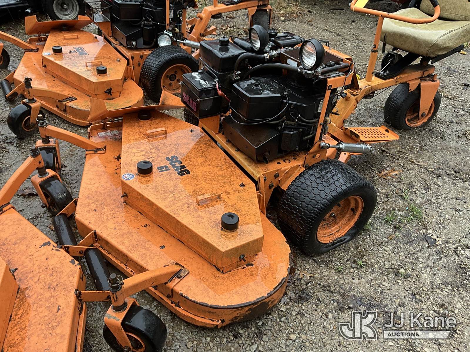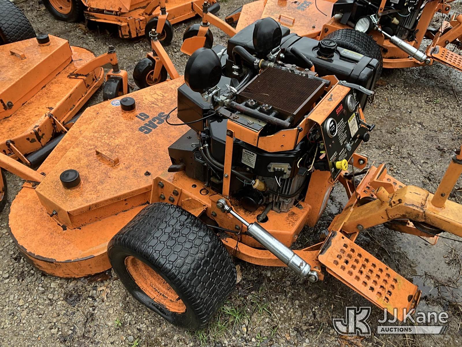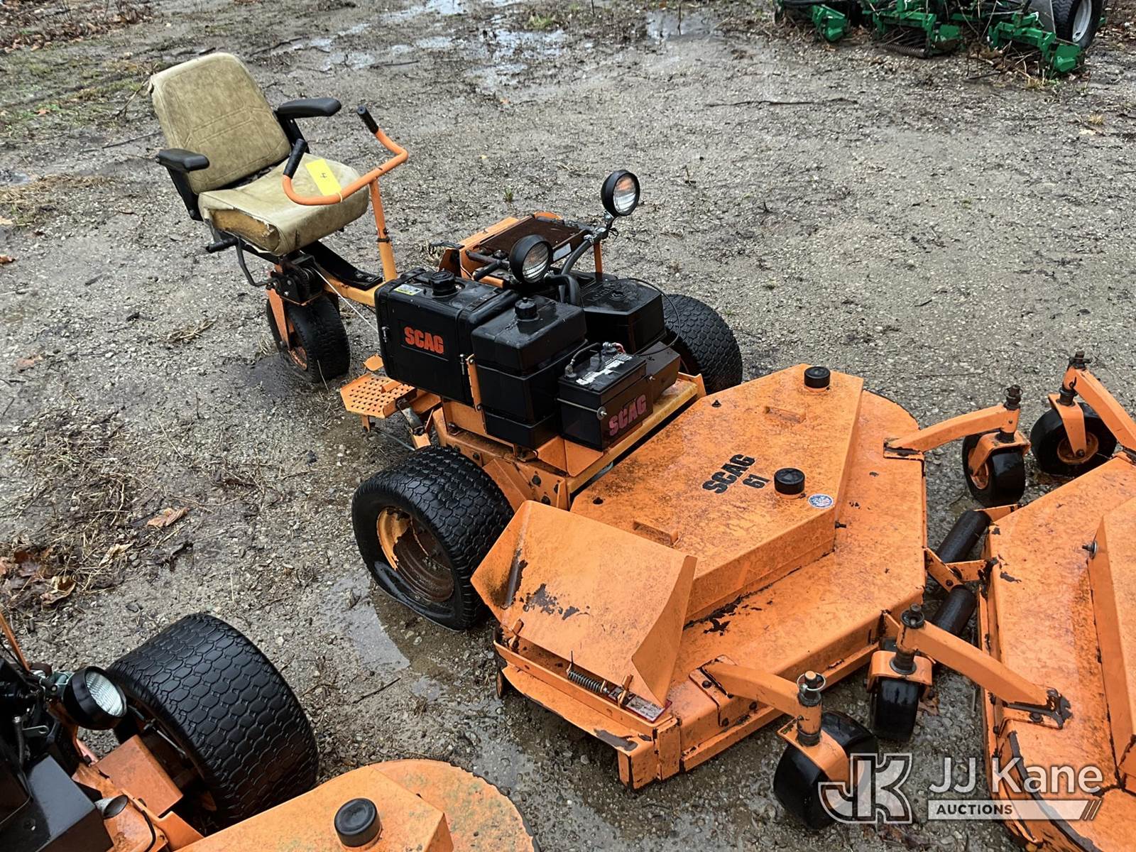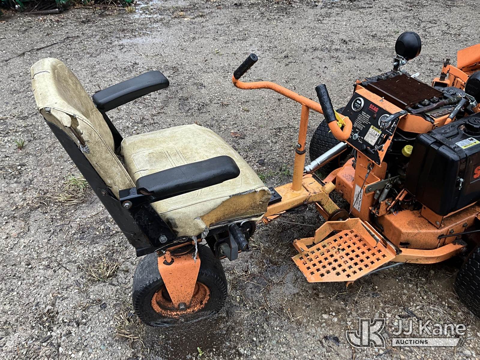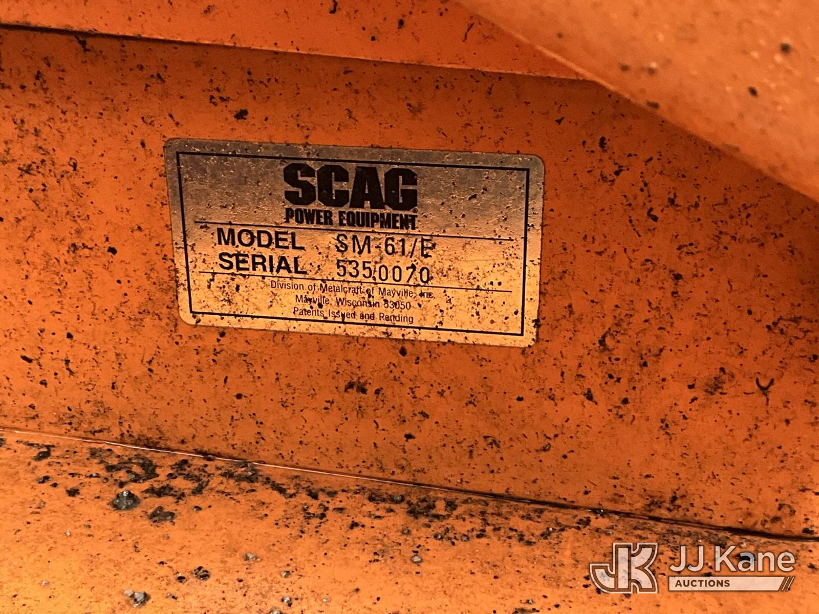 Scag SM 61/E Riding Mower, s/n 5350070, Kohler gas, Hydrostatic, (Not Running, Condition Unknown) (Buyer Must Load) (Reads 6,236 hours) NOTE: This unit is being sold AS IS/WHERE IS via Timed Auction and is located in Louisville, KY. For more information & removal arrangements please contact Spencer Owen @ 502-232-2541. Load Out will be by appointment only M-F; must call 24 HRS. in advance. Buyer/Hauler must present copy of paid invoice upon arrival. Purchaser acknowledges ALL lots must be removed within 5 business days of Auction, or a storage fee may be incurred. This item is used and may contain defects that are not immediately detectable. Text description and photos given are meant to be used as a guide only. The conditions are provided by the consignor; you are responsible for inspecting item before bidding. All information provided is believed to be correct but no warranty as such is either intended or implied. All items are sold AS IS - WHERE IS AND WITH ALL FAULTS AND DEFECTS THEREIN. Auctioneer Michael Whitebread / License # 256617 (Buyer is responsible for removal. Assistance by consignor or JJ Kane Auctions is not assured.)