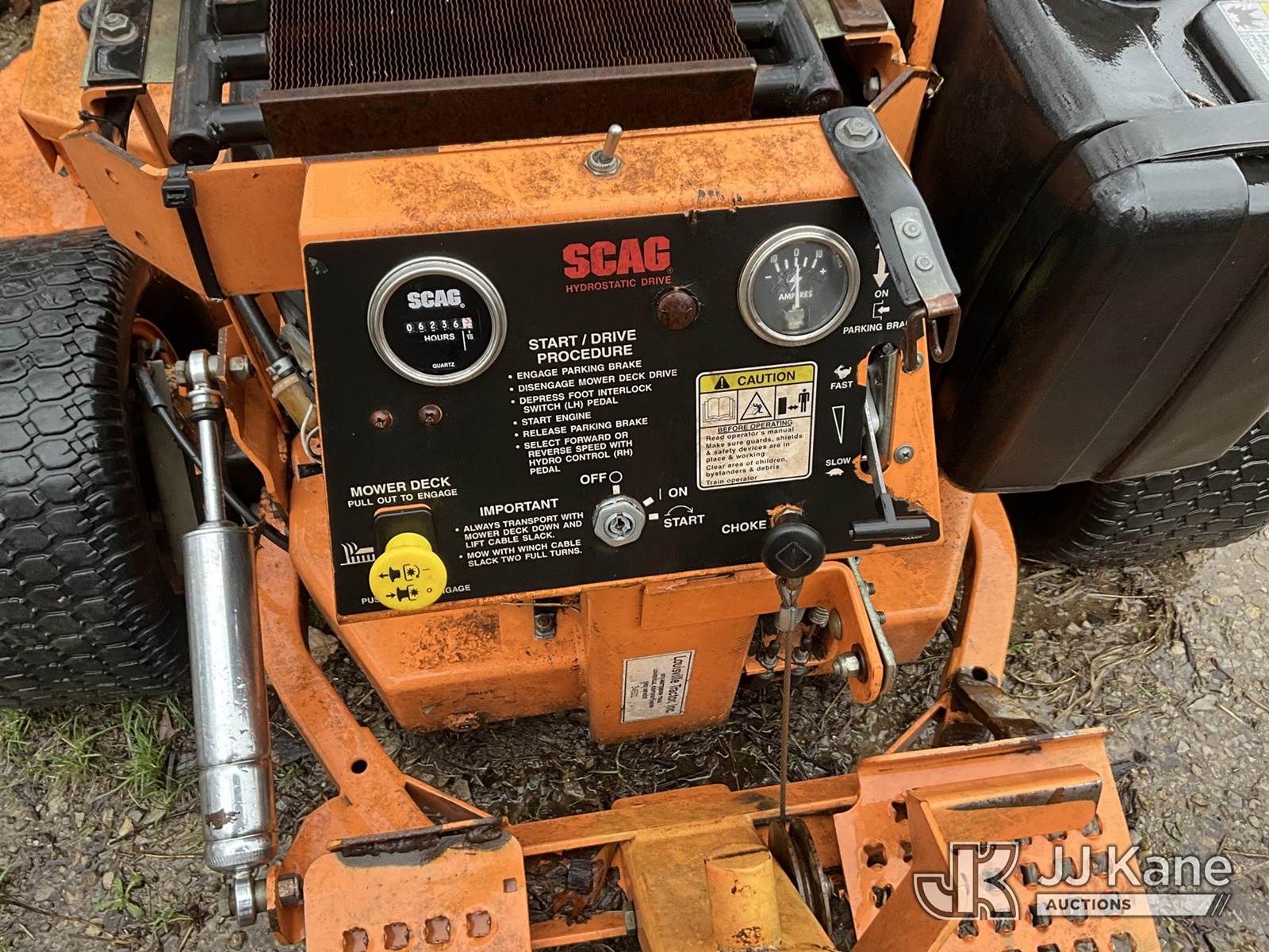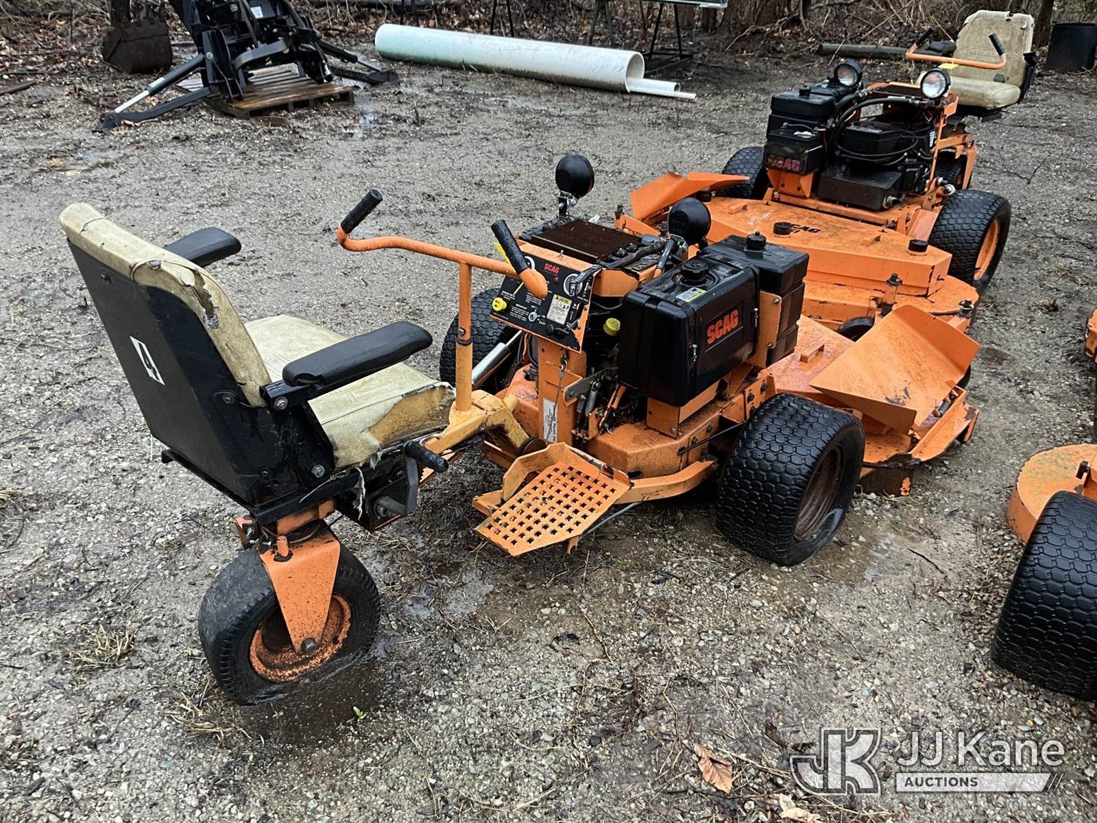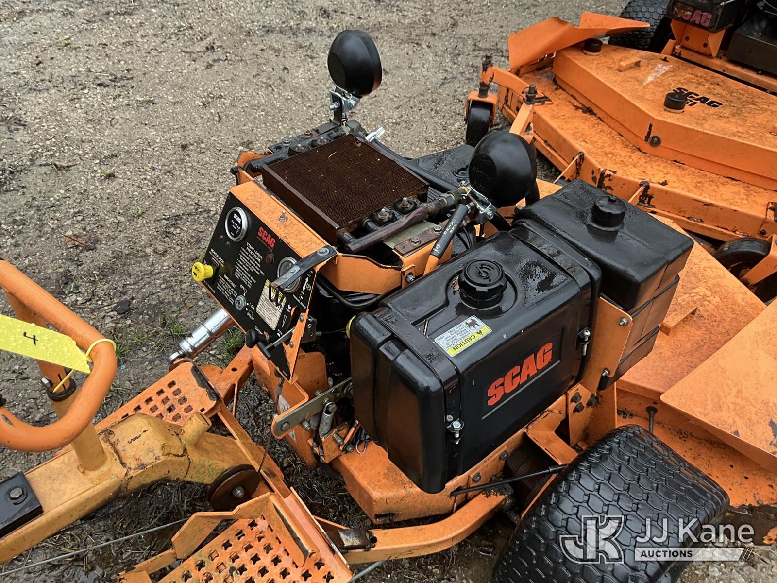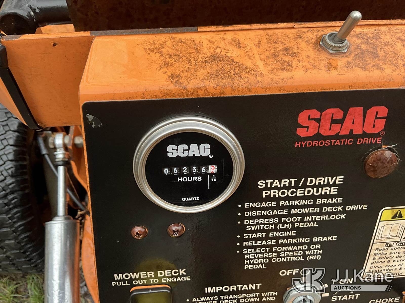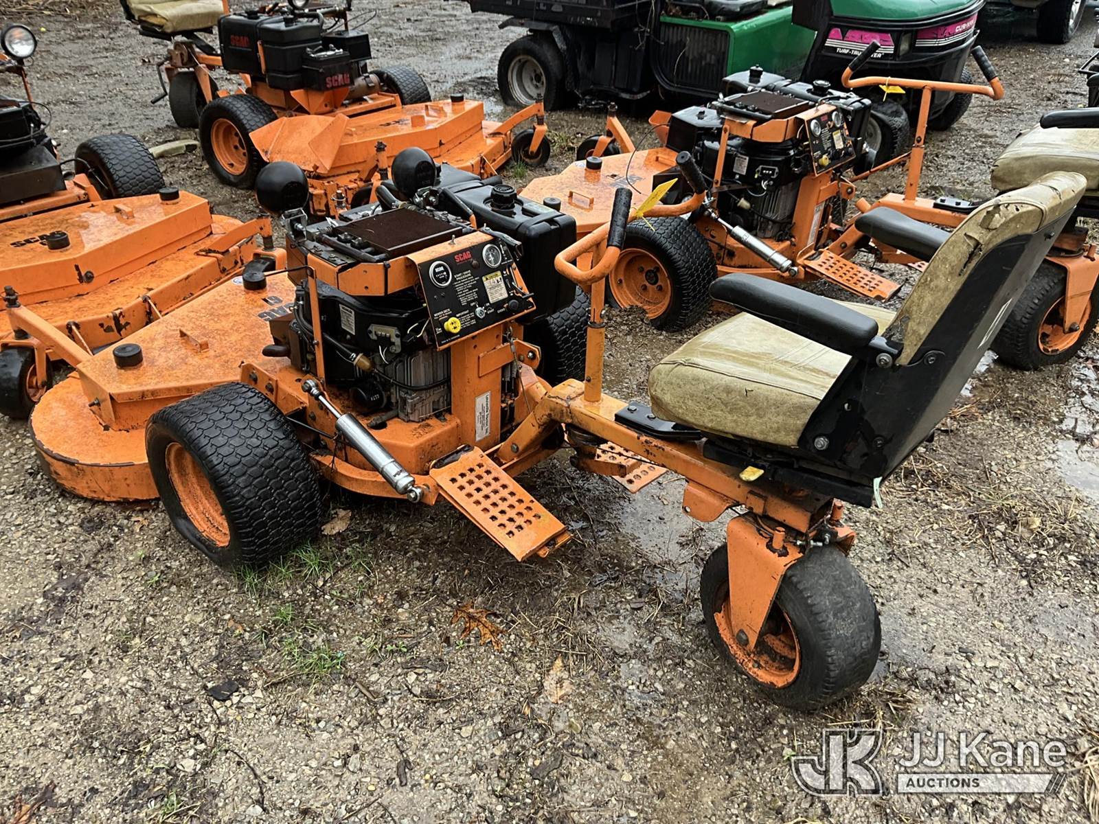 Scag SM 61/E Riding Mower, s/n 5350070, Kohler gas, Hydrostatic, (Not Running, Condition Unknown) (Buyer Must Load) (Reads 6,236 hours) NOTE: This unit is being sold AS IS/WHERE IS via Timed Auction and is located in Louisville, KY. For more information & removal arrangements please contact Spencer Owen @ 502-232-2541. Load Out will be by appointment only M-F; must call 24 HRS. in advance. Buyer/Hauler must present copy of paid invoice upon arrival. Purchaser acknowledges ALL lots must be removed within 5 business days of Auction, or a storage fee may be incurred. This item is used and may contain defects that are not immediately detectable. Text description and photos given are meant to be used as a guide only. The conditions are provided by the consignor; you are responsible for inspecting item before bidding. All information provided is believed to be correct but no warranty as such is either intended or implied. All items are sold AS IS - WHERE IS AND WITH ALL FAULTS AND DEFECTS THEREIN. Auctioneer Michael Whitebread / License # 256617 (Buyer is responsible for removal. Assistance by consignor or JJ Kane Auctions is not assured.)