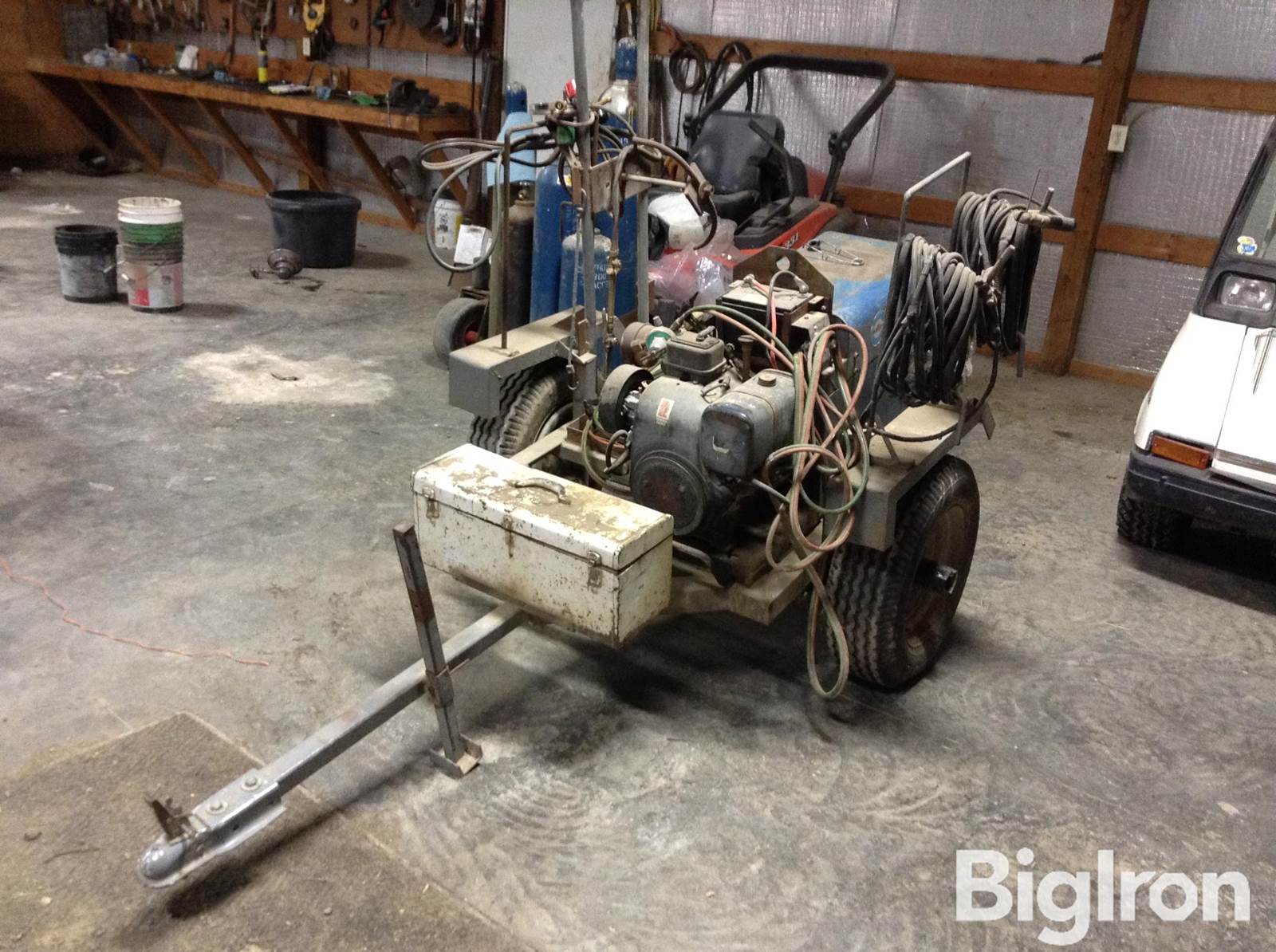 Service Trailer w/ Miller Welder-Generator, Miller Bluestar 2E DC arc welder generator w/ Tecumseh gas engine, 110 power outlets, Torch handles & gauges (no bottles included), Front toolbox, 2" ball hitch, 7-14.5 LT tires on 5-bolt wheels.