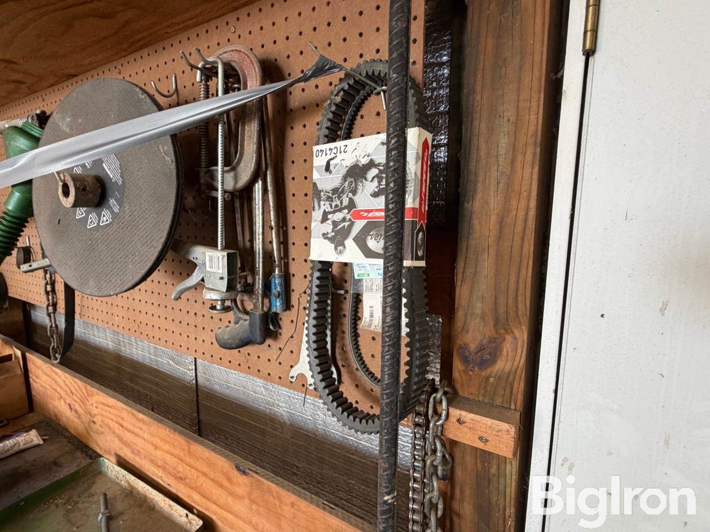 Shop Bench Supplies and Tools, Includes all tool on bench top and back wall. Belts, Air impact wrench, DeWalt drill, Tape measure, small parts bin, Filter wrenches, HIT bench-top vice, and much more. See photos for details, all sells as one lot.