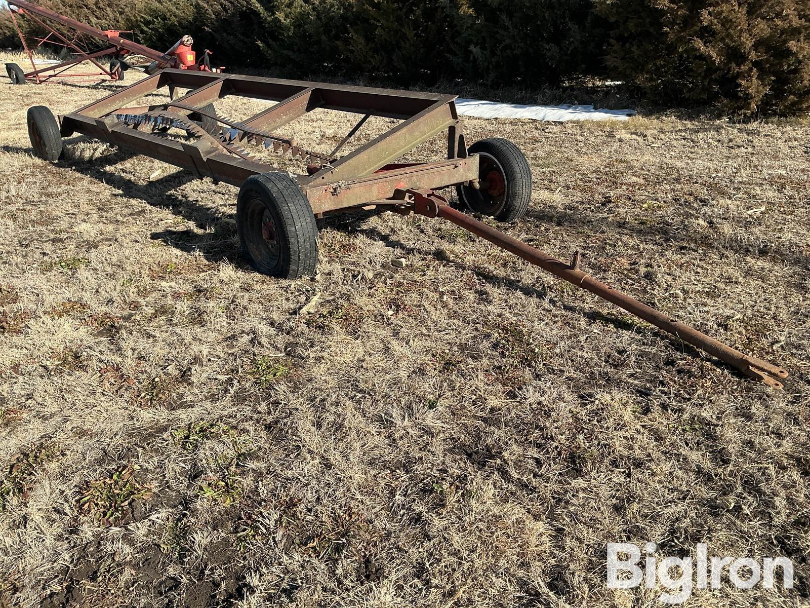 Shop Built 16’ 4-wheel header trailer, B Lime running gear, Pin hitch with slide out tongue, 14” tires, appr 16’ x 4 1/2’ cradle, adjustable saddle bracket landing pads, rear hitch, includes 4 sickles
