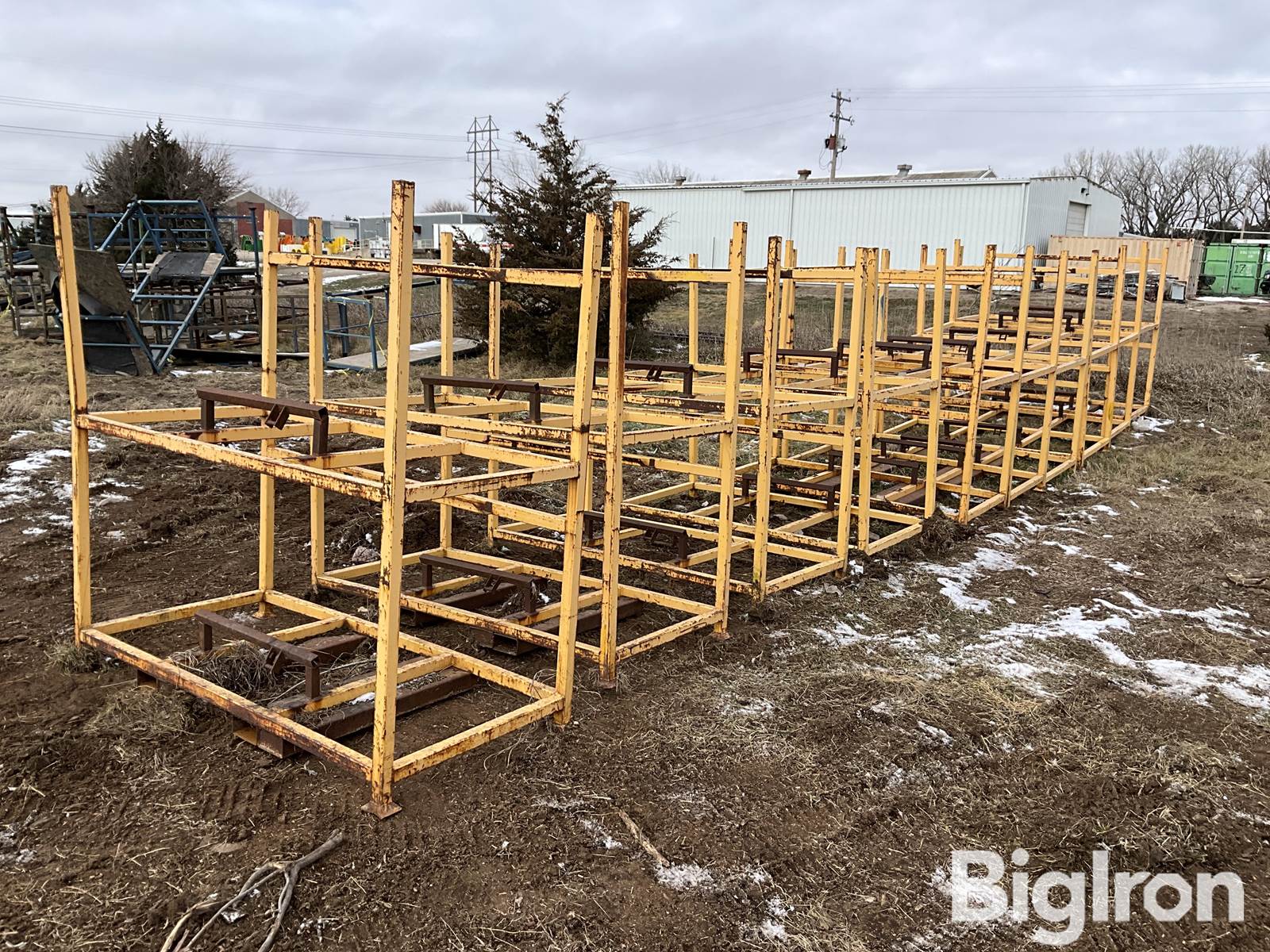 Shop Built 38”x80” Steel Shelving, Qty: 10, 2”X2” Square Tubing Frame, 75” Overall Height, 35” Shelf Spacing, Bottom Fork Skids, Stackable, Note: 1 Has Bent Leg
