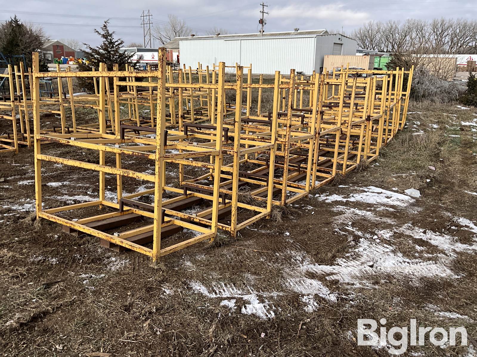Shop Built 38”x80” Steel Shelving, Qty: 10, 2”X2” Square Tubing Frame, 75” Overall Height, 35” Shelf Spacing, Bottom Fork Skids, Stackable.