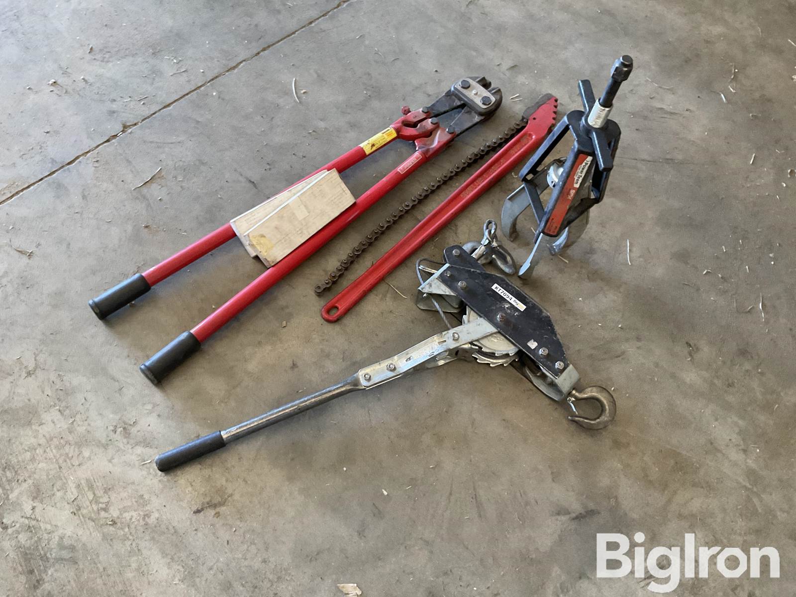 Shop Tools, (1) Come-along, (1) Pulley Puller, Large Bolt Cutters, Chain wrench