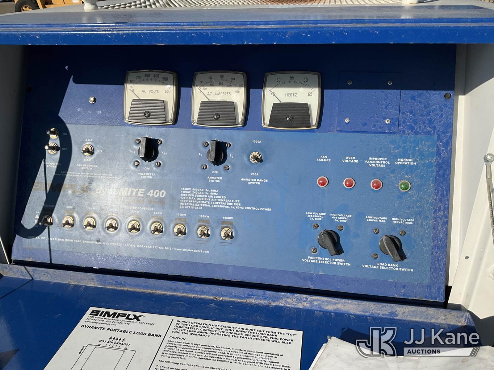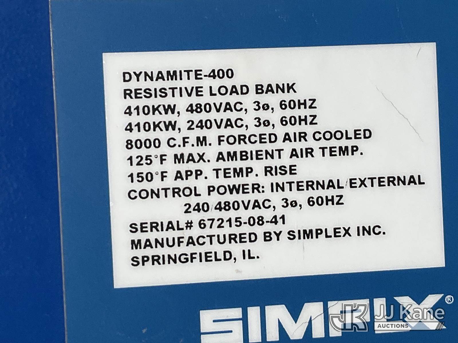 Simplx Dynamite 400 Load Bank NOTE: This unit is being sold AS IS/WHERE IS via Timed Auction and is located in Salt Lake City, UT. Inspection & preview days for this unit are the 2 business days prior to the first day of items closing for this auction, item is located at 2353 N Redwood Rd Salt Lake City, UT 84116 and hours of operations are 8a-4p. Titles executed exactly as bidder registered. Ensure your name and/or business name and address in JJ Kane and/or ProxiBid is correct before bidding. For pre-sale questions, please contact Office Staff @ (801) 519-0123. (Buyer is responsible for removal. Assistance by consignor or JJ Kane Auctions is not assured.)