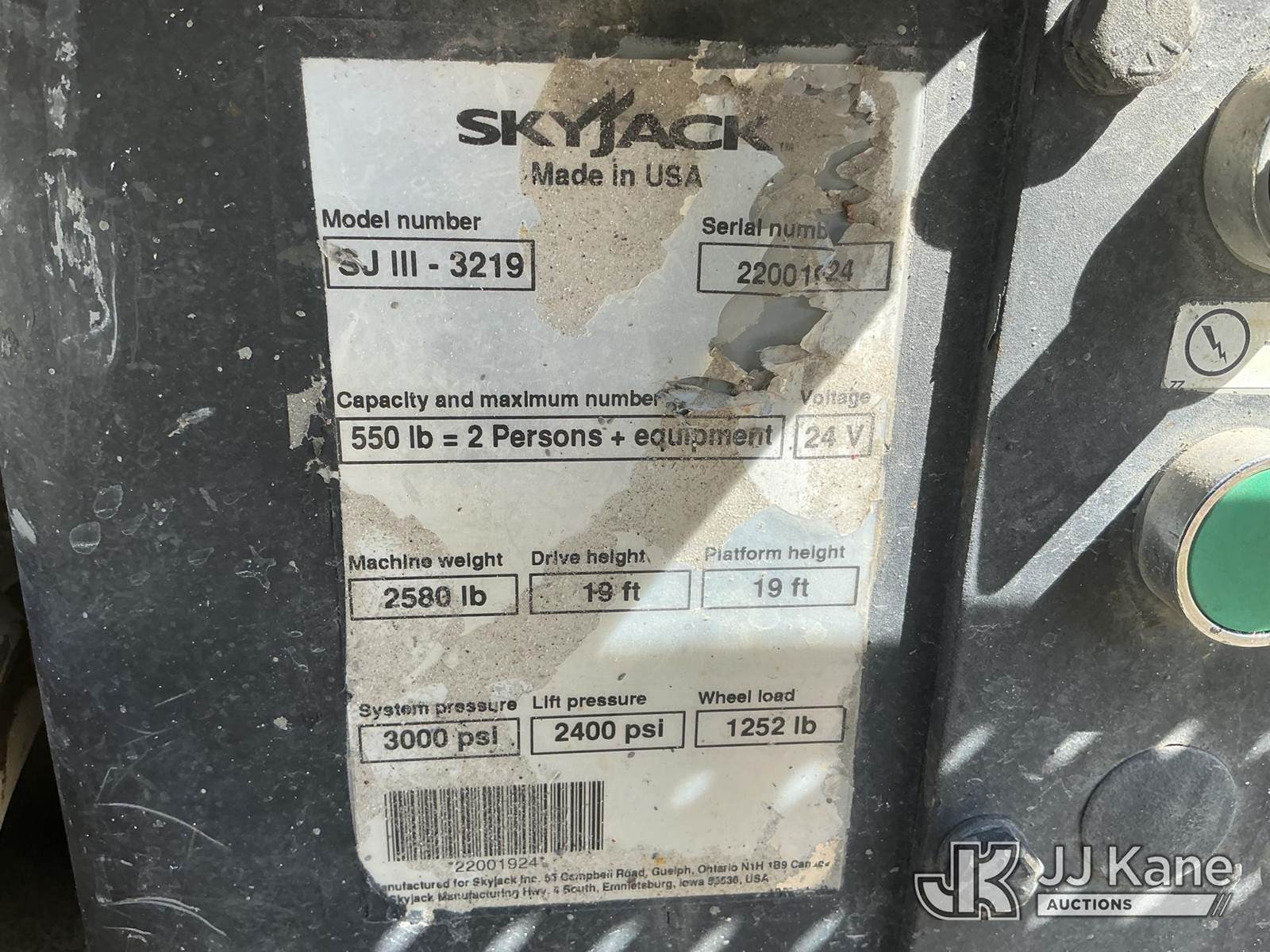 SkyJack SJIII-3219 19 Foot Self-Propelled Scissor Lift, s/n 22001924, 24v electric, Hydrostatic, (Runs, Moves & Operates) (No Key Needed) (Remote In Office) NOTE: This unit is being sold AS IS/WHERE IS via Timed Auction and is located in Thonotosassa, FL. Inspection & preview days for this unit are the 2 business days prior to the first day of items closing for this auction, item is located at 11720 N US 301 Thonotosassa, Fl 33592 and hours of operations are 8a-4p. For pre-sale questions, please contact Office Staff @ (813) 986-2485. (Buyer is responsible for removal. Assistance by consignor or JJ Kane Auctions is not assured.)