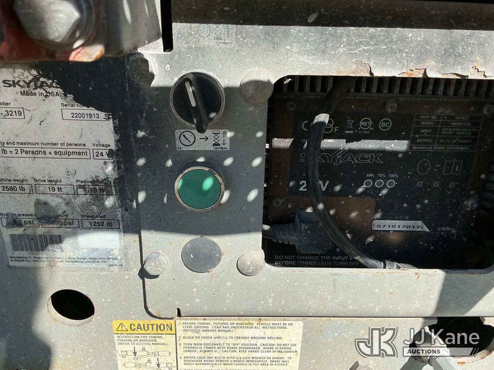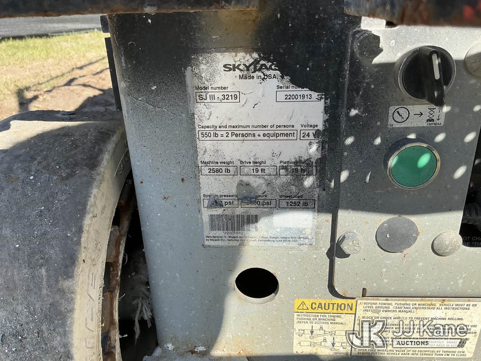 SkyJack SJIII-3219 19 Foot Self-Propelled Scissor Lift, s/n 22001913, 24v electric, Hydrostatic, (Runs, Moves & Operates) (No Key Needed) (Remote In Office) NOTE: This unit is being sold AS IS/WHERE IS via Timed Auction and is located in Thonotosassa, FL. Inspection & preview days for this unit are the 2 business days prior to the first day of items closing for this auction, item is located at 11720 N US 301 Thonotosassa, Fl 33592 and hours of operations are 8a-4p. For pre-sale questions, please contact Office Staff @ (813) 986-2485. (Buyer is responsible for removal. Assistance by consignor or JJ Kane Auctions is not assured.)