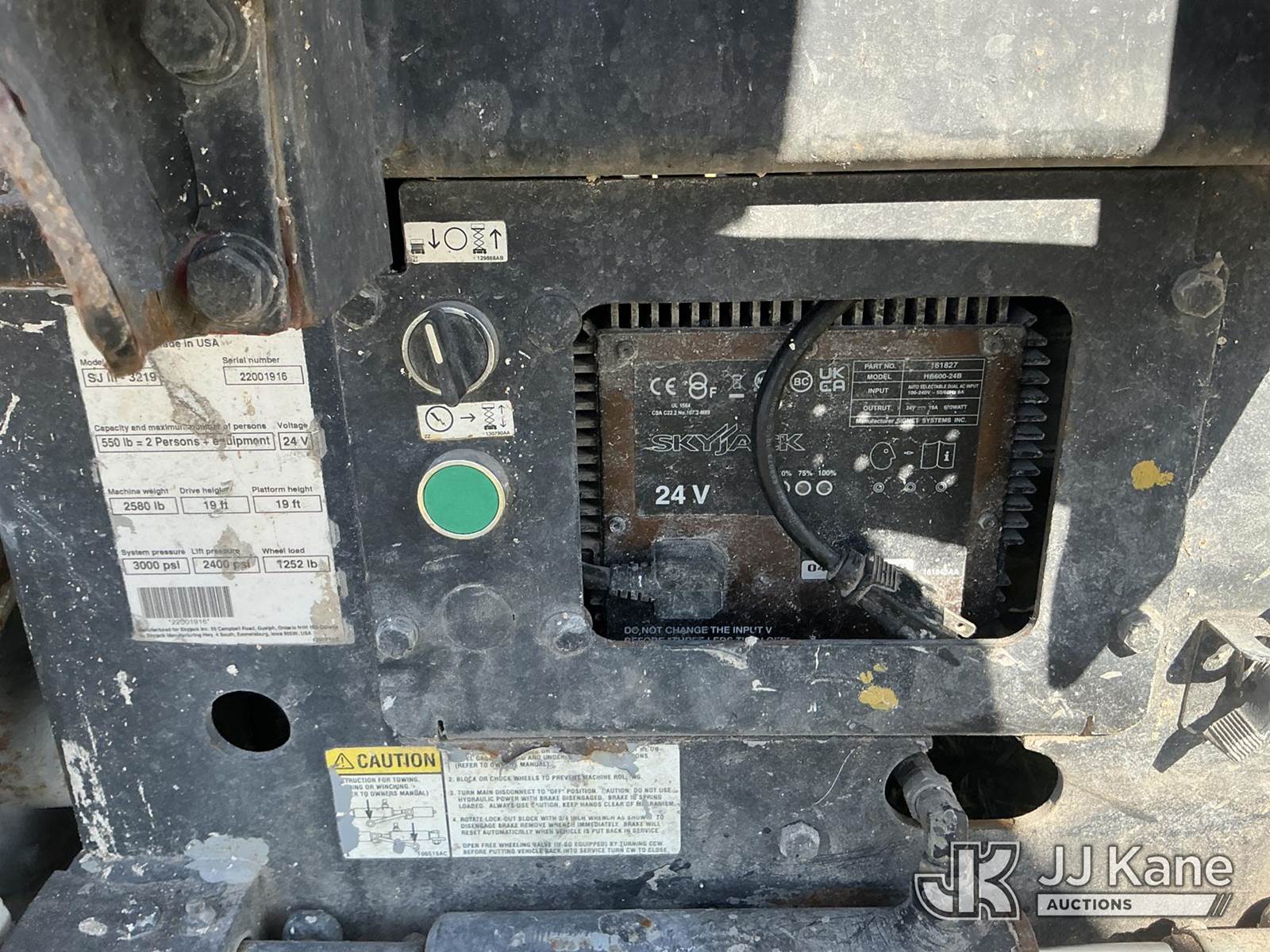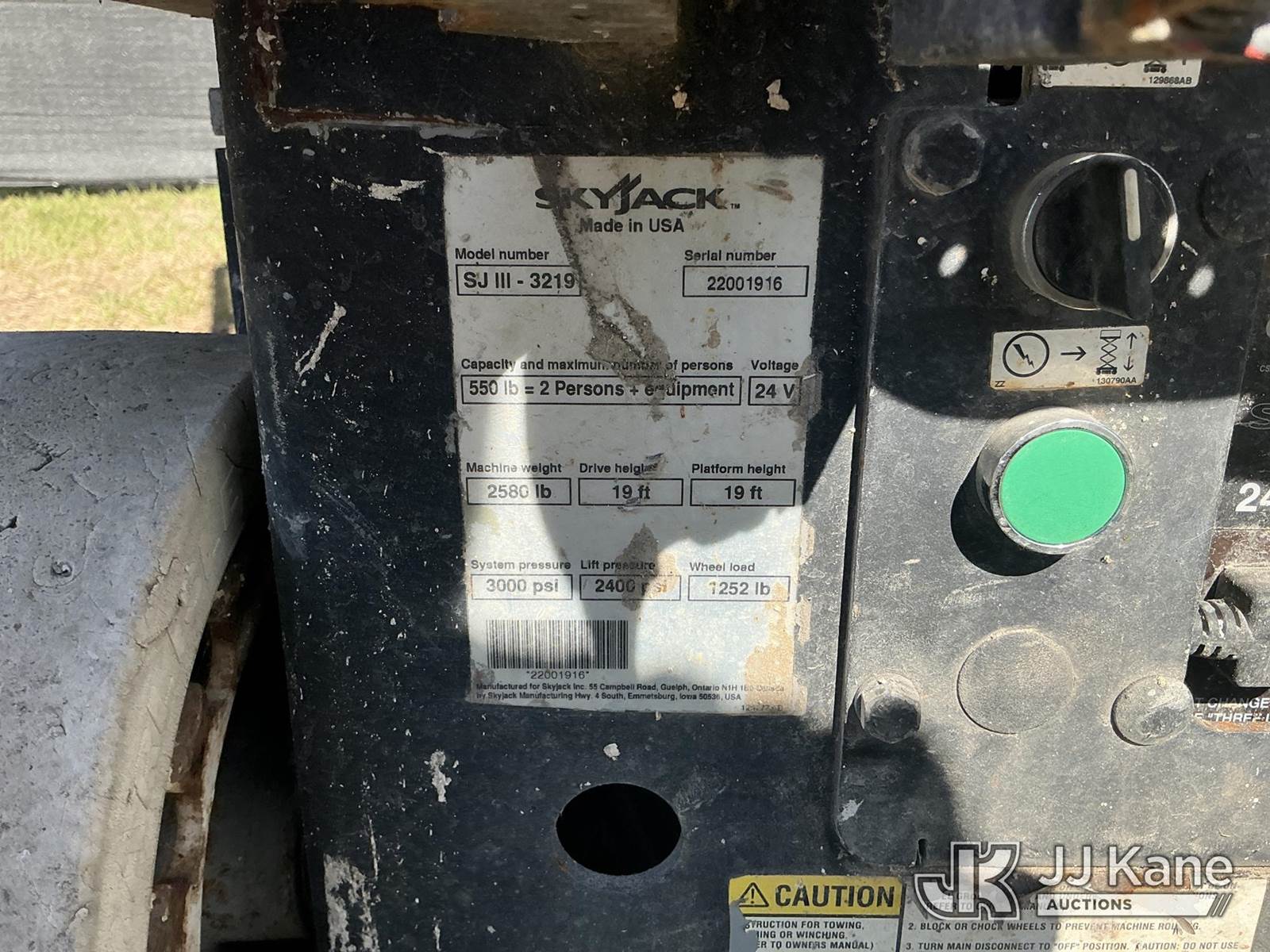 SkyJack SJIII-3219 19 Foot Self Propelled Scissor Lift, s/n 22001916, 24v electric, Hydrostatic, (Runs, Moves & Operates) (No Key Needed) (Remote In Office) NOTE: This unit is being sold AS IS/WHERE IS via Timed Auction and is located in Thonotosassa, FL. Inspection & preview days for this unit are the 2 business days prior to the first day of items closing for this auction, item is located at 11720 N US 301 Thonotosassa, Fl 33592 and hours of operations are 8a-4p. For pre-sale questions, please contact Office Staff @ (813) 986-2485. (Buyer is responsible for removal. Assistance by consignor or JJ Kane Auctions is not assured.)